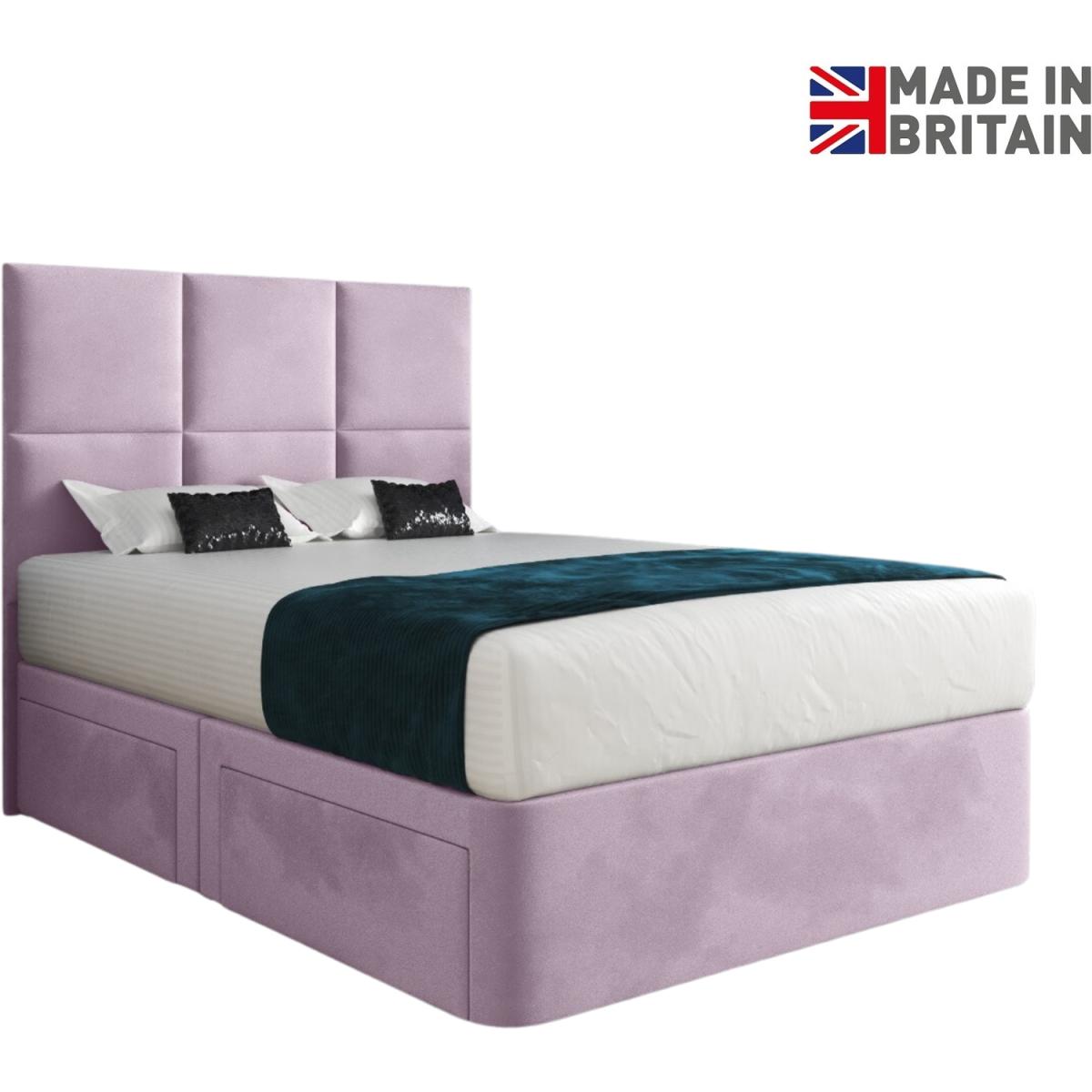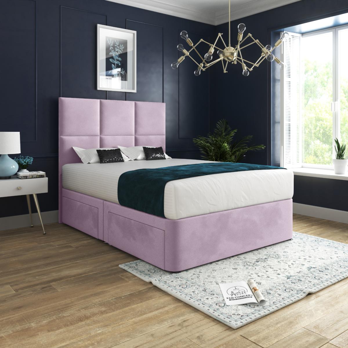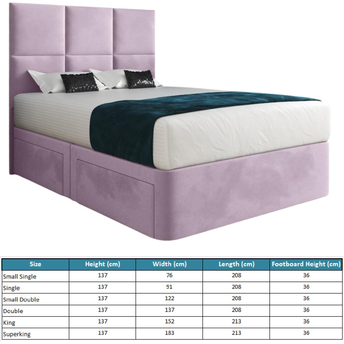 Cube design floorstanding headboard with a classic divan base. Divan base comes equipped with chrome gliders and optional drawer configurations can be chosen for an added storage solution. The floorstanding headboard is solid and easy to affix to the base. Aesthetically clean and sleek with a contemporary cube panel design.