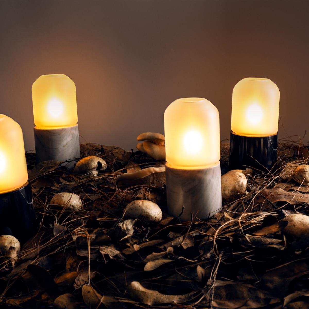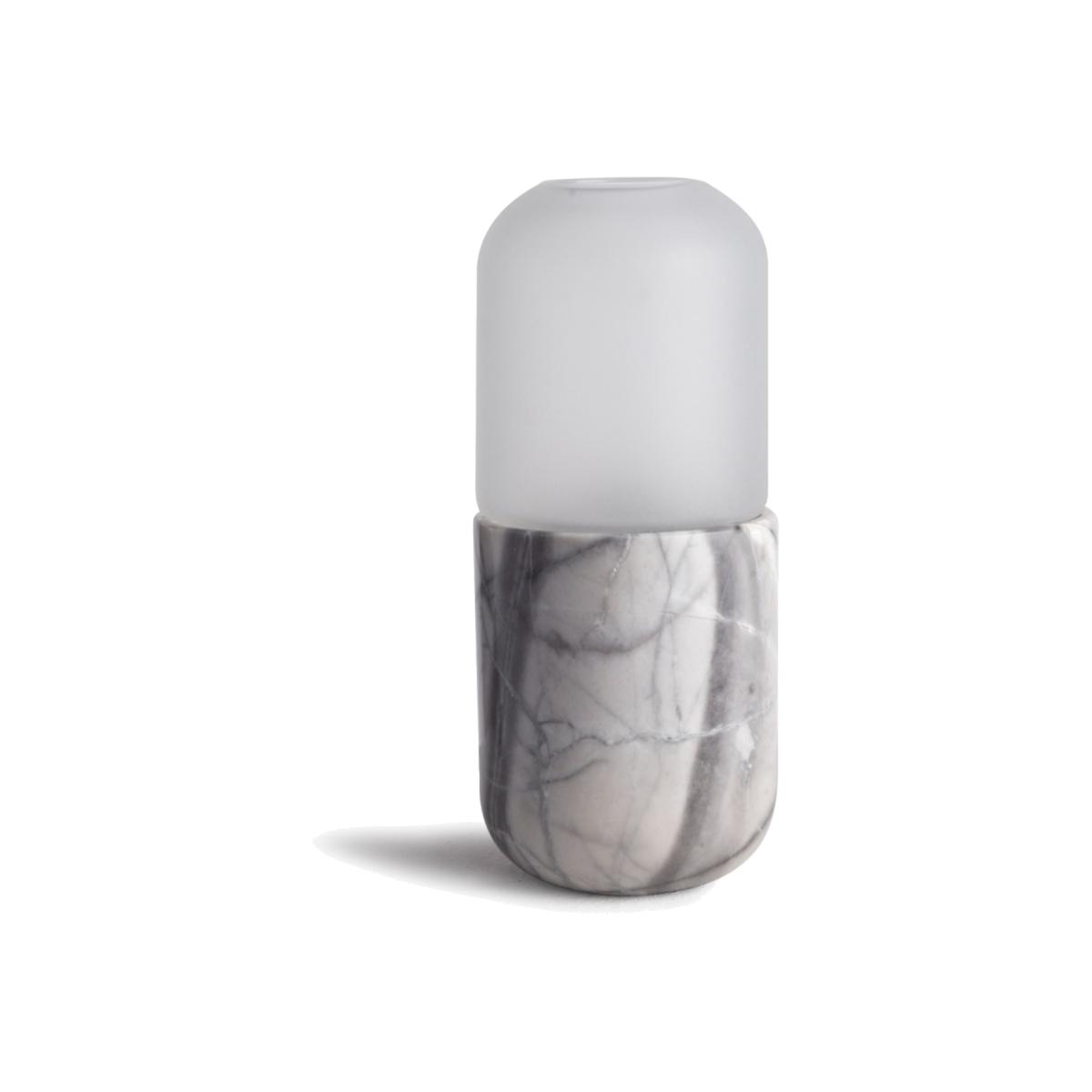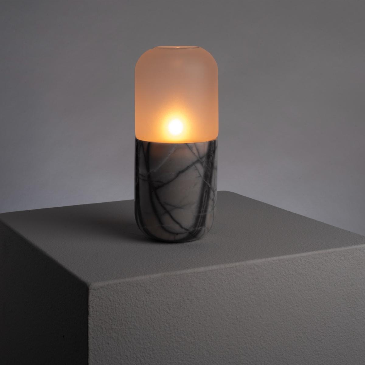 This is a very clever decorative candle holder, simulates a capsule, the lower part comes out of a solid block of marble where a jumbo tealight candle easy to replace rests, the upper part is a frosted borosilicate glass that has the function of a shade, keeping the light from the flame diffused and protected from gusts of wind. This candle just makes a beautiful, clean and comfortable atmosphere.
