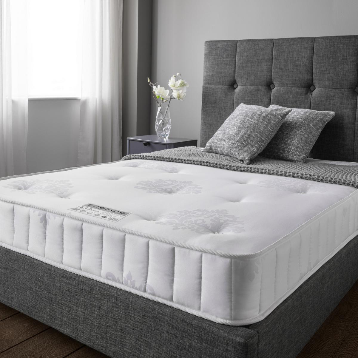 The Capsule Essentials Mattress offers a 13.5 gauge bonnell spring unit with a 900 gauge Saturn Pad Insulator pad and 300. G polyester pad filling to ensure you get the best night's sleep. Finished in a soft touch Damask fabric with a quilted border and hand tufted felt washers, this mattress is made to suit everyone. Available in a single, double and king size, the Essentials Mattress is part of the Capsule Mattress Collection.