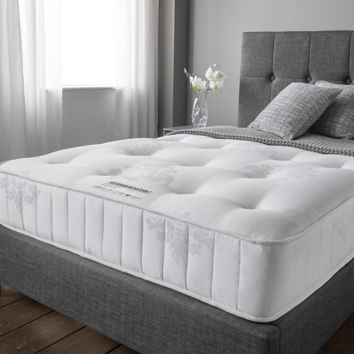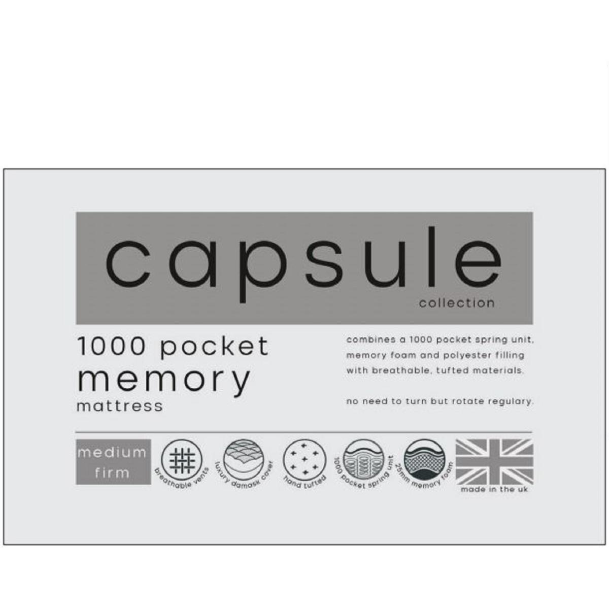 The Capsule Memory Pocket Mattress offers supreme comfort, featuring a 1000 Pocket Spring unit topped with 25mm of Memory Foam, Finished in a luxury damask fabric, hand tufted with felt washers and air vents to increase air flow and breathability. Available in 135cm, 150cm and 180cm sizes, this mattress is part of the Capsule Mattress Collection.