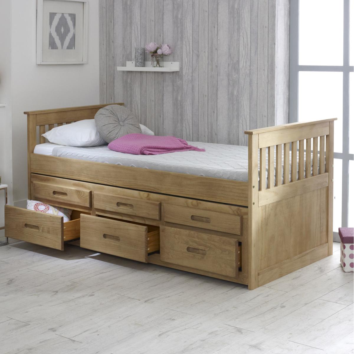 Experience the convenience and versatility of the Captains Underbed. It offers a stylish and functional combination of a guest bed and ample storage space. Crafted from responsibly sourced Brazilian pine, this underbed provides a reliable and sustainable solution. With three generously sized drawers, you can easily organize and store your belongings. The inclusion of four casters ensures effortless mobility and hassle-free storage. Rest assured, the kiln-dried solid pine slats offer exceptional durability and stability, providing a sturdy bed frame for a comfortable night's sleep. Upgrade your space with the Captain's Underbed and enjoy the convenience of a guest bed and ample storage in one stylish piece. If you have any further inquiries, please feel free to ask!
