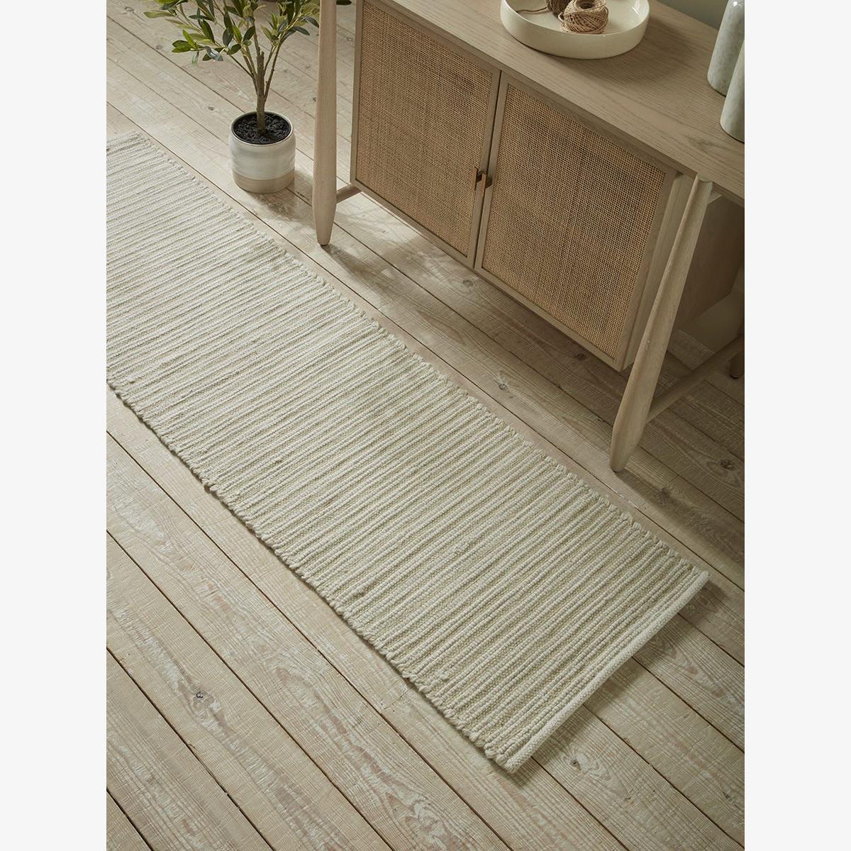 A simple but stylish runner defined by a textural stripe of raised white wool knots against a background of natural warm toned jute. This handwoven rug will transform the underfoot feel of hard flooring in hallways and corridors, while the neutral colour will lend itself to any scheme.