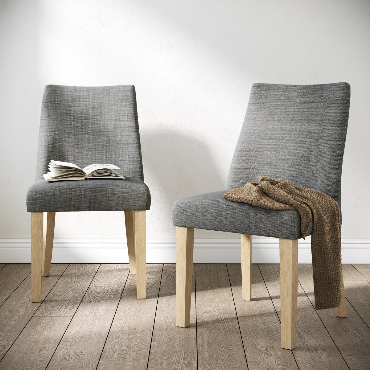 * Modern, oak frame* Soft upholstery* High back* Easy to assemble These chairs feature a contemporary design with a sleek, padded seat and backrest covered in luxurious and soft fabric, offering exceptional comfort and style. The sturdy frame ensures lasting durability, while the elegant fabric adds a touch of sophistication to your dining area. Please note we are unable to deliver this item to Northern Ireland.