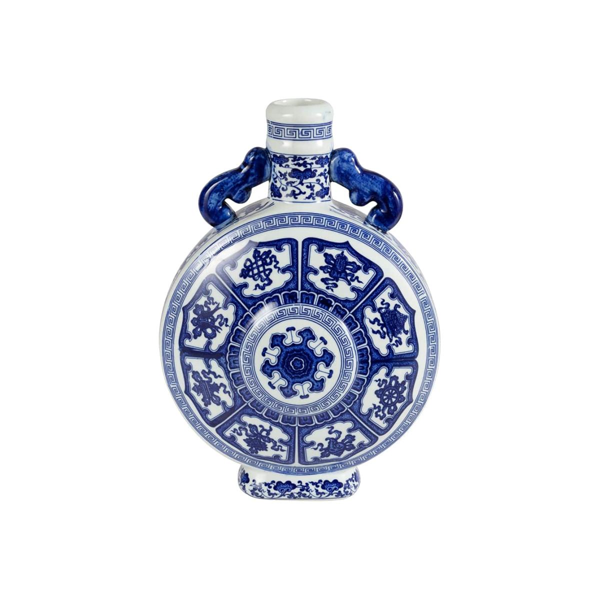 This elegant blue and white porcelain vase showcases a striking circular medallion design, surrounded by intricate floral patterns. Classic look that adds sophistication to any room
