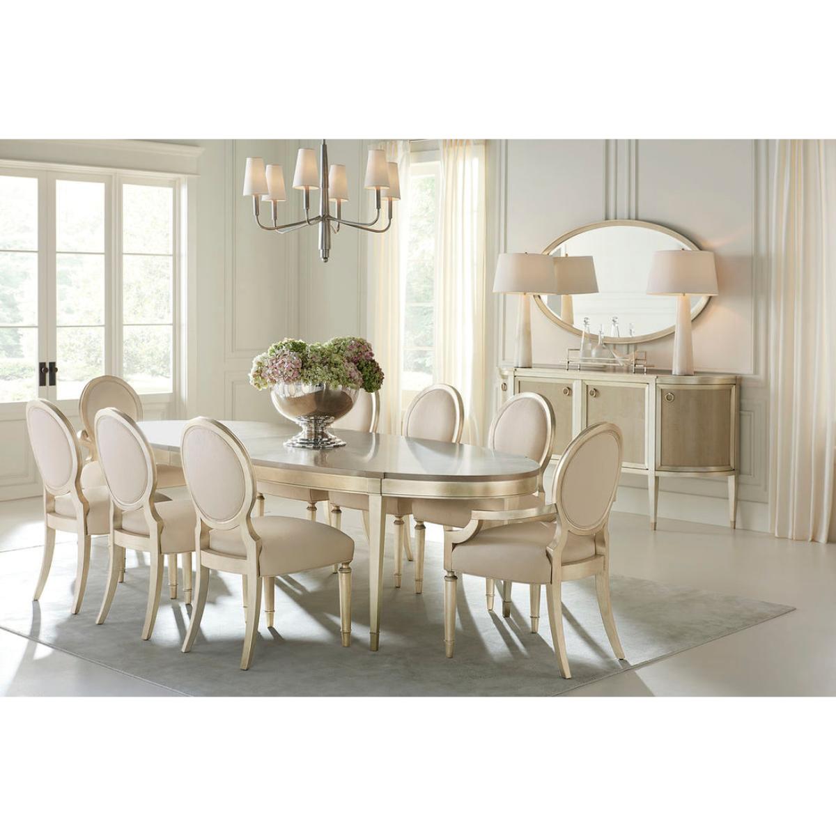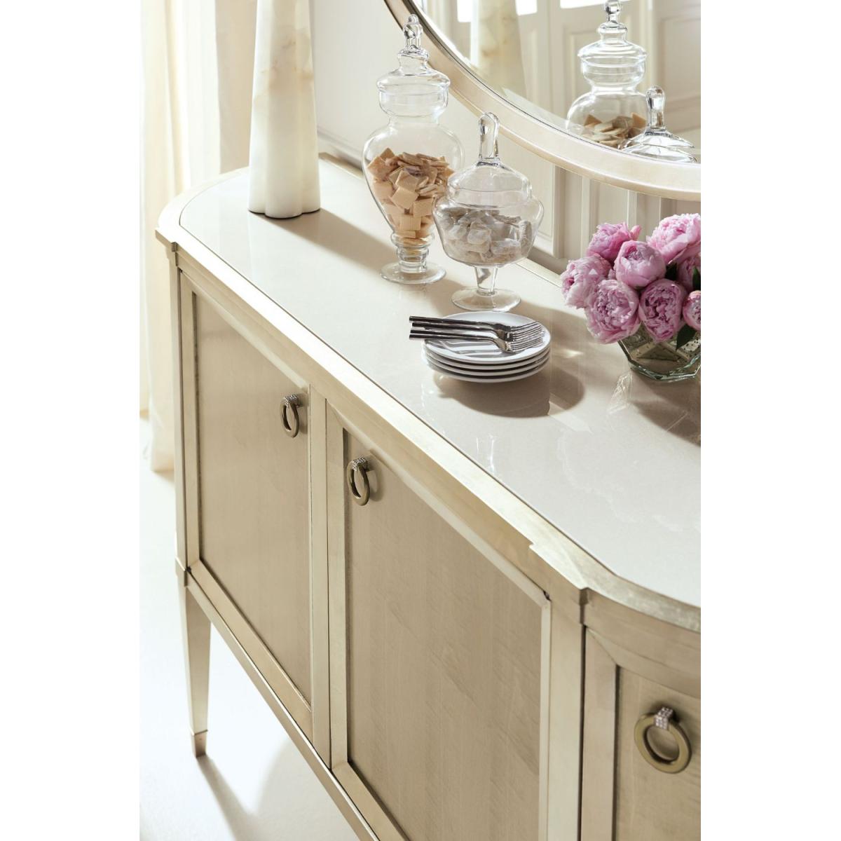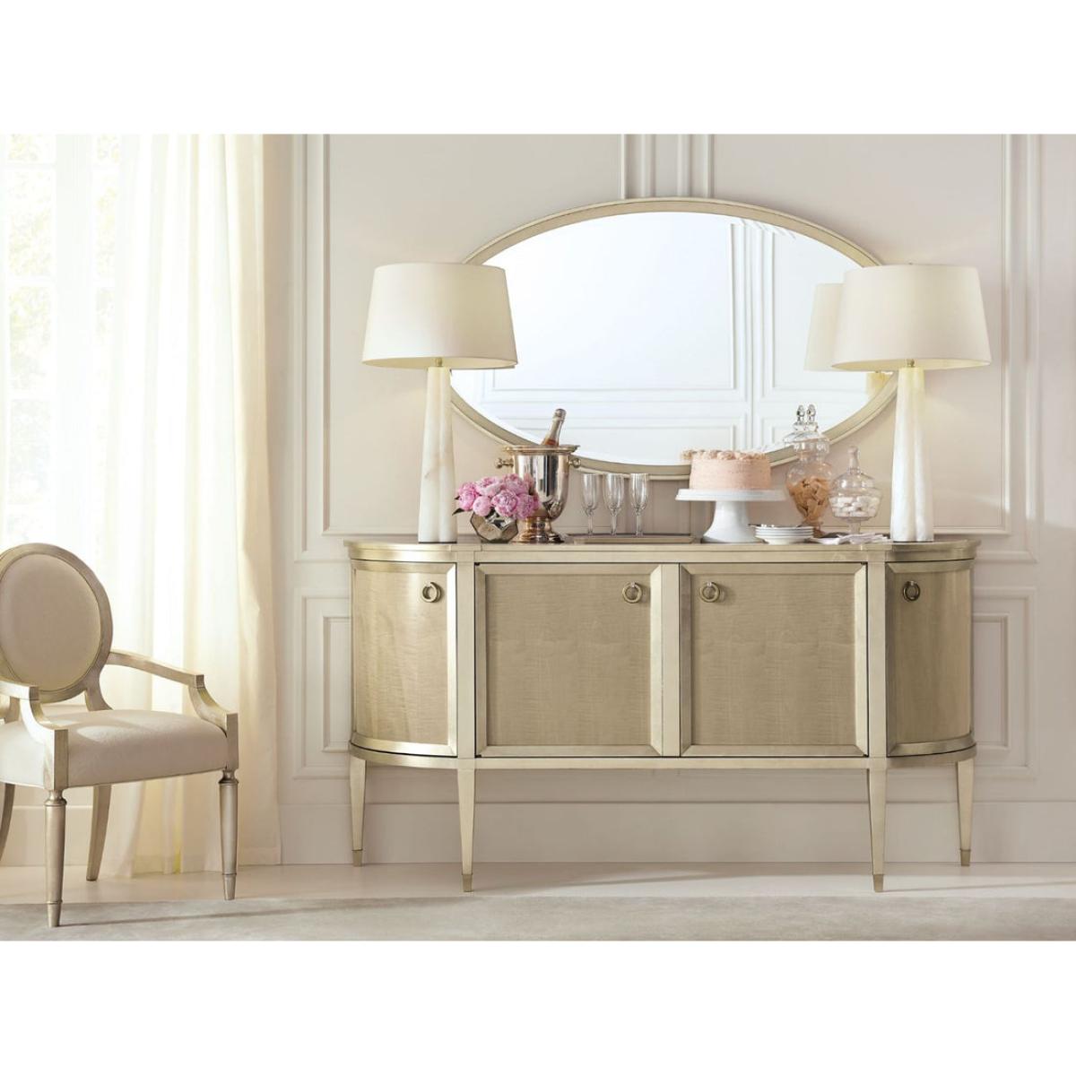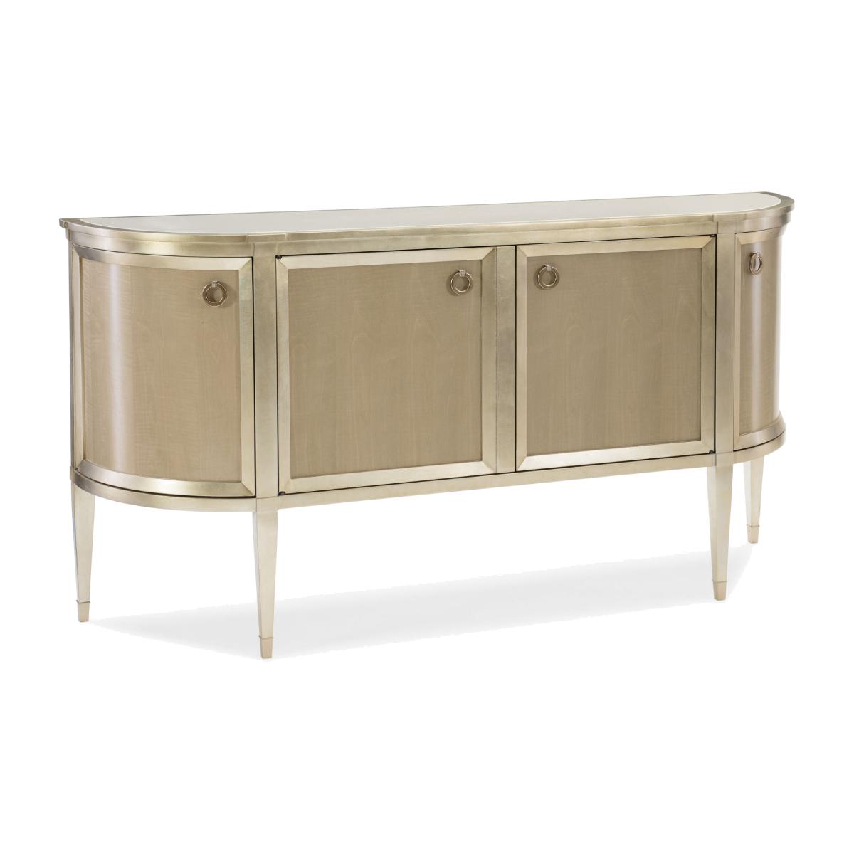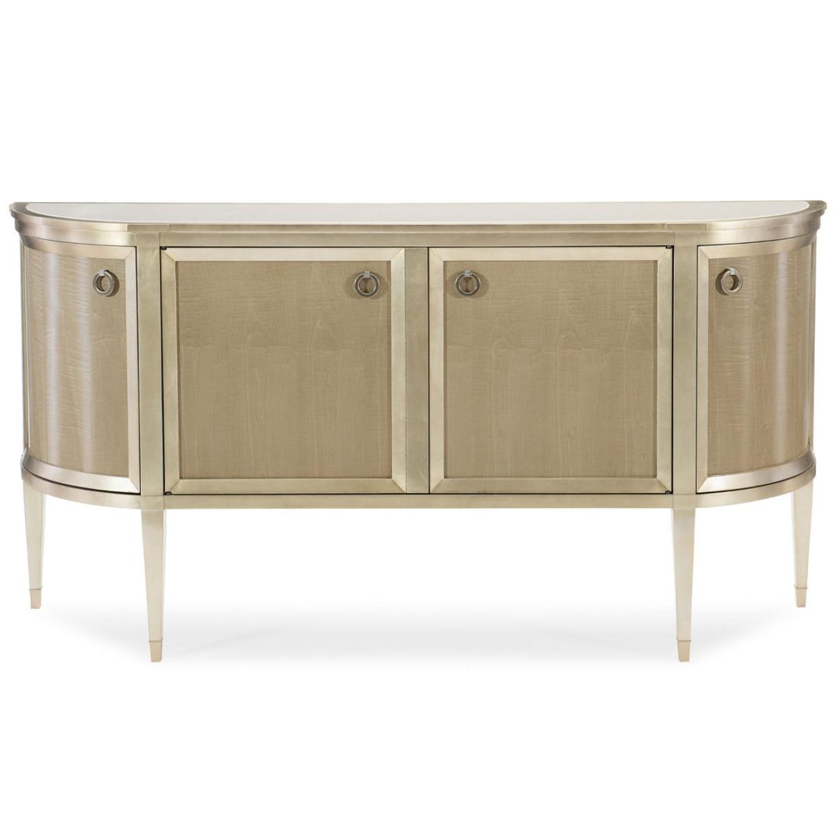 A classic reinvented, this glamourous half-moon-shaped, four-door credenza makes organization effortless. Its classically updated aesthetic is achieved with Fumed Figured Tiger Maple finished in Smoke and accented with Taupe Silver Leaf. A cream stone inset top encourages buffet serving. Adjustable shelves can be found inside, as well as a drawer with silver tray and two additional drawers. Drawer bottoms silkscreened with a trellis pattern add to the elegant appeal of its stylish interior. Panels in Smoke with solids and frames in Taupe Silver Leaf. Top frame with inset cream stone top. Four doors. One adjustable shelf behind each door. Two felt lined drawers behind center door. Left drawer with silver tray. Metal ferrules on legs. Drawer interiors in Platinum.