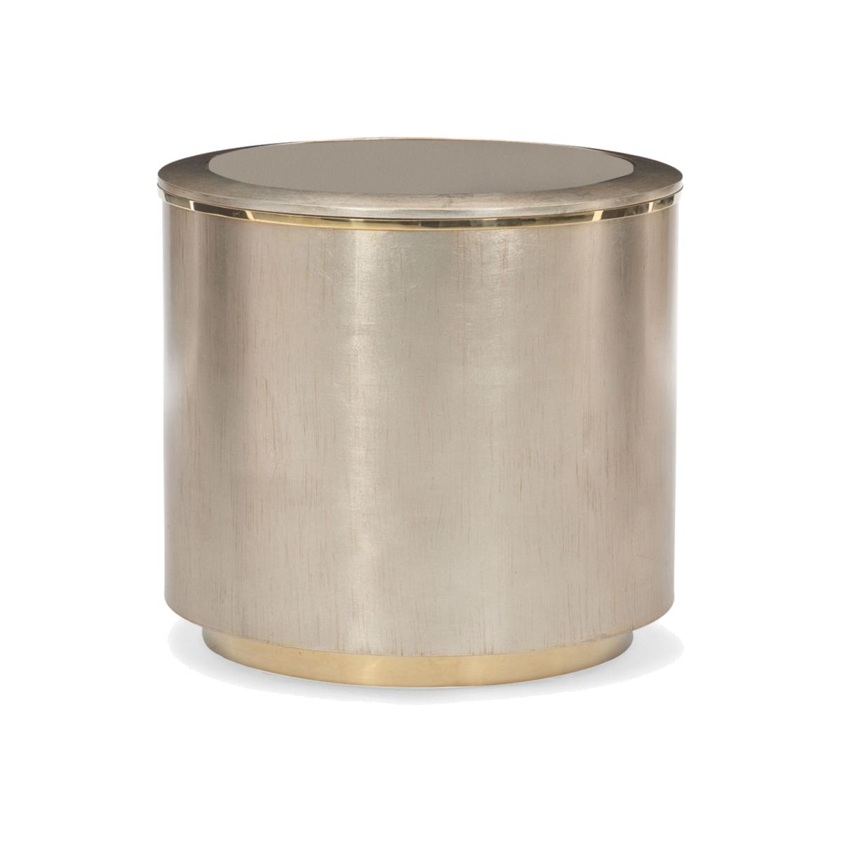 A striking focal feature, this cocktail table mixes cool silver leaf tones with the warmth of gold for a look that's bold and beautifully balanced. Features a reflective bronze mirror top for added depth, and hidden storage to keep the look clean. Style as a side table, or bunch together with our Circle in Time cocktail table to create an alluring seating area. Case finished in Auric. Bronze mirror top with Gold Bouillon metal inlay and base.