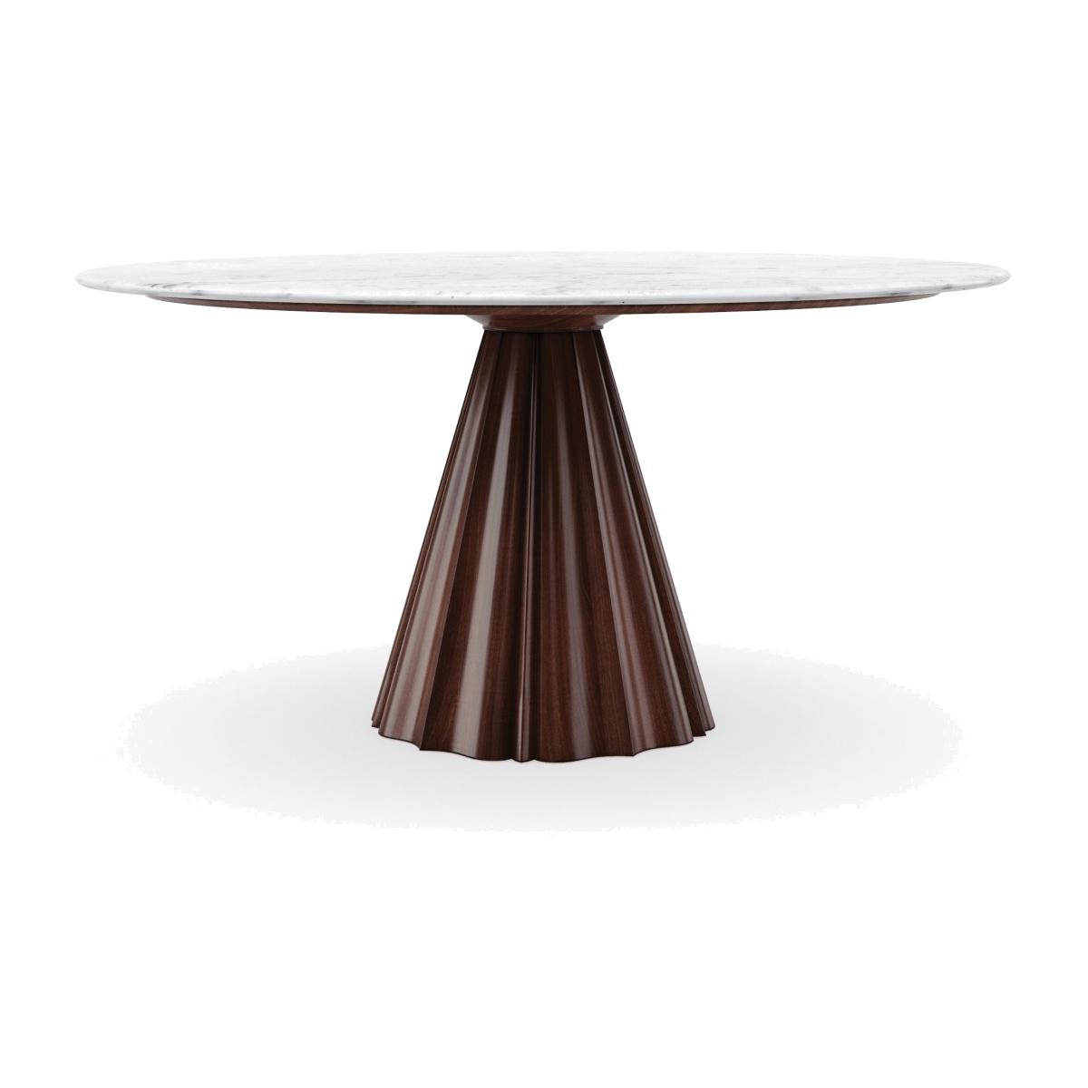 The designer's artistic vision of finding balance against all odds, this sculptural dining table embodies harmony found in nature. Playing up light and shadows, a carved walnut base adds dimension and a sense of movement to dining interiors. Designed with a reverse bevel, its veined white marble top creates the illusion of a thin stone resting on its conical base. Intimate and intentional, it elevates entertaining and quiet evenings in. Comfortably seats 4 to 6. Marble top. Base finished in Rich Walnut.