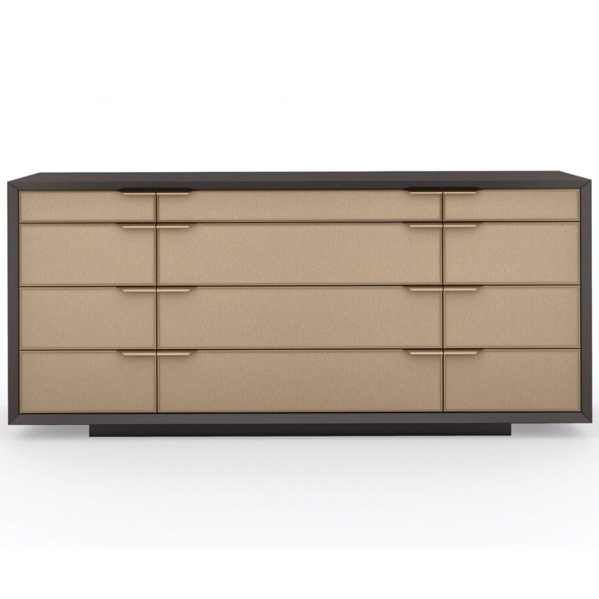 Merging minimalism with elements of mid-century modern, this streamlined dresser introduces a sophisticated style to bedroom interiors. Each drawer front is wrapped in a beautifully textured vinyl, embossed with a rivulet pattern like rain trickling down a windowpane. Casting a warm glow, metal trim in Champagne Gold artfully incorporates rounded pulls to seamlessly frame each drawer. Offers generous storage with soft-closing features and two felt-lined top drawers for an added note of luxury. Case in Dark Chocolate. Metal trim in Champagne Gold. Twelve drawers with vinyl fronts. Top outside drawers with felt lined bottoms. Tops drawers with side guides and rest of drawers with undermount soft close guides. Drawer interiors in Dark Chocolate. Plinth base in Dark Chocolate.