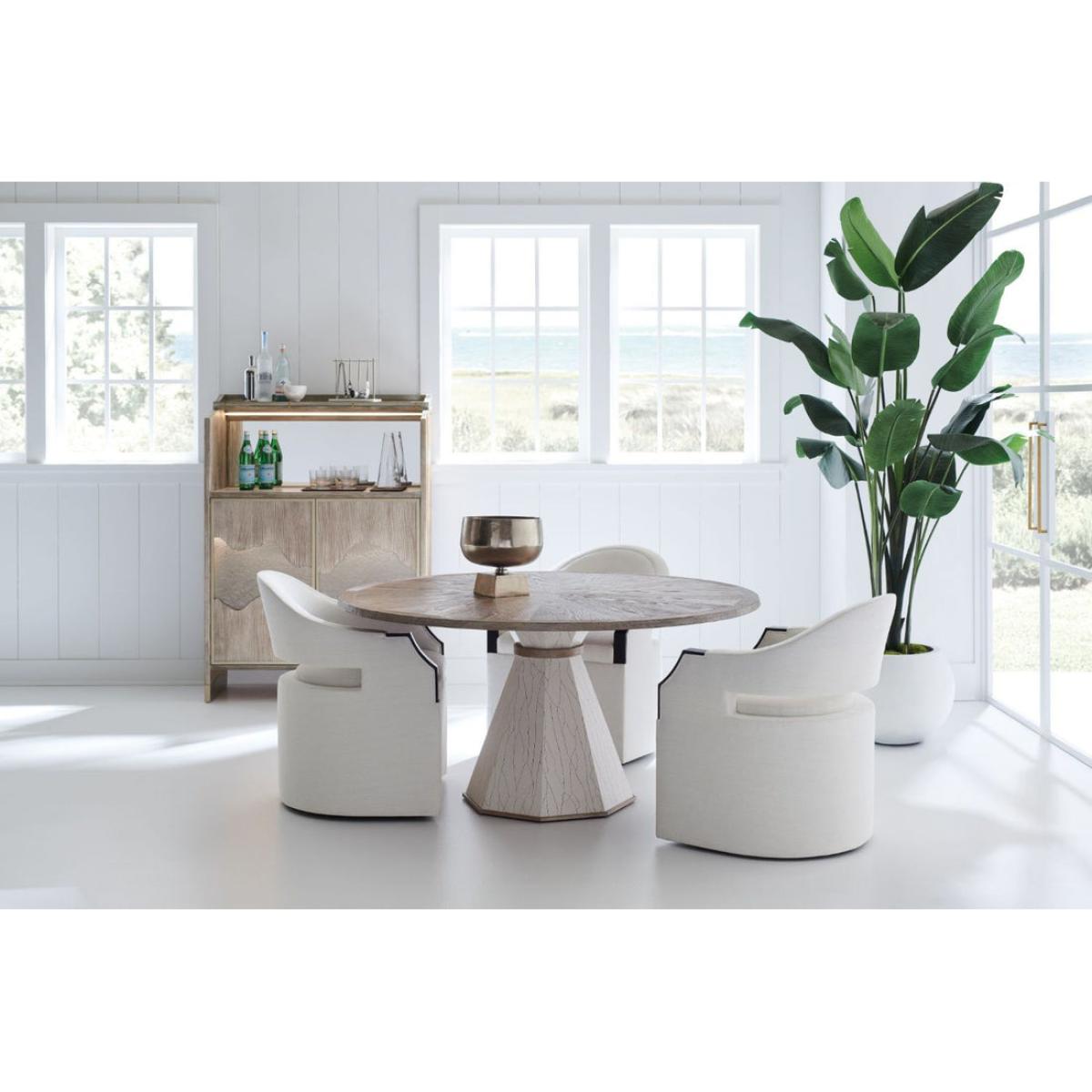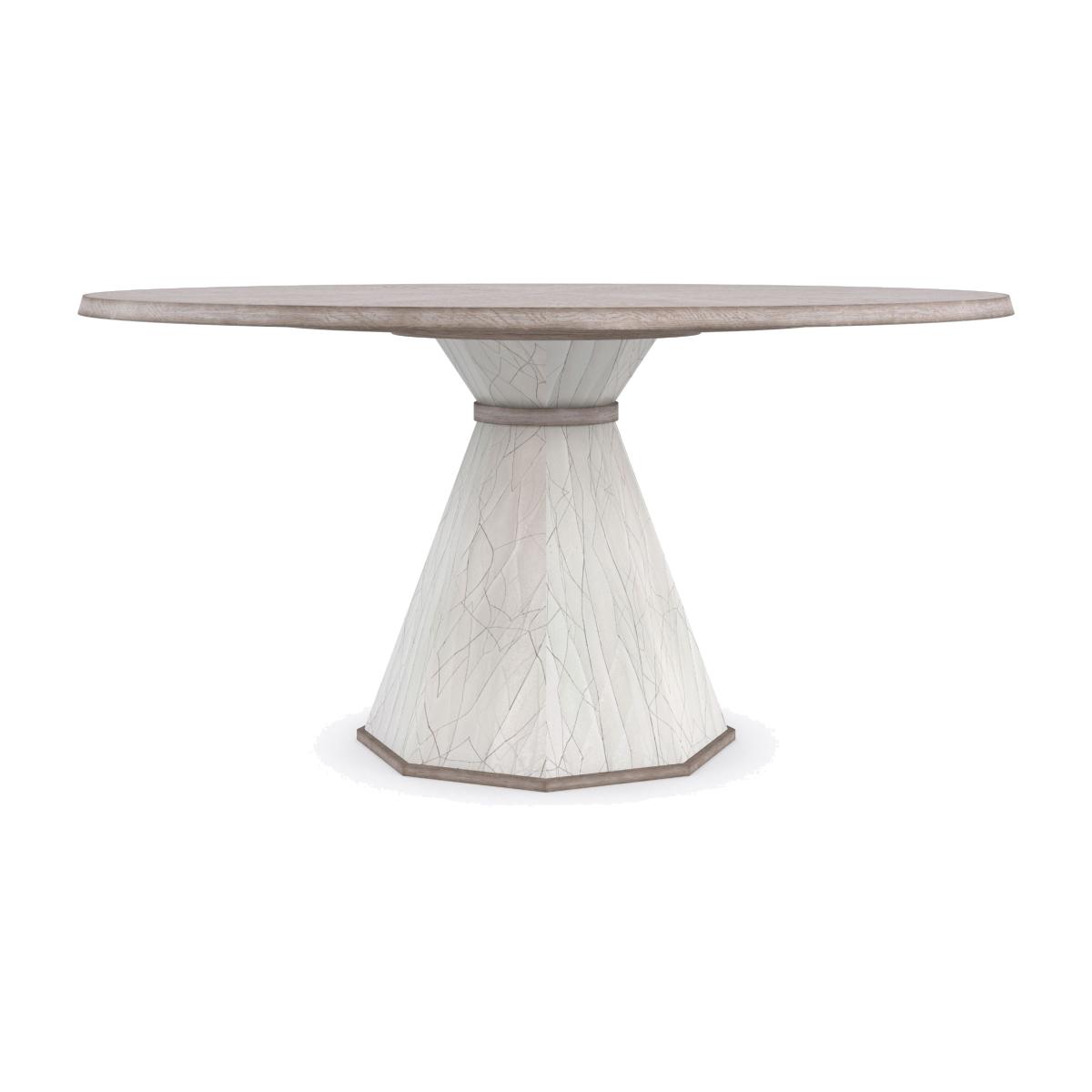 Crafted with the utmost attention to detail, this pedestal table introduces an element of ageless beauty to dining interiors. Inspired by a piece found while perusing antiques in Paris, its faceted base lends a look of surviving the centuries with a faux-crackle white finish. For added interest and tactile appeal, its generous tabletop features a pie-patterned veneer radiating from the centre, accented with solid wood banding. Top in Driftwood. Base is faux White Crackle
