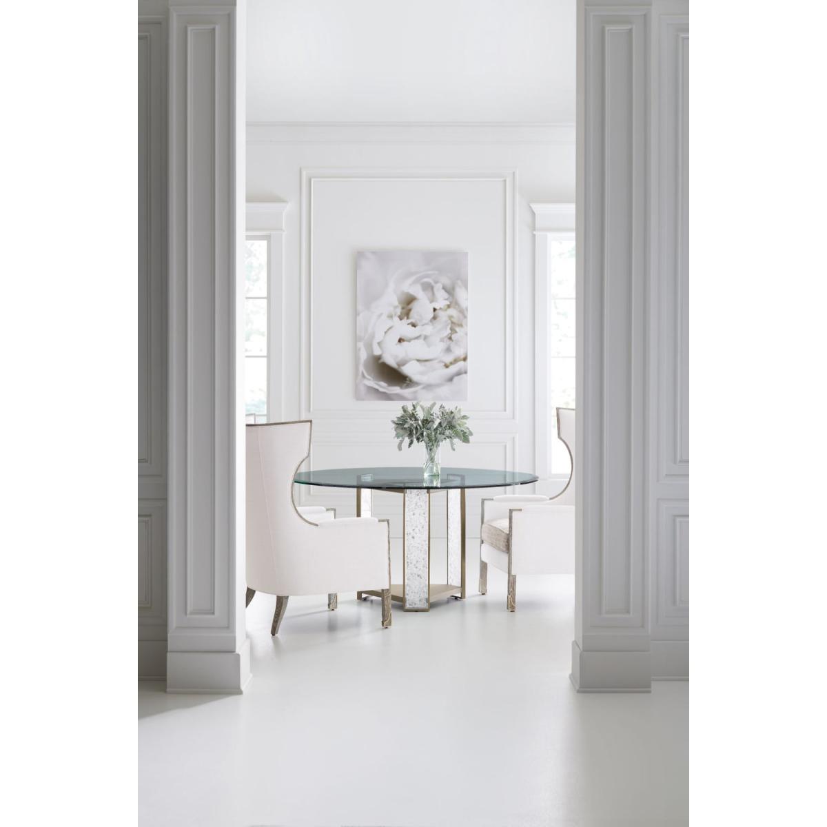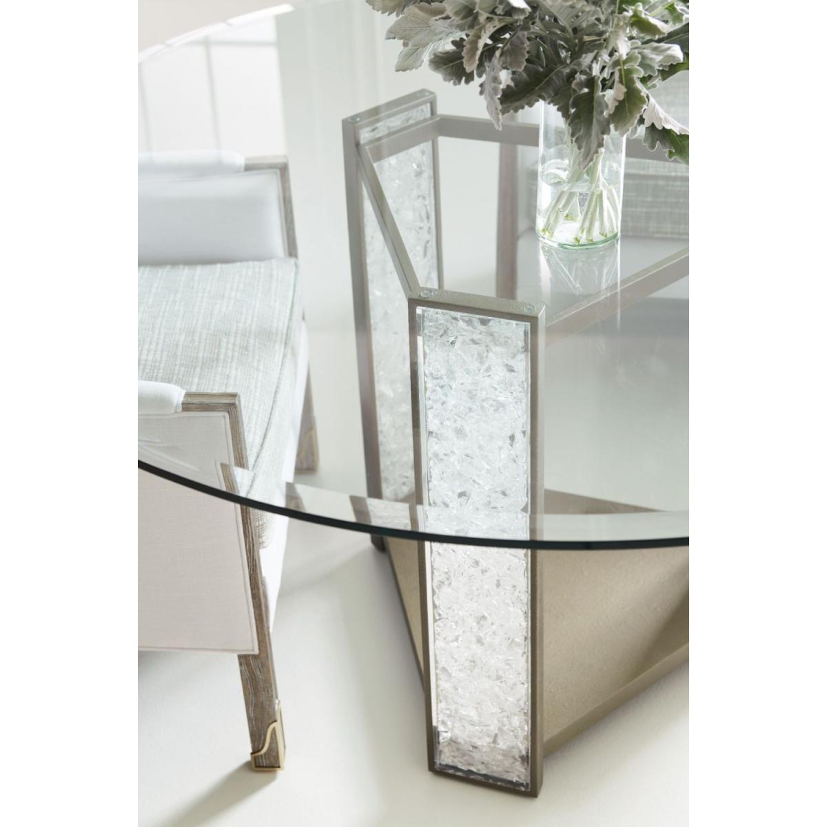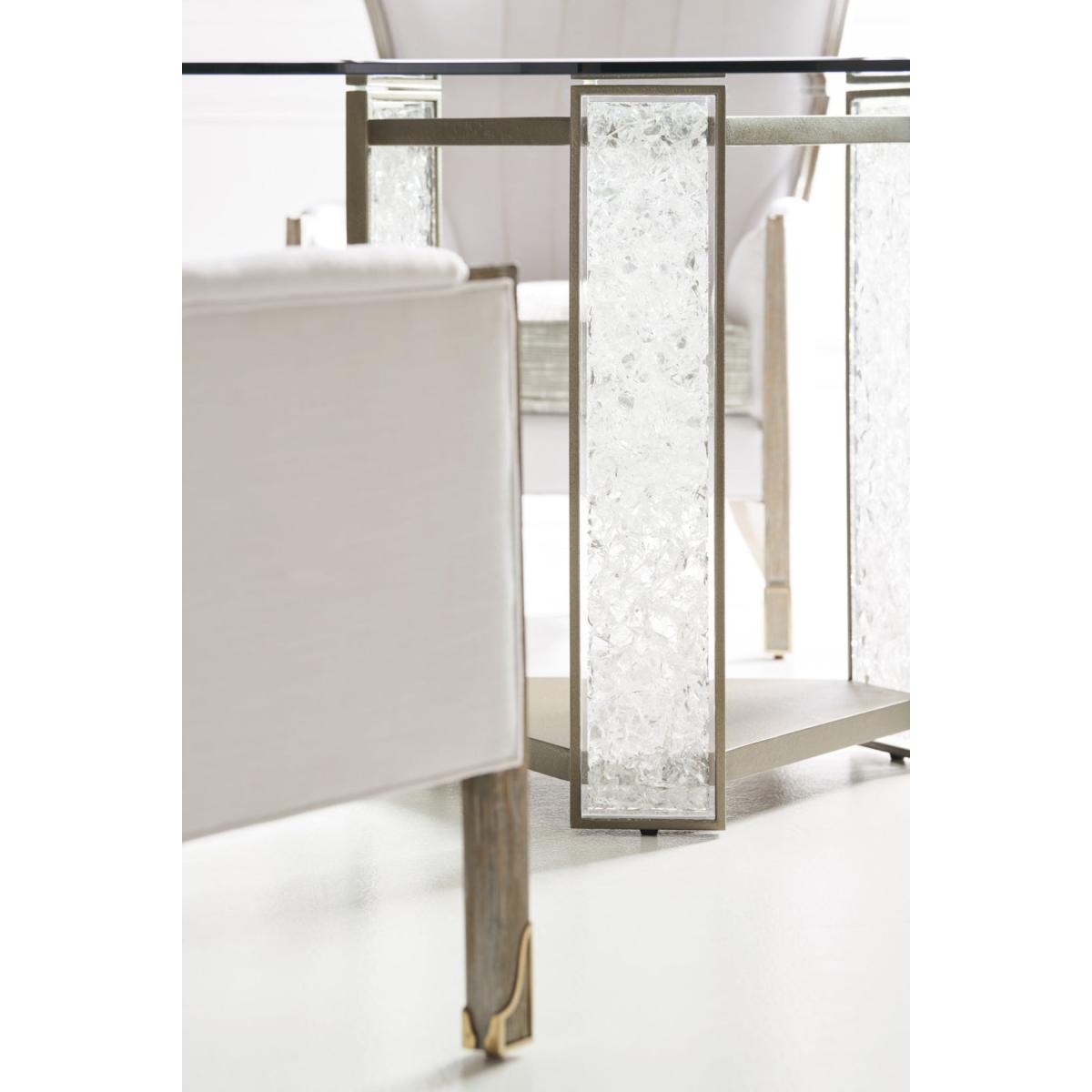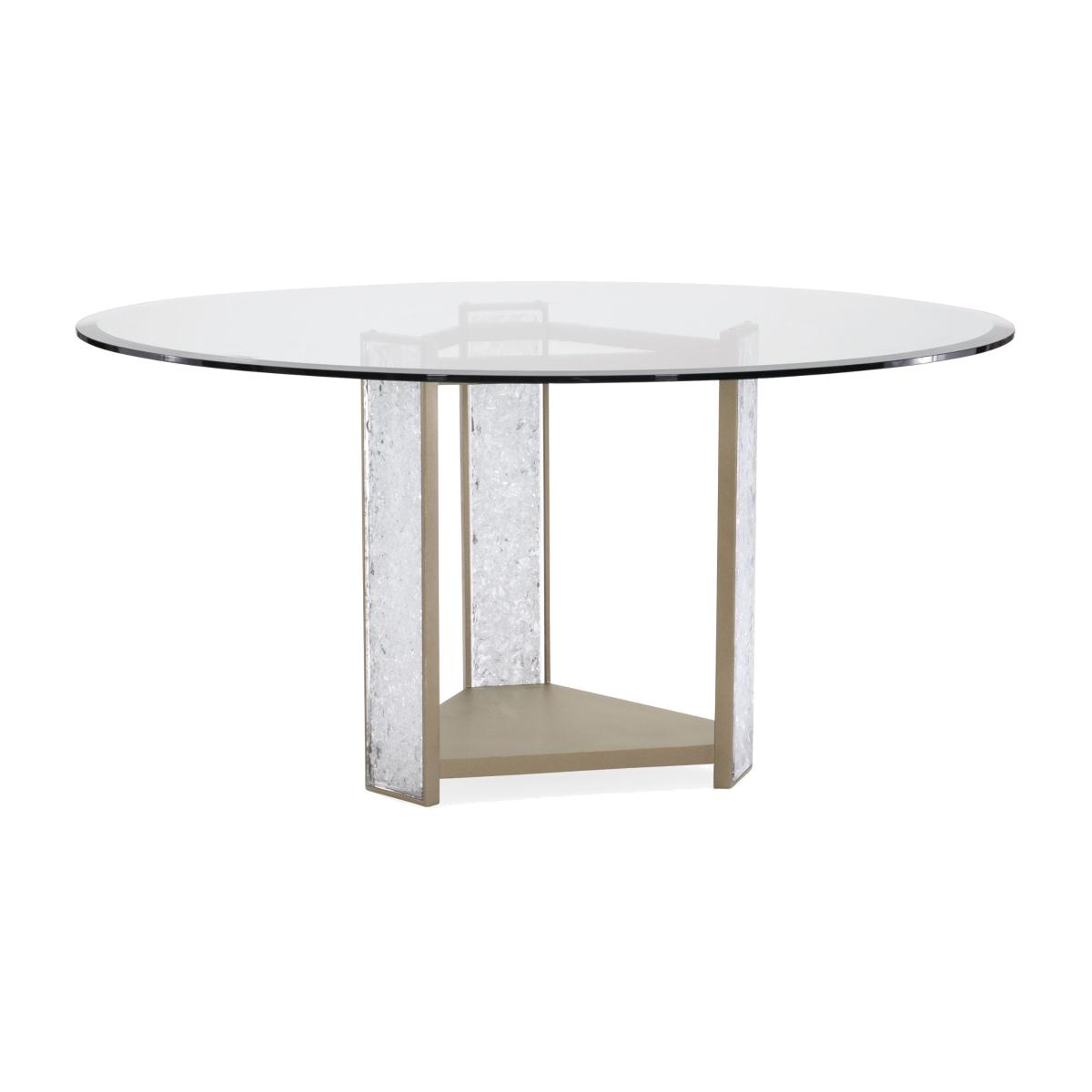 Meet our new crush: Break the Ice. This amazing dining table defines unboring. Its open triangular base features three rectangular pillars crafted of crushed crystals encased in clear acrylic. A Brushed Sundance Gold finish outlines the pedestal and each pillar to create a jewel-like presentation that catches the light and offers continuous sparkle and shine. A 60-inch round glass top with 5/8 inch bevel ensures the glamour of this distinctive design can be seen from everywhere in the room. Pedestal is finished in Brushed Sundance Gold. Pedestal legs have strips with cast acrylic broken crystals. 60" round, 5/8" thick glass top.