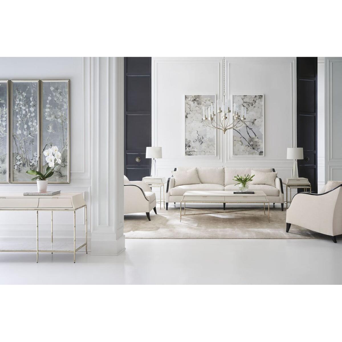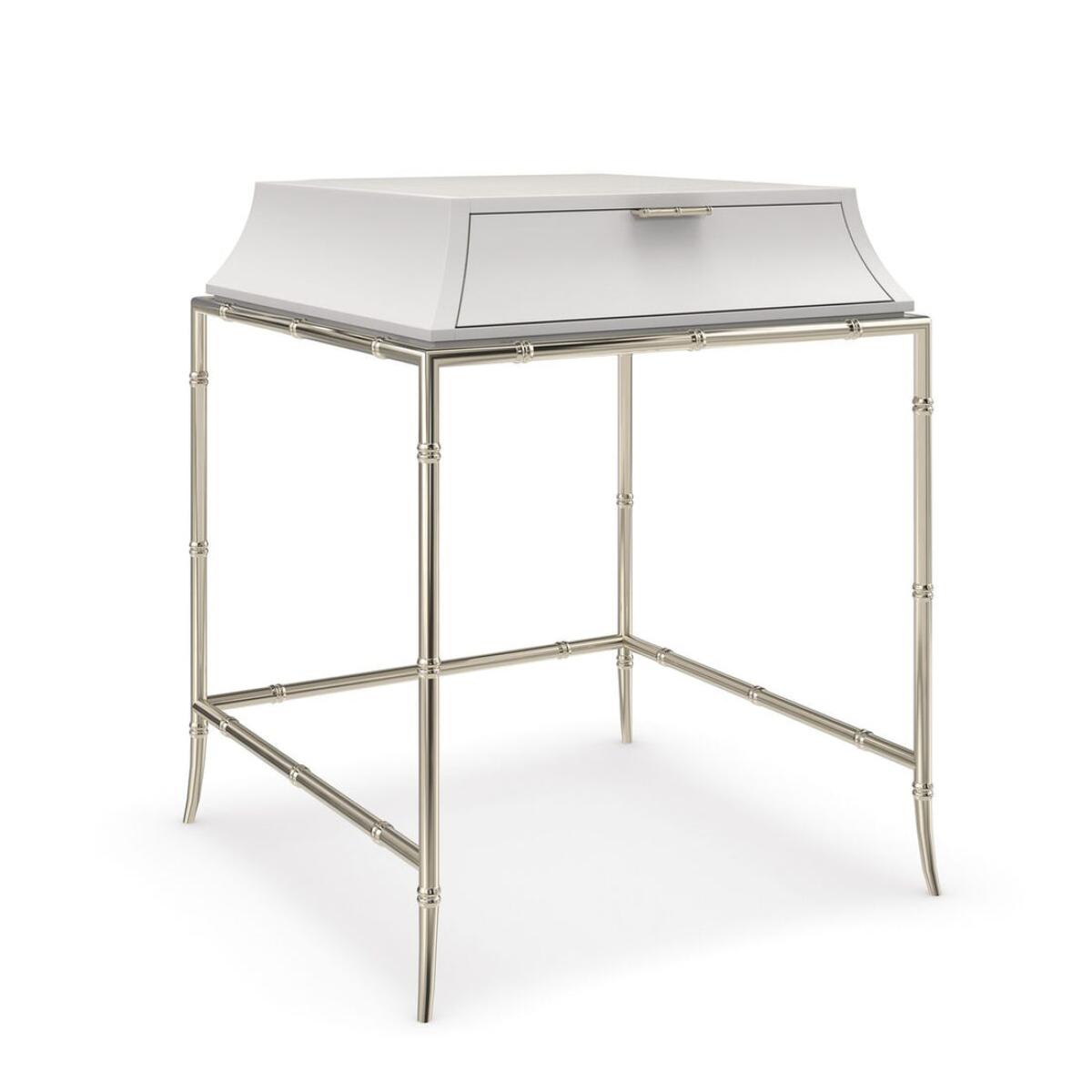 Blending modern materials with traditional Asian design influences, this tall table introduces a simple yet elegant accent to living interiors. Elevated on a faux bamboo metal frame and stretcher, a pagoda-style drawer box painted in Almond Milk features a faux shagreen top. Style on its own, or pair with our Ceylon small nesting table for an easily accessible extra table when guests arrive. Metal frame and bottom stretcher in Whisper of Gold. Case top is wrapped faux shagreen with Alabaster painted finish. Top box in Almond Milk. One drawer with soft close side guides. Interior in Almond Milk. Please note this is 1 table not a set Dimensions: H: 63.5 x W: 52.71 x D: 52.71cm Materials: Metal