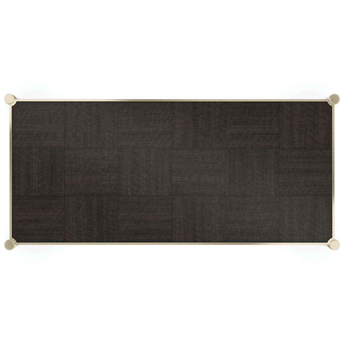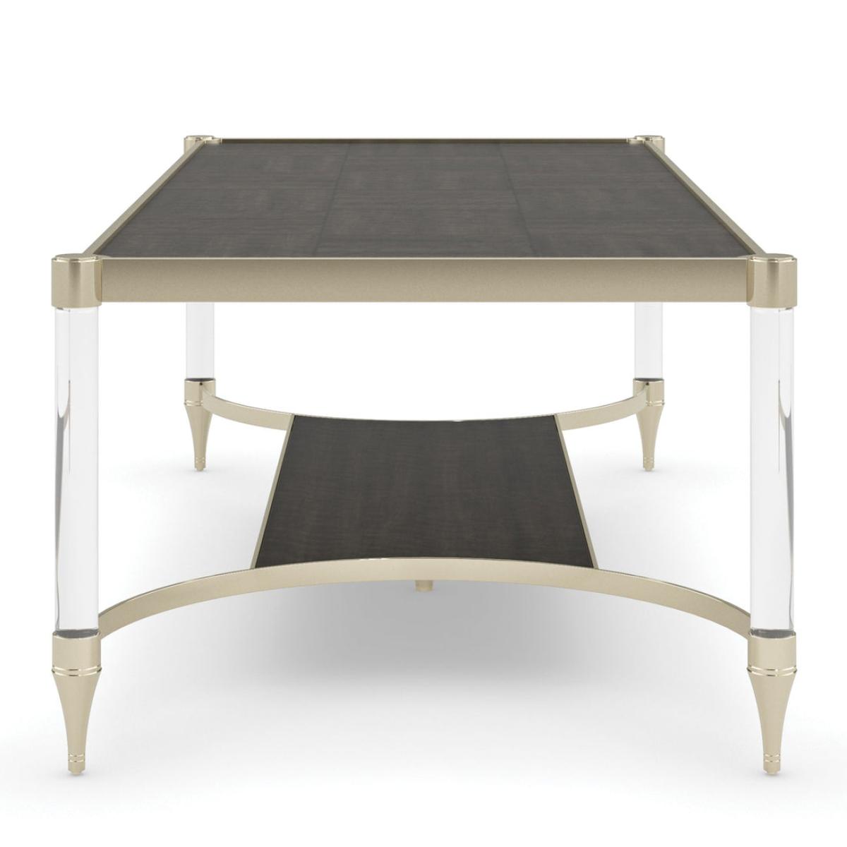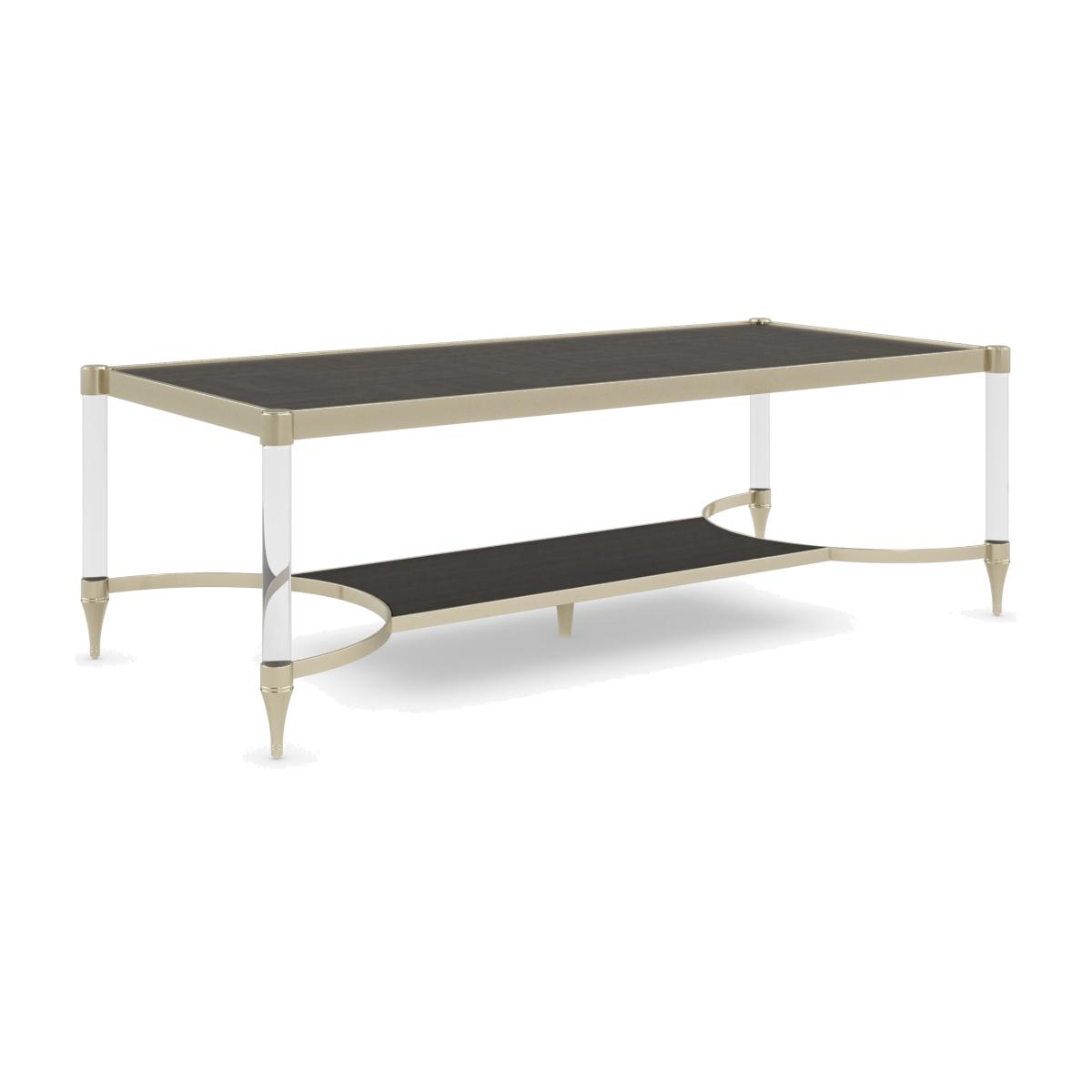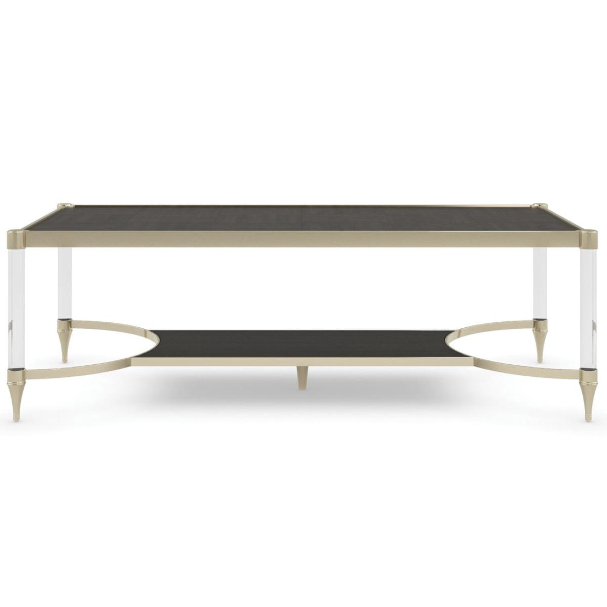 Tall acrylic posts and a Whisper of Gold add notes of grandeur to this casually glamorous cocktail table. A classic checkerboard-patterned top creates depth and dimension in a richly contrasting, Charred Bark finish. Features a shaped bottom shelf, designed for storing our Your Move accent ottomans, upholstered in a Belgian cut velvet, for added interest, spontaneous seating, and a tactile finish. Top and shelf in Charred Bark. Stainless Steel frame in Whisper of Gold. Acrylic posts.