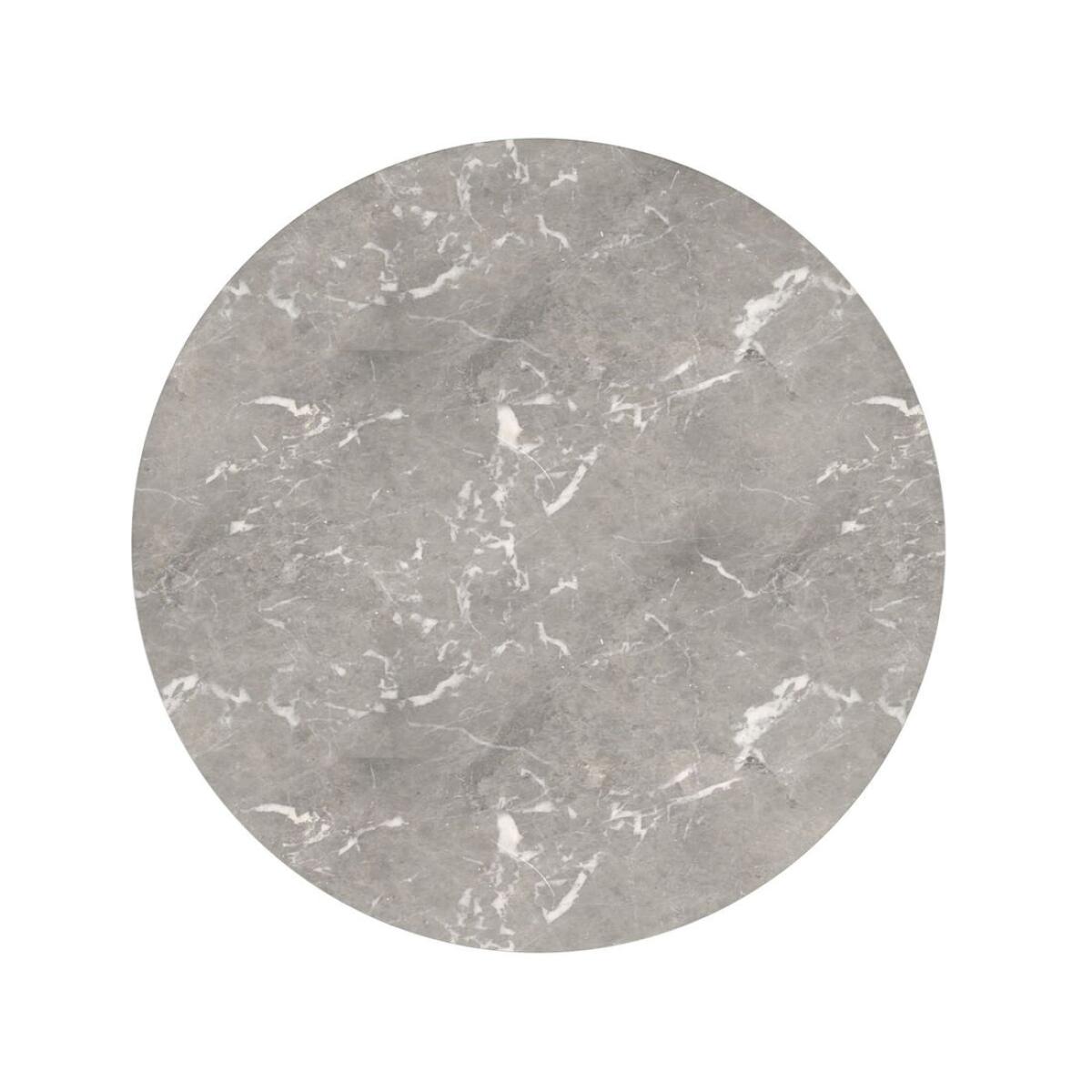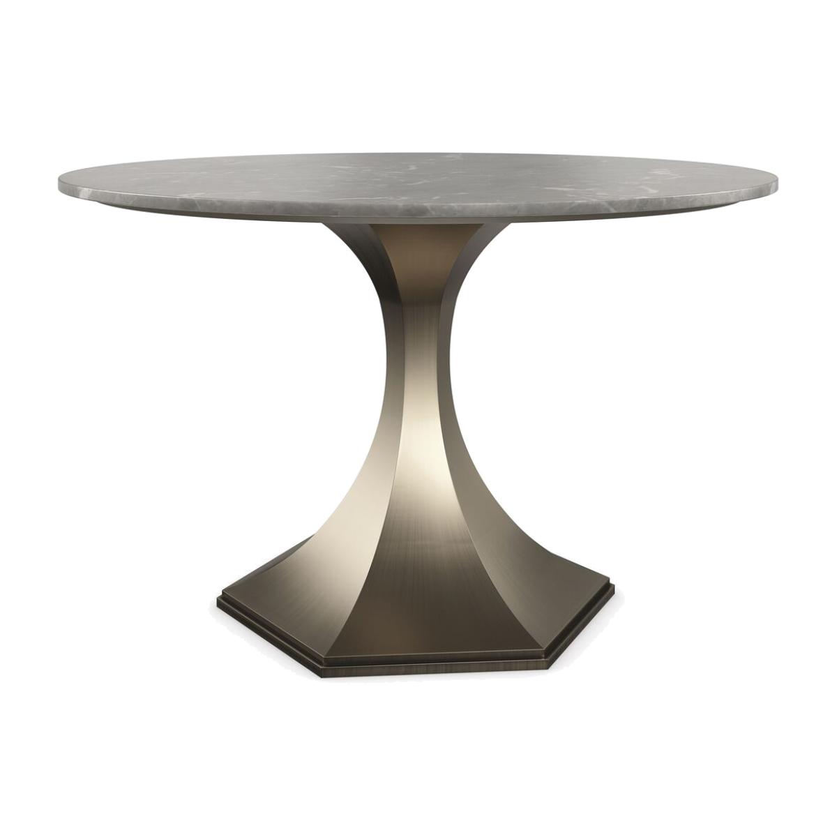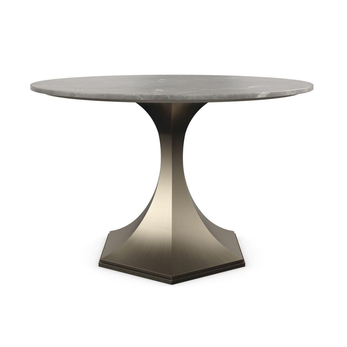 Rising to the occasion in any interior, this 48” pedestal table is well-scaled for an entryway, library or smaller dining space. Features a luxurious, yet durable, grey sintered stone top with the classic look of veined marble, perfectly poised on a cinched fluted base in a Brushed Antique Brass finish. Accommodates up to six seats when styled as a dining table. Gray Armani Marble top. Top plate in Afterglow. Metal base in Brushed Antique Brass. Table accommodates 6 chairs.
