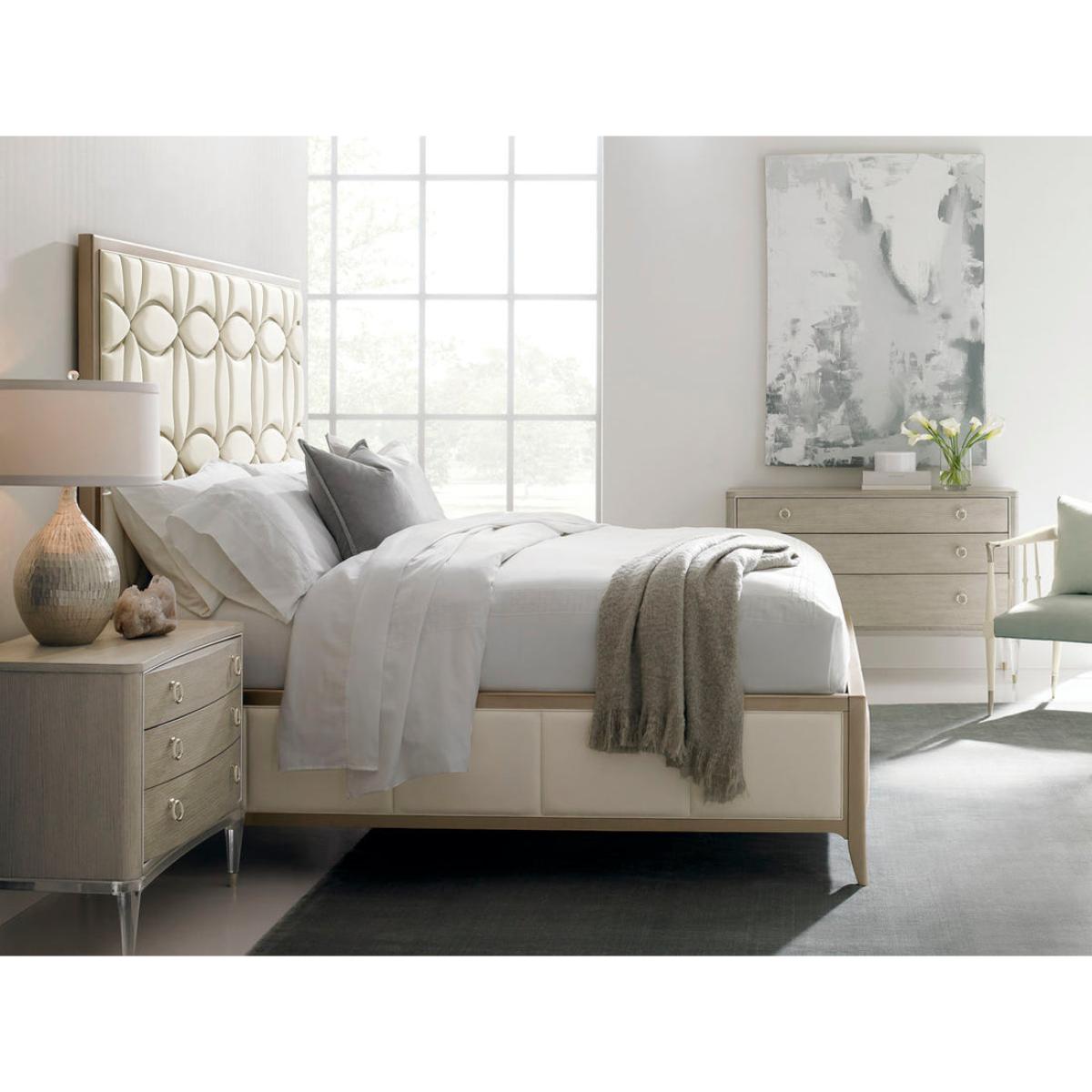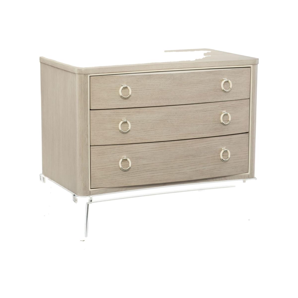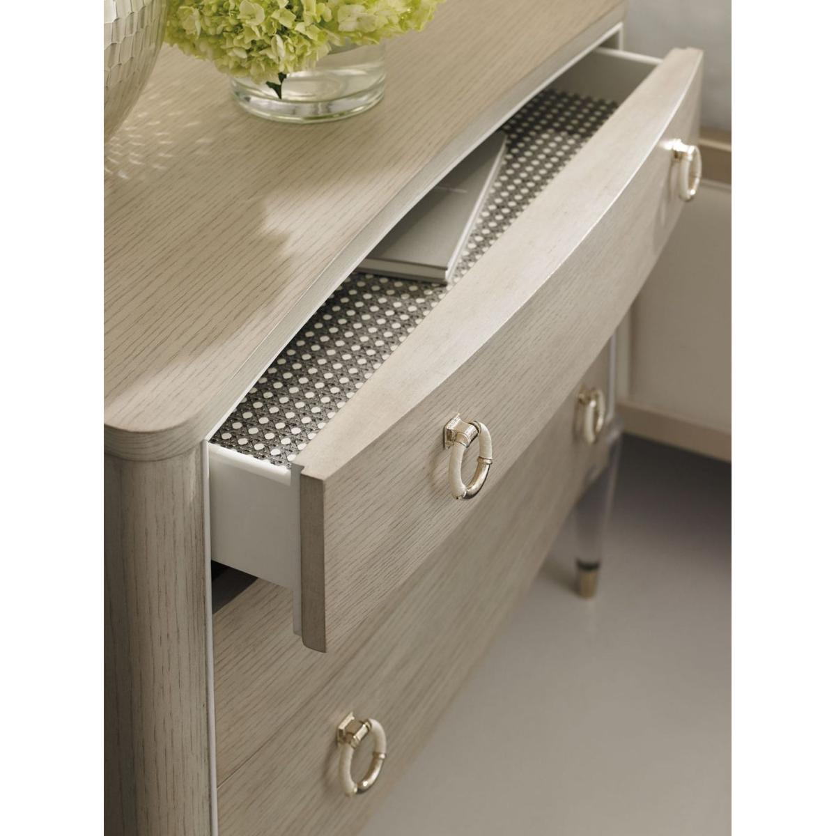 This three-drawer nightstand is a clear winner beside any dreamy bed. Convex drawers gracefully extend from a concave case of quarter-sawn oak and is finished in beautiful Heron Grey. A creamy white bead outlines the drawers for that designer touch. Custom, silver metal ring pulls are interlaced with soft, cream leather. Open the drawers to discover a clean Wedding Dress White palette with a decorative cane stencil on the interior bottoms. The whole cabinet floats off the ground on an acrylic base with clear legs tipped with Whisper of Gold ferrules. Acrylic base. Striping in Soft White. Three drawers with soft-close guides. Top drawer with cord access and USB outlet on back drawer. Interiors in Soft White with cane stencil on bottom of drawers. Metal ferrules in Whisper of Gold.