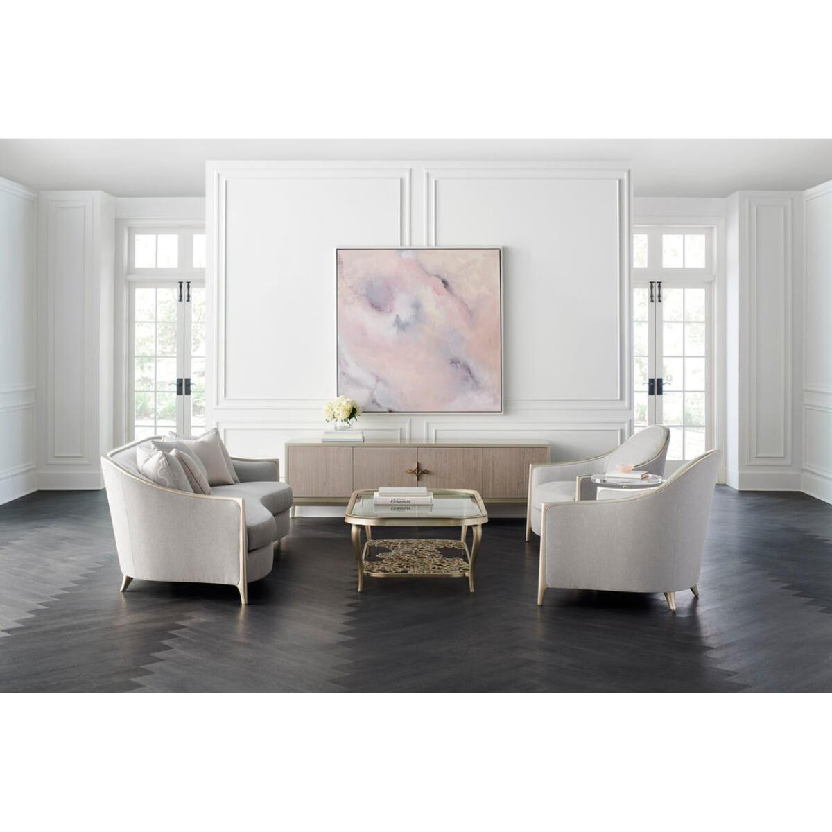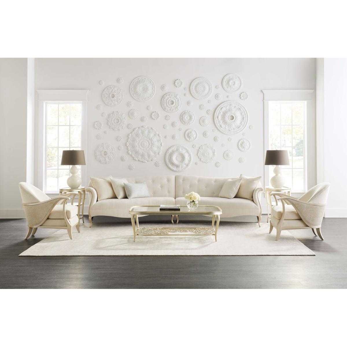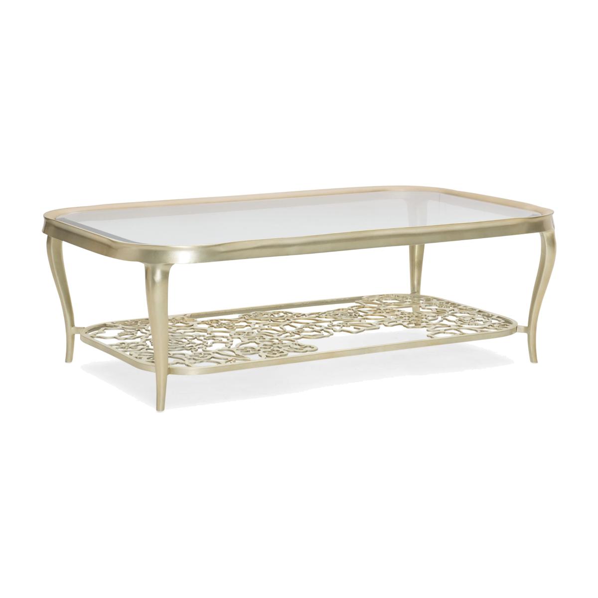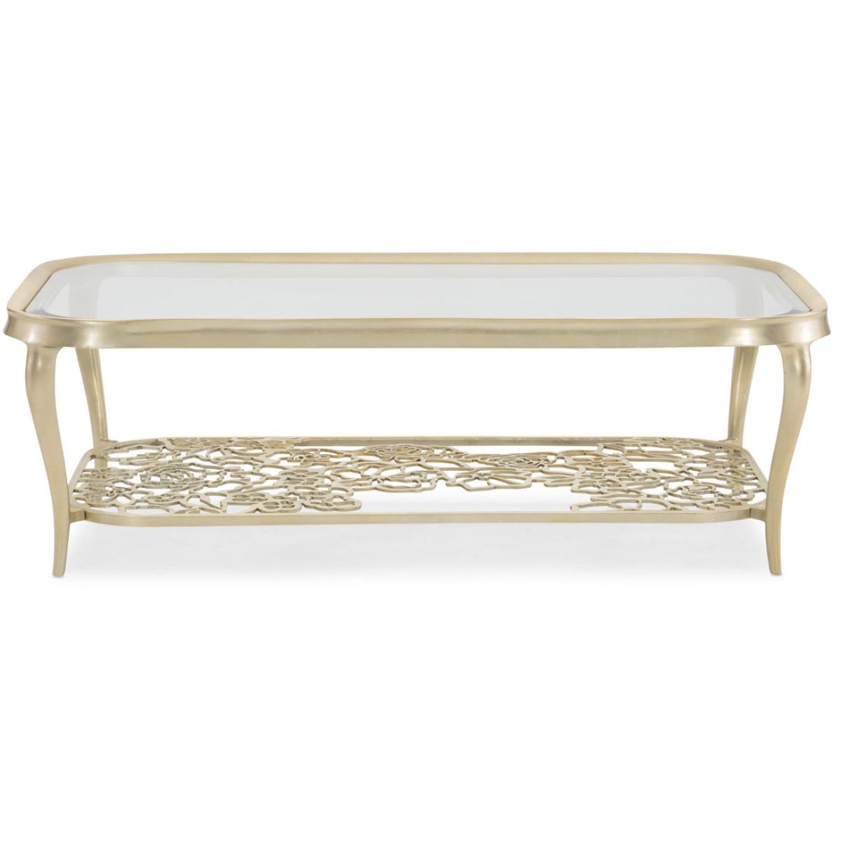Defined by its distinctiveness, this cocktail table is in full bloom. A rounded rectangular metal frame encloses a tempered-glass top with elegant bevel. Look below and see the beauty of a metal stretcher crafted of cut-out flowers arranged in a geometric pattern forming a virtual garden. Graceful cabriole legs support its open design and are highlighted with a silver leaf finish in Oracle. While traditional at heart, this captivating table is sure to surprise and delight all who see it. Metal frame finished in Oracle. Top is beveled tempered clear glass. Pierced metal bottom shelf.
