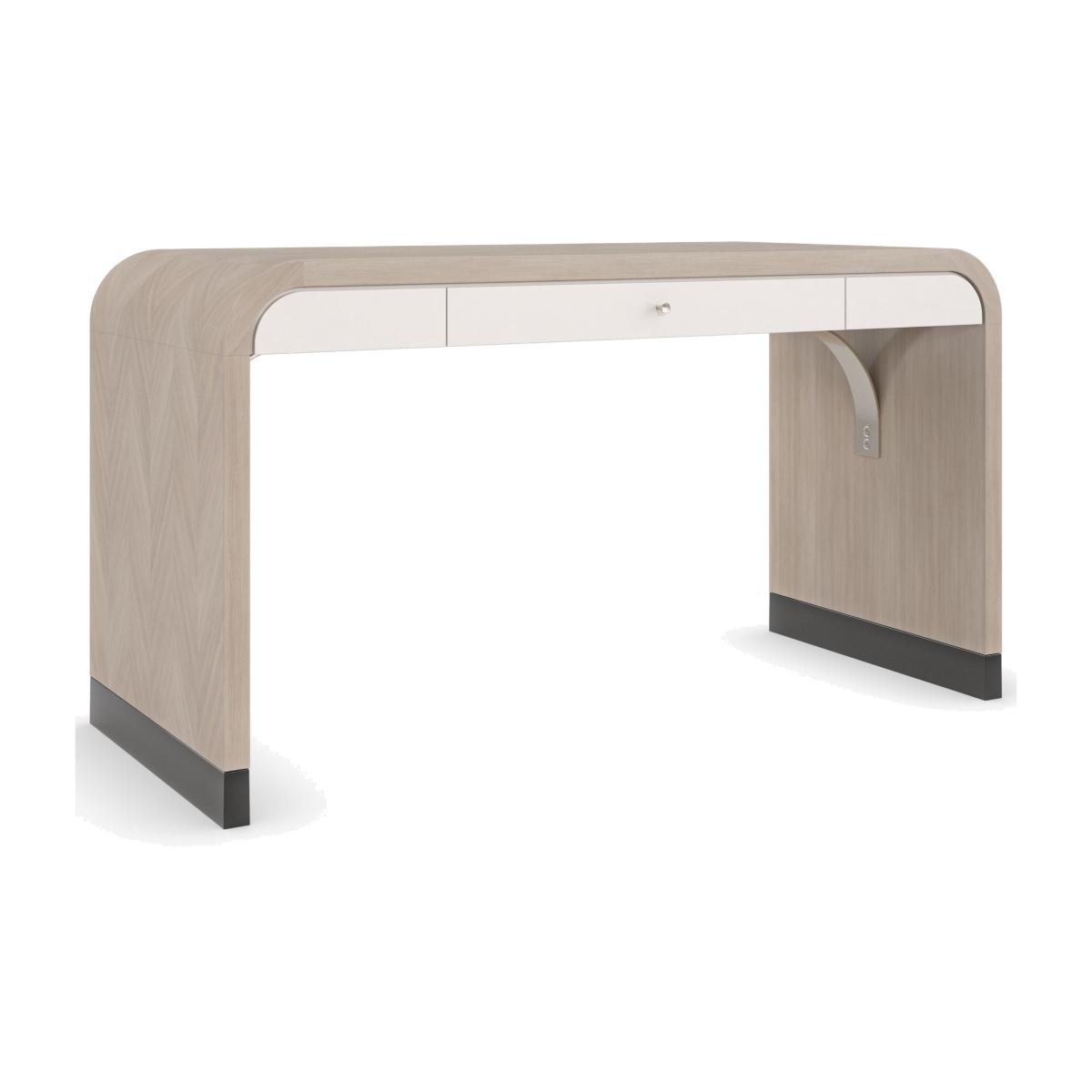 Create a serene space for work and moments of reflection with this parsons style desk, engaging the senses with its fluid form and gently rounded edges. A pearlescent Moonstone finish gives light to the exquisite waterfall herringbone pattern of Koto veneers, complemented by a Pearly White drawer with a centre divider inside and painted wood tray. Also works beautifully as a console in halls and entryways, or as an elegant vanity in bedrooms and dressing areas. Top and sides in Moonstone. Case and legs in Pearly White. One drawer with front in Moonstone and side guides. Drawer features center divider and painted wood tray. Feet finish Almost Black. Drawer interior in Dawn.