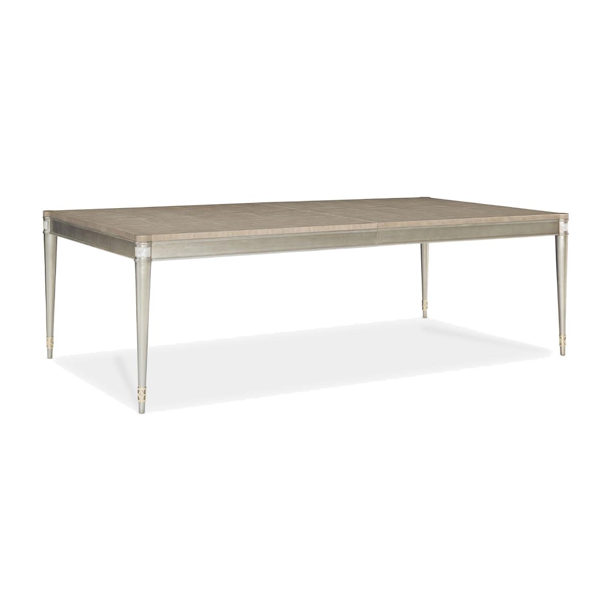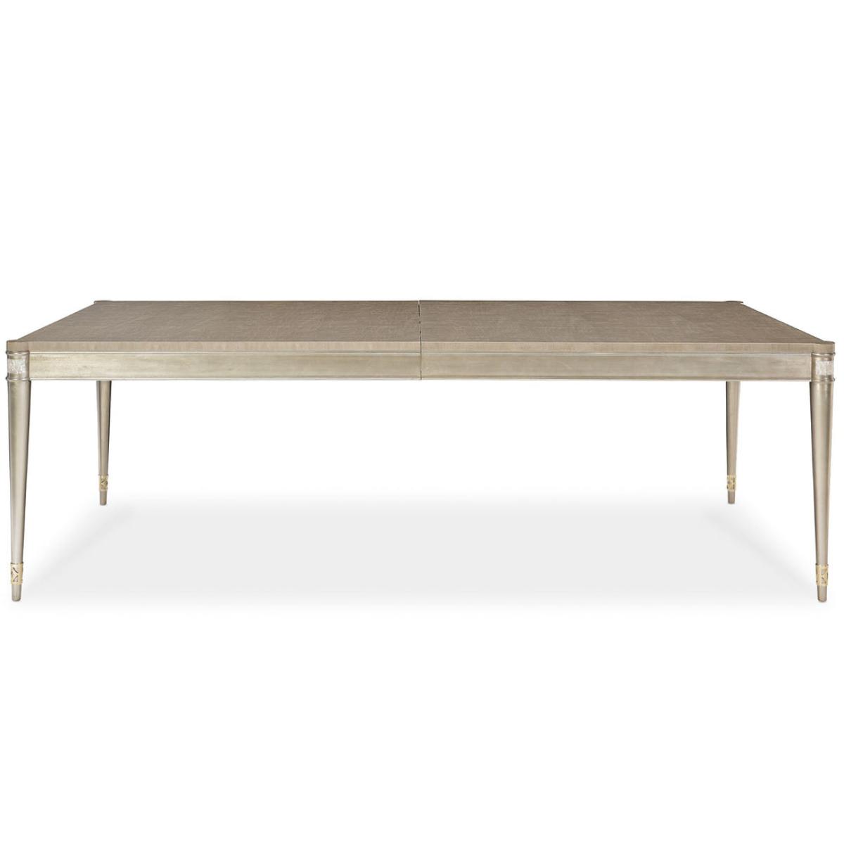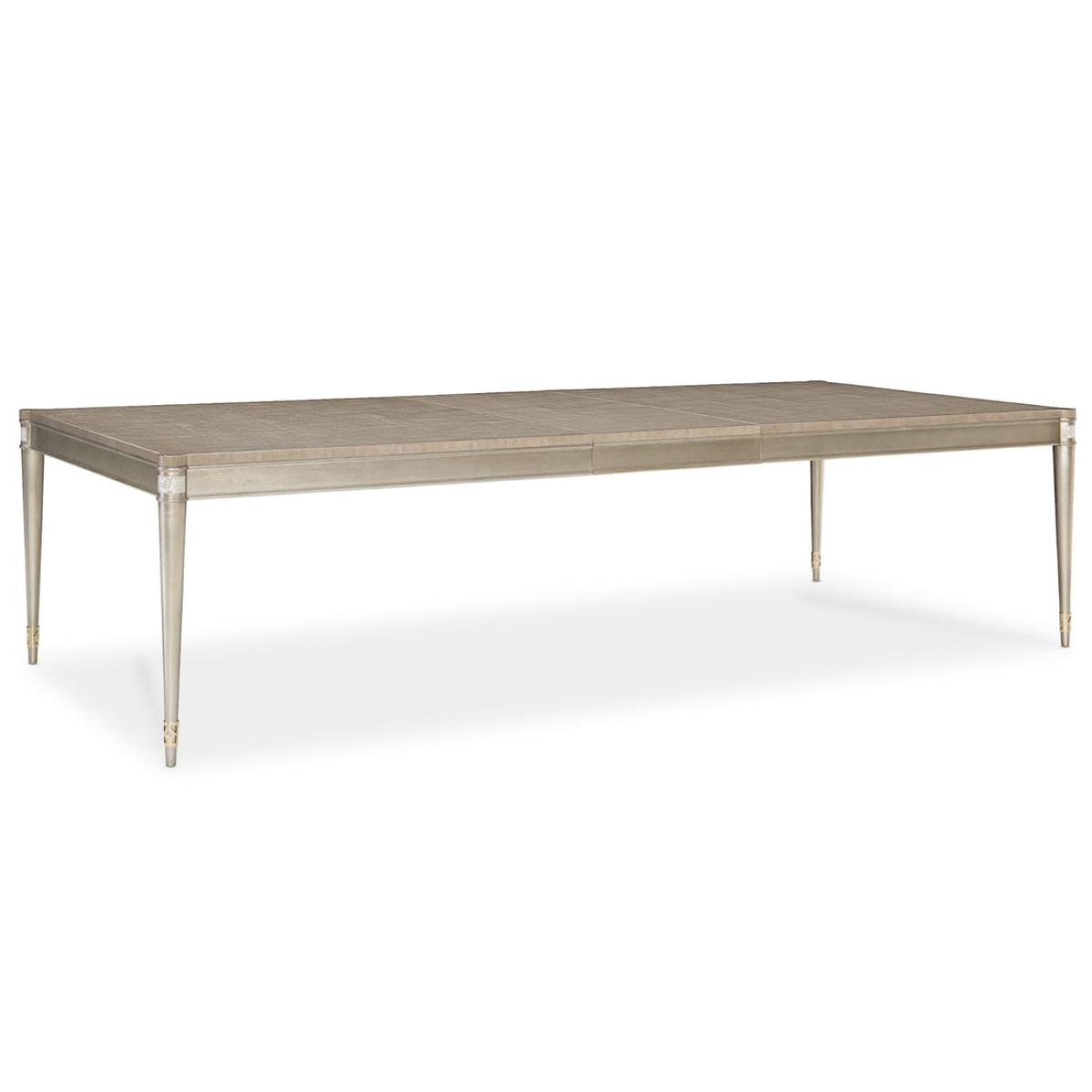 Pull up a chair and enjoy a signature dining experience with this remarkable table. Every gathering will feel special around its classically elegant profile and softly shimmering surfaces. White Mother of Pearl inlays accents its upper legs while a Moonlit Sand finish highlights the tabletop and Soft Silver Leaf gives its apron and legs their opulent appearance. Metal ferrules in Whisper of Gold provide a finishing touch. Minimal in form, this distinctive dining table features a classic design brought to life with luxe finishes and details that convey a whole new level of luxury. Table top finished in Moonlit Sand with apron and legs finished in Soft Silver Paint. White MOP inlay accents in top of leg posts. Extends to 139. 5" with two 22" leaves. Metal ferrules in Whisper of Gold. Ships KD.