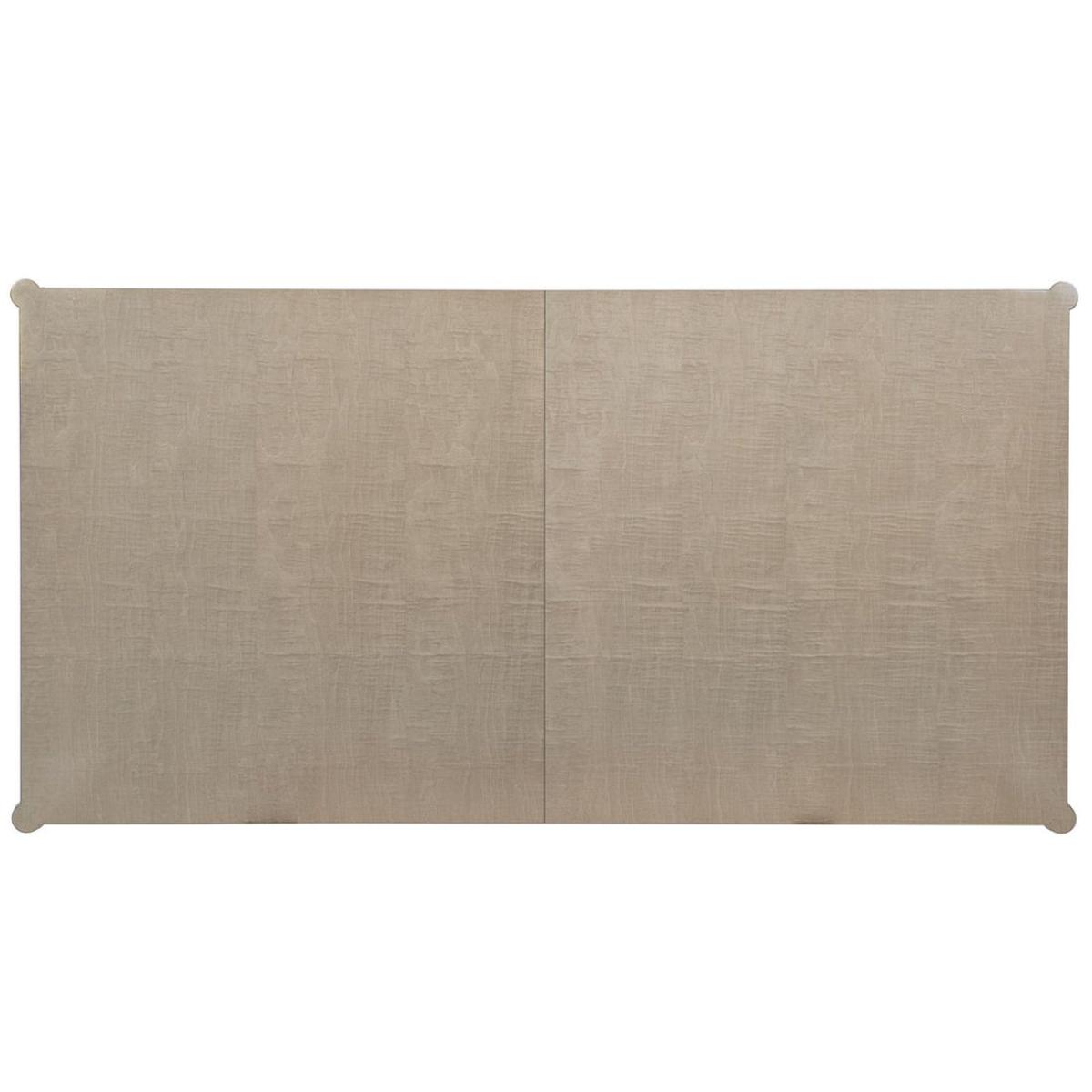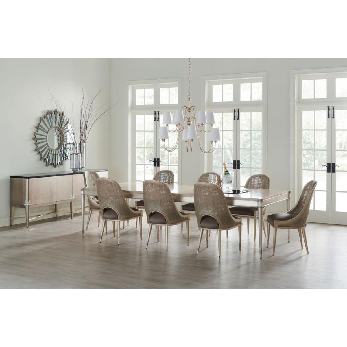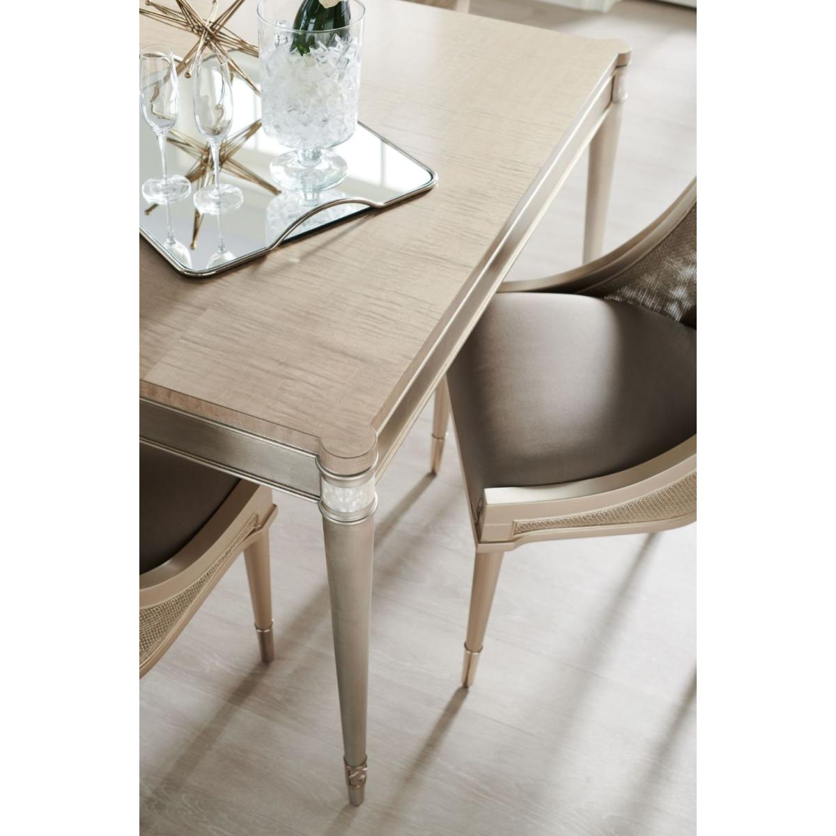 Pull up a chair and enjoy a signature dining experience with this remarkable table. Every gathering will feel special around its classically elegant profile and softly shimmering surfaces. White Mother of Pearl inlays accents its upper legs while a Moonlit Sand finish highlights the tabletop and Soft Silver Leaf gives its apron and legs their opulent appearance. Metal ferrules in Whisper of Gold provide a finishing touch. Minimal in form, this distinctive dining table features a classic design brought to life with luxe finishes and details that convey a whole new level of luxury. Table top finished in Moonlit Sand with apron and legs finished in Soft Silver Paint. White MOP inlay accents in top of leg posts. Extends to 139. 5" with two 22" leaves. Metal ferrules in Whisper of Gold. Ships KD.