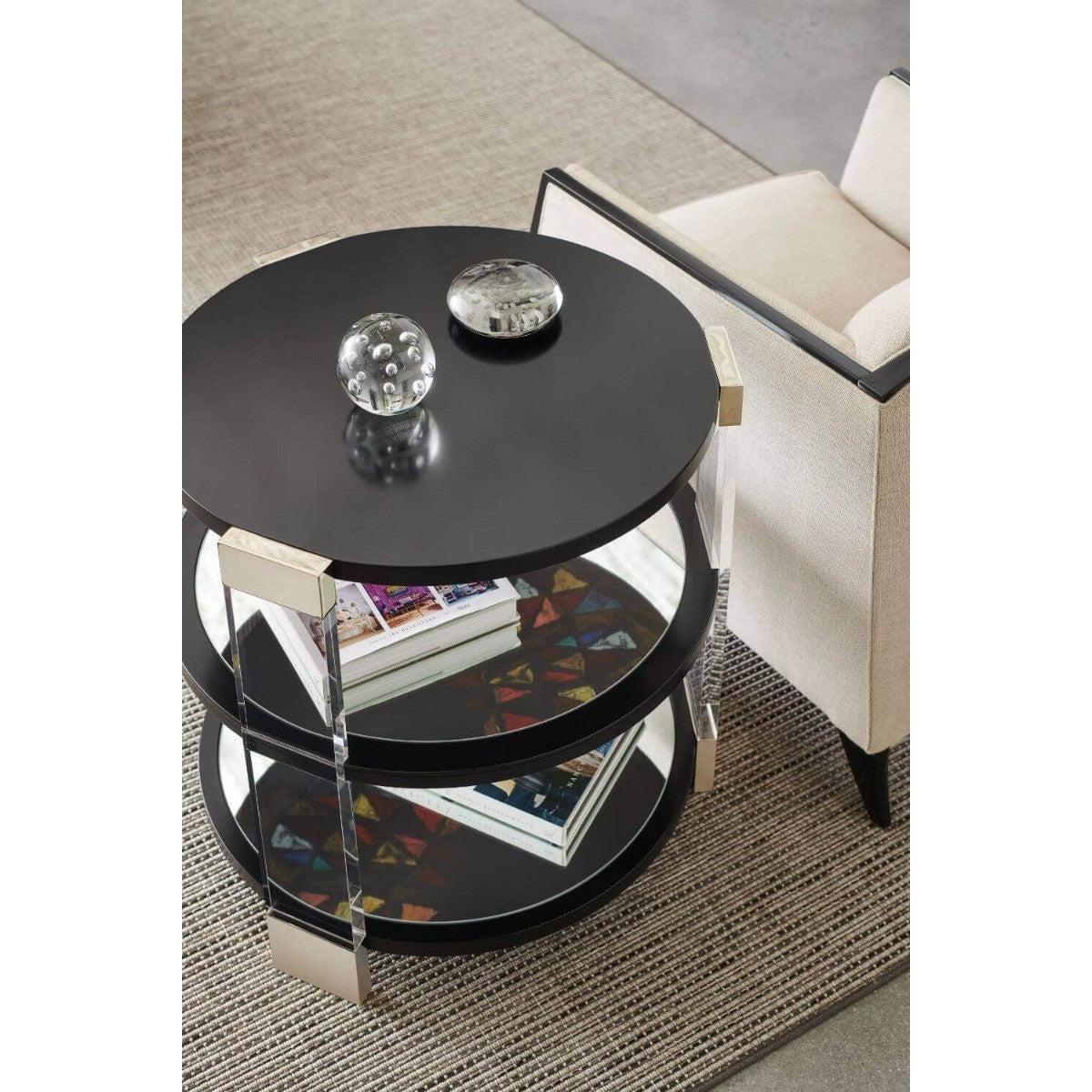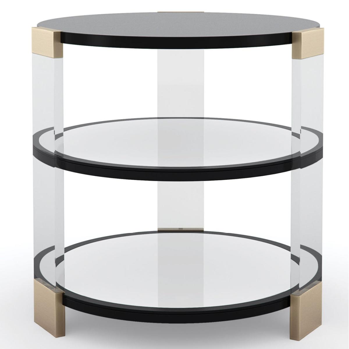 Artful and alluring, this round side table creates unexpected moments of colour, pattern, and reflection. A tabletop and two shelves in Tuxedo Black appear to float within clear acrylic posts for a look that stirs interest, without imposing. Adding to its allure, the centre and bottom shelves are mirrored to give a glimpse of Silk Road, original artwork by Iris Feng, digitally rendered and hand-applied beneath the shelf above. Metal trim in Whisper of Gold lends a shimmering accent. Case finished in Tuxedo Black. Acrylic posts. Center and bottom shelf tops are clear mirror to reflect Silk Road pattern on the underside of the shelf above. Metal trim in Whisper of Gold.