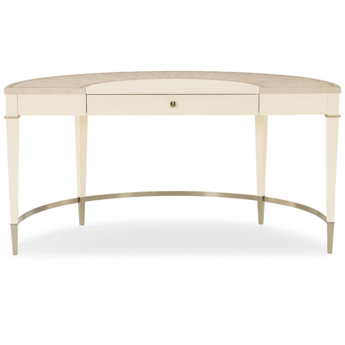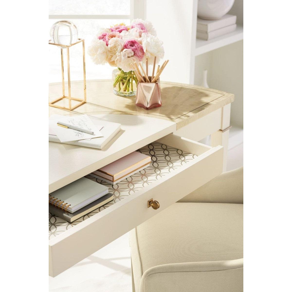 A captivating design, this dramatic desk is fit for a star‚ or anyone who wants to infuse their day with a touch of glamour. Its half-moon shape features a top of mottled Anegre veneers finished in an elegant Platinum Blonde finish with Platinum Blonde Madrona Burl border and a Golden Shimmer silkscreen detail. Its writing surface and drawer front are covered in an elegant ivory-coloured textured vinyl for fashionable utility. An undeniably shapely piece, it boasts an apron and tapered legs finished in Ivory Paint with Golden Shimmer Paint highlights. Meanwhile, metal ferrules and a rounded stretcher in plated Champagne Gold add a touch of bling to its distinctive design. Top is patterned Platinum Blonde with Platinum Blonde Burl border and Golden Shimmer silk screen line. Writing surface and drawer front are covered with Ivory coloured textured vinyl. Legs and aprons in Ivory with Golden Shimmer highlights. One storage drawer with side drawer guides, Ivory interior and silk screen pattern on bottom. Metal ferrules and stretcher in plated Champagne Gold. Ships KD. Space from floor to bottom stretcher: 4. 500". Apron height: 25. 250".