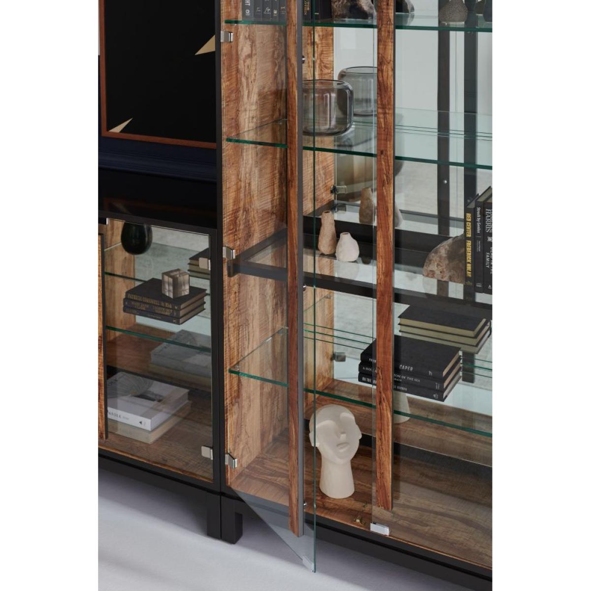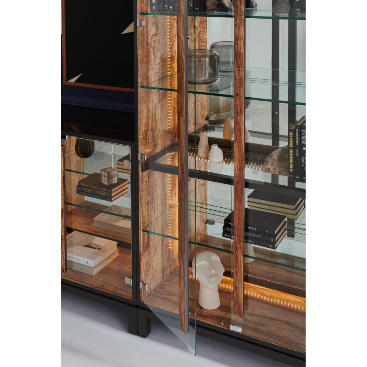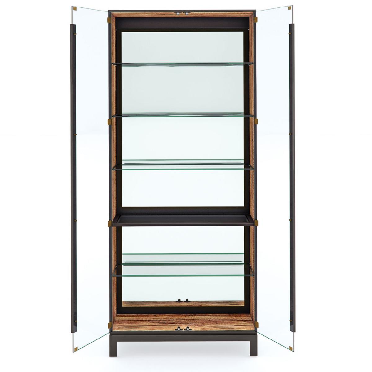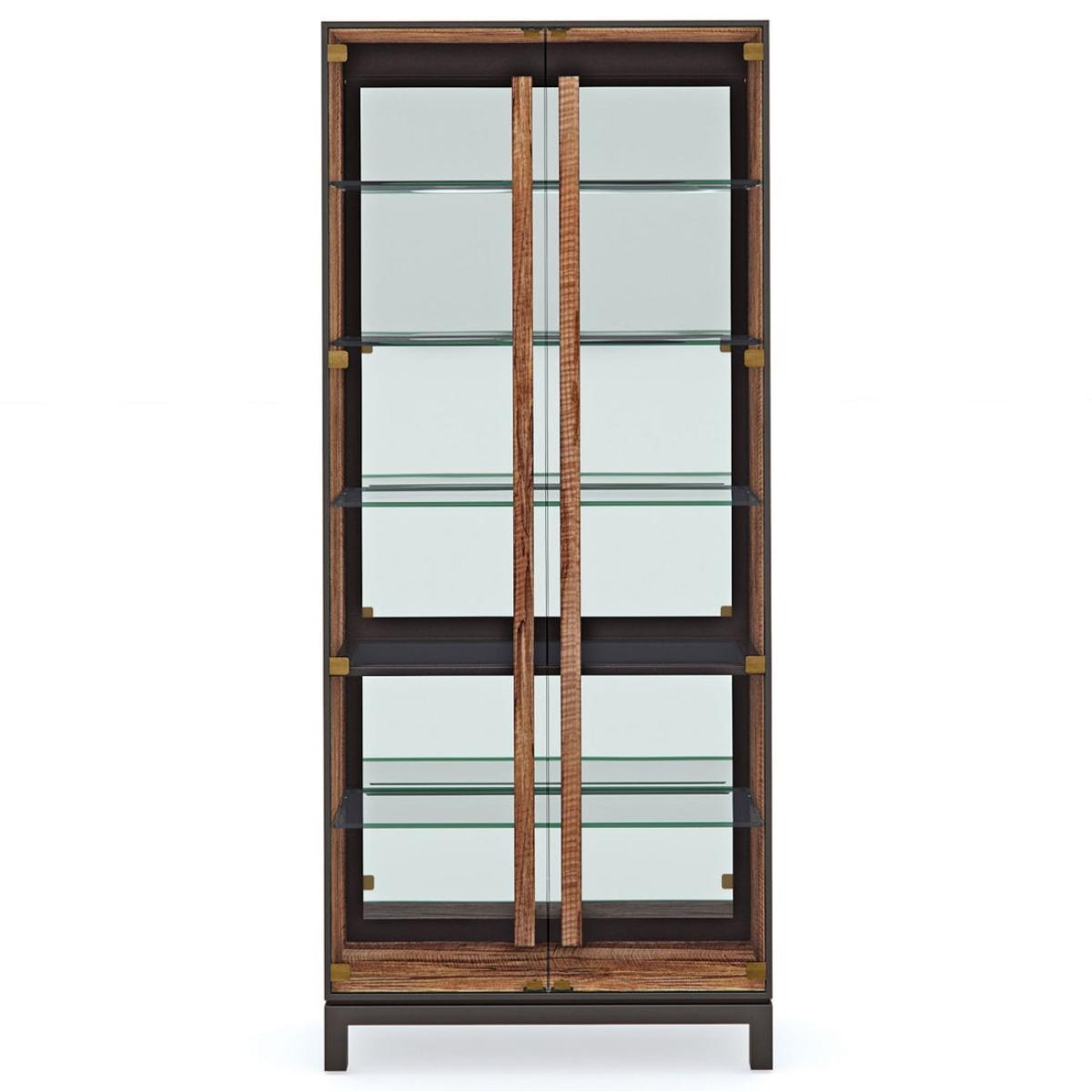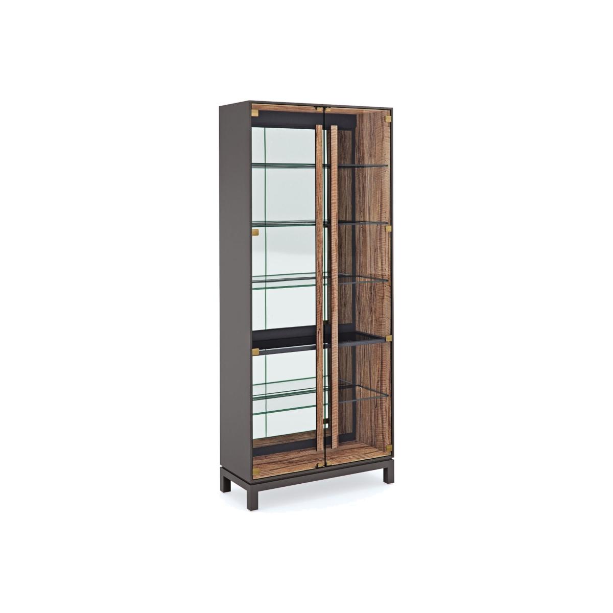 Integrating architecture with materials found in nature, this tall linear cabinet illuminates curated displays and collectables. Finished in Greenway, a complex mix of dark brown, black, and olive tones, the case exterior offers rich contrast to the door handles and interior, made from a digitally printed spalted maple. Clean-lined and visually light, it has two glass doors, four adjustable glass shelves, and a single, wood-framed glass shelf. Features a back-lit mirrored panel with LED lighting. Modular design lets you style in pairs with our Get a Handle On It cabinet to fill a wall and create your own display. Case finished in Greenway. Two glass doors. Interior finished in Naturally Organic with four adjustable glass shelves, one fixed wood framed glass shelf and back lit mirrored panel with LED lighting. Door hardware in Naturally Organic.