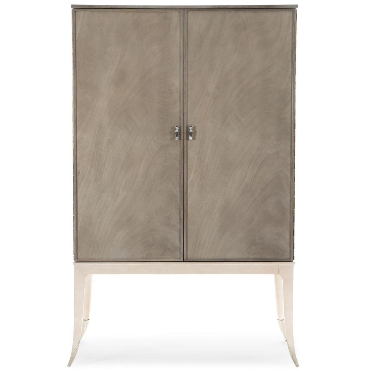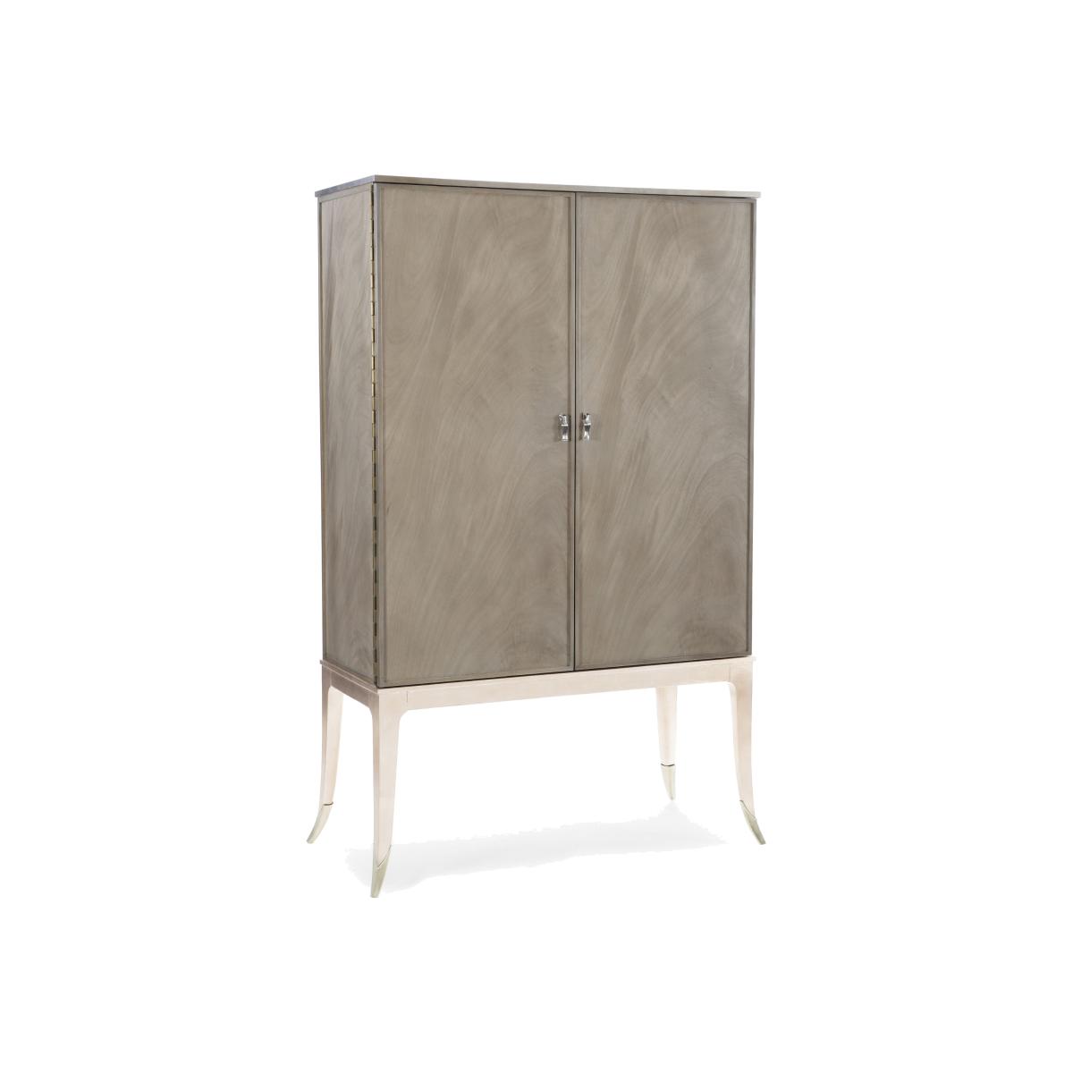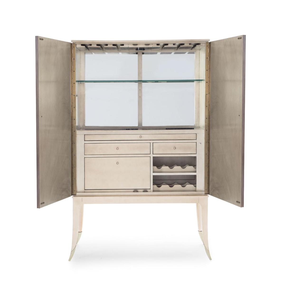 Don't be surprised if you end up dreaming about this stunning statement-piece. Its curated look is the culmination of artfully inspired details and stylish elements. Behind its two doors is generous storage and well-engineered functionality, including storage drawers, bottle storage, and a pull-out shelf. Whether open or closed, the aesthetic is one of understated luxury. Case in Silver Fox with Silver Paint interior. Legs in Soft Silver Leaf. Two doors with piano (continuous) hinges. Open top area with stone bottom, small glass shelf and stemware storage at top. Mirrored on inside back. Pull-out shelf with laminated surface. One drawer on right side, with two wine bottle storage areas. Metal ferrules in Lightly Brushed Chrome.
