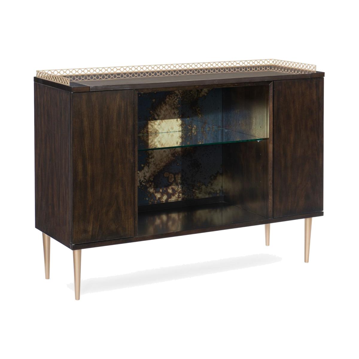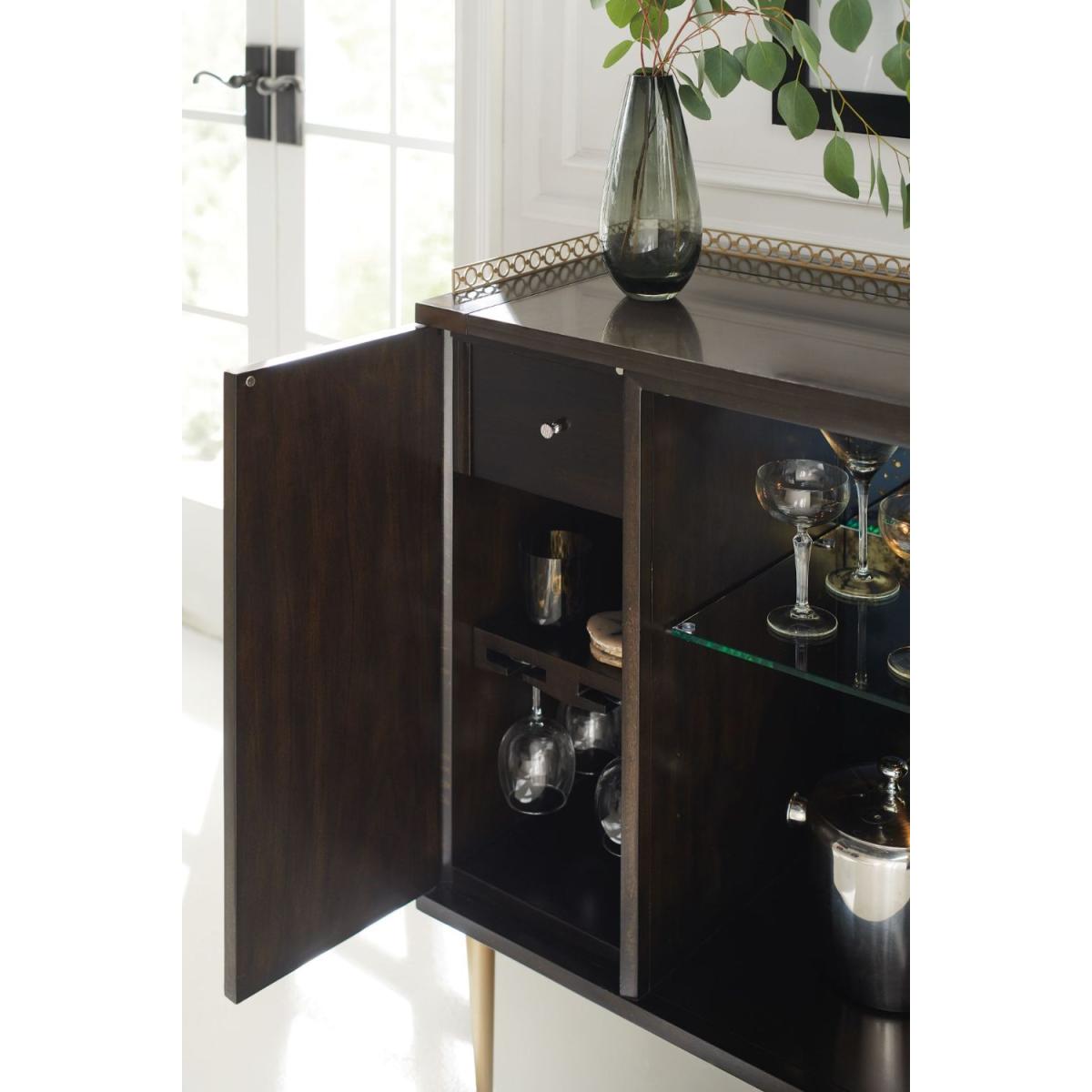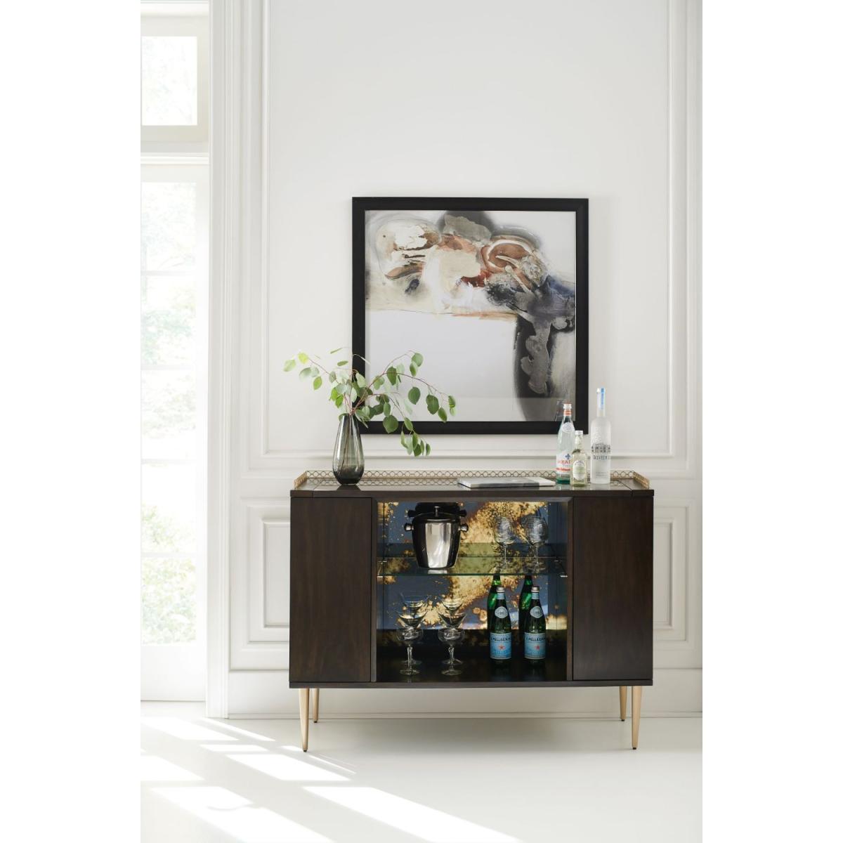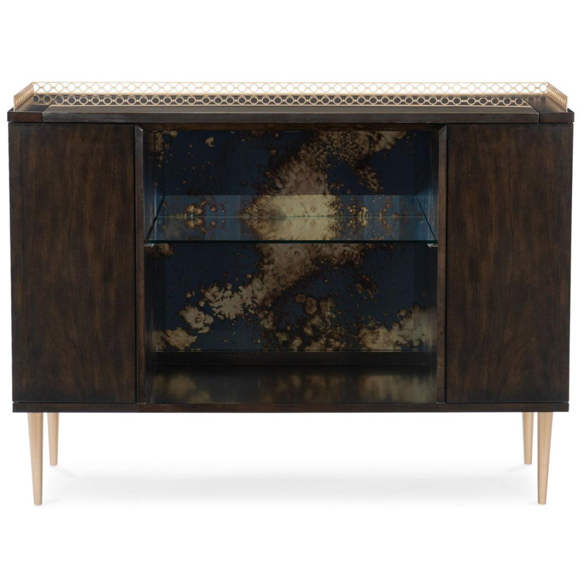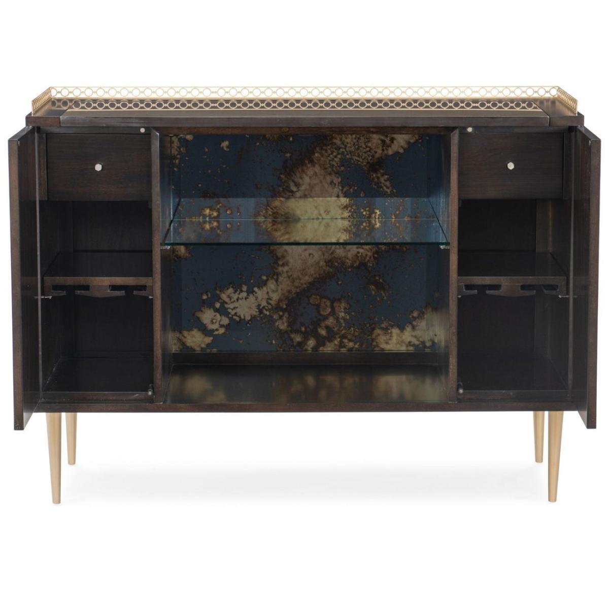 With its good looks and thoughtful detailing, In Good Spirits elevates the art of entertaining. Finished in bold Bronzed Ebony, it features a Koris Coffee Stone top outlined with a pierced metal gallery finished in Warm Silver Metallic Paint. An open centre area reveals an antique-mirrored back and glass shelf illuminated by a touch light. For storage and serving, its sophisticated character is sure to impress. Case in Bronzed Ebony. Top is Koris Coffee stone. Pierced metal gallery in Warm Silver Metallic Paint. Open center area with antique mirrored back and glass shelf. Interior light with touch button. Behind two end doors is one top drawer with undermount guides and adjustable shelf. Legs in Warm Silver Metallic Paint. Interior in Warm Silver Metallic Paint.