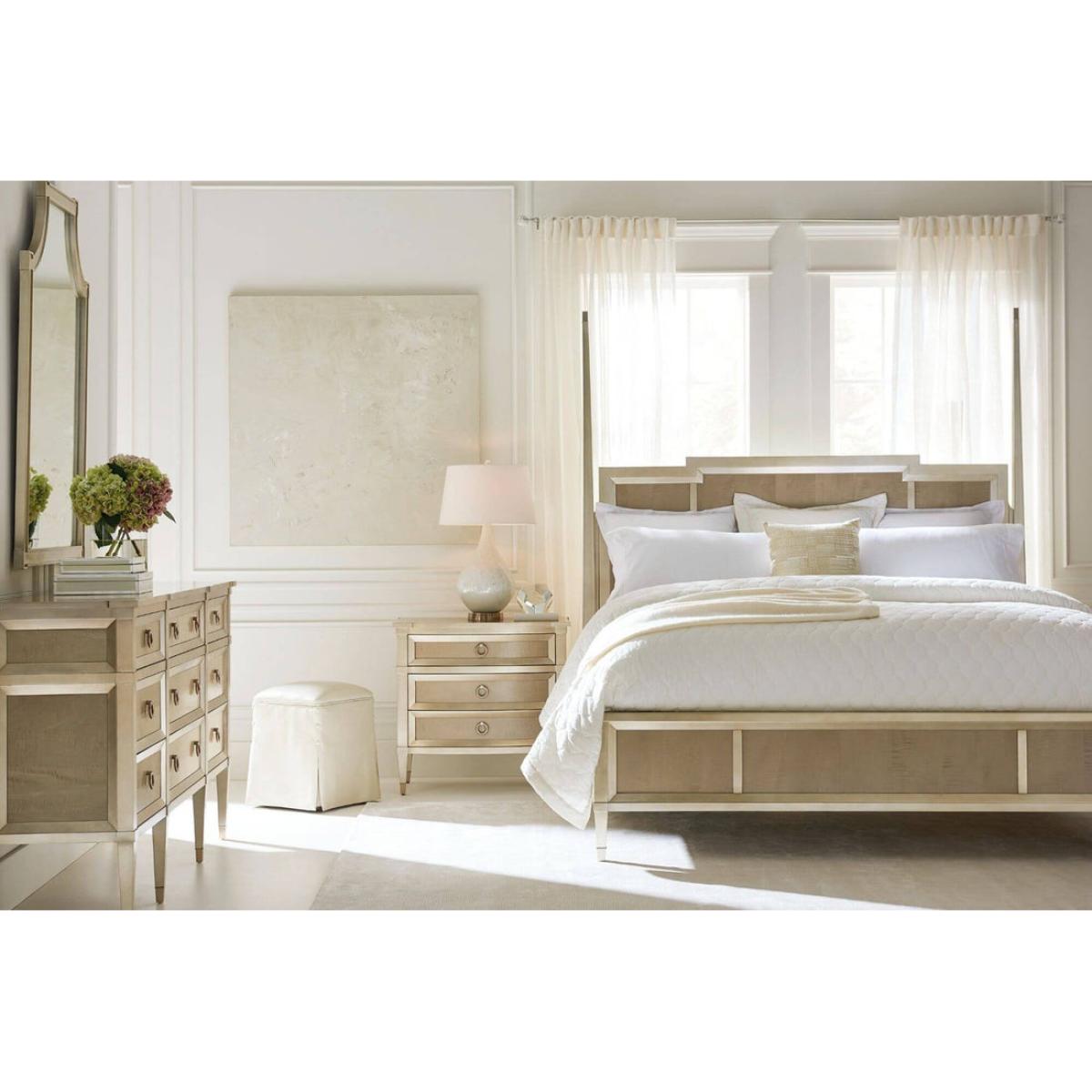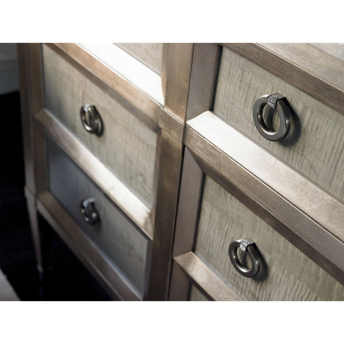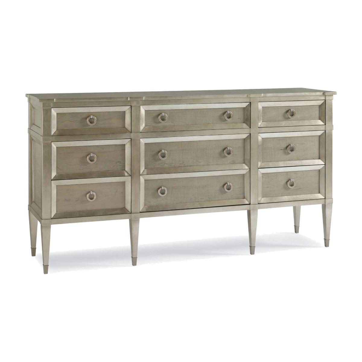Purely classic styles appeal to most designers for their timeless qualities. In this example, highly figured Tiger Maple veneers are washed in a soft Smoke finish, and framed by a Taupe Silver Leaf application which adds highlights. At 76-inches wide, use Italian Dressing as a statement piece for the bedroom or dining room. The tall legs help to give this profile an up-to-date look. Nine drawers offer ample storage and you'll be delighted to see the silk-screened trellis pattern each time you open the top row of drawers. Panels in Smoke with solids and top in Taupe Silver Leaf. Nine drawers. Top drawers with soft-close guides. Jewelry tray in top left drawer. Drawer interiors in Platinum. Case ships with one set of hardware. Metal ferrules and hardware in Brush Taupe.