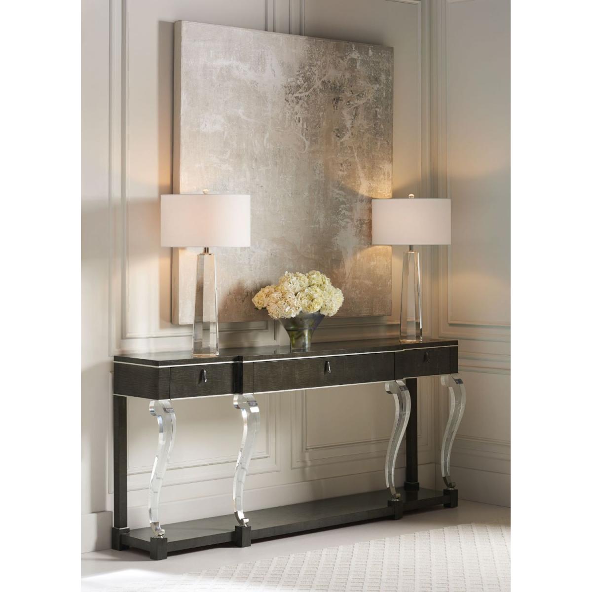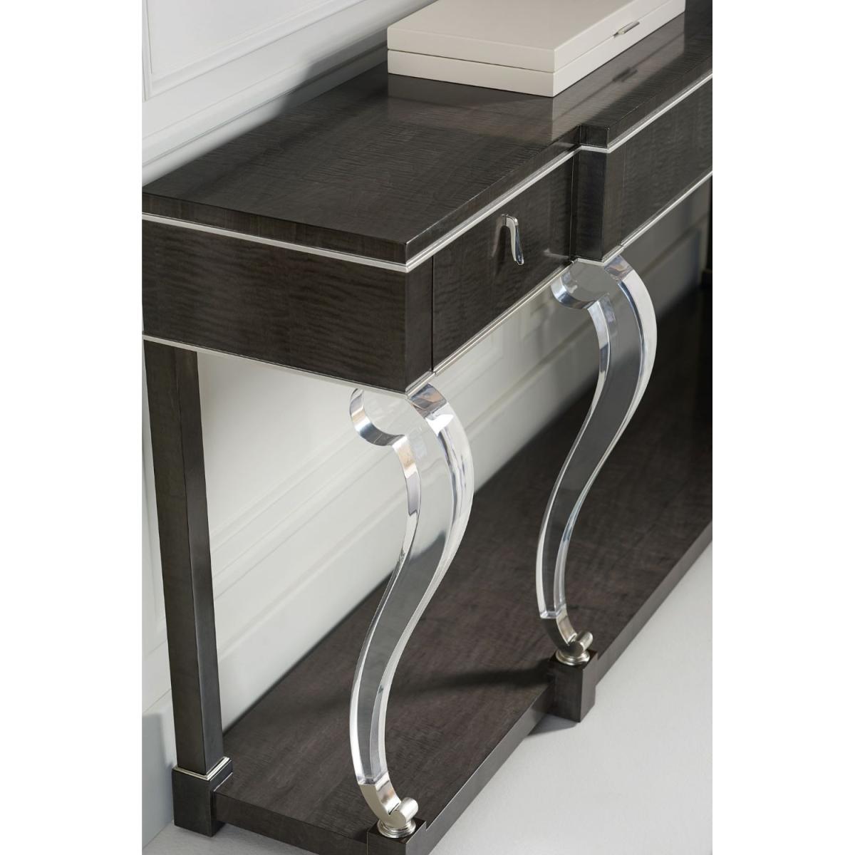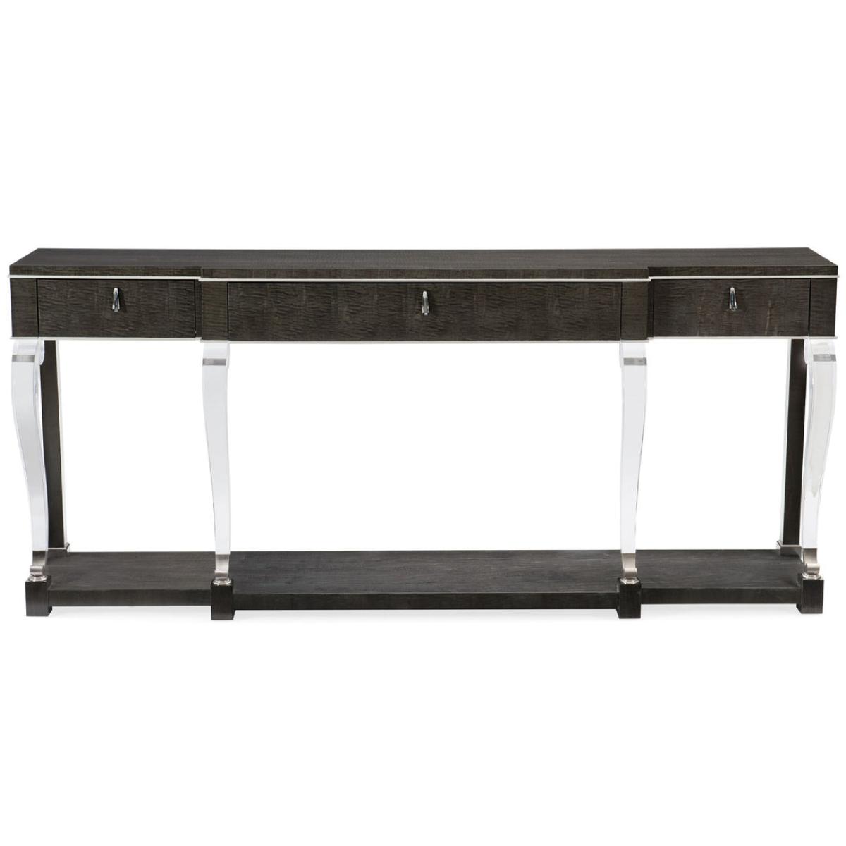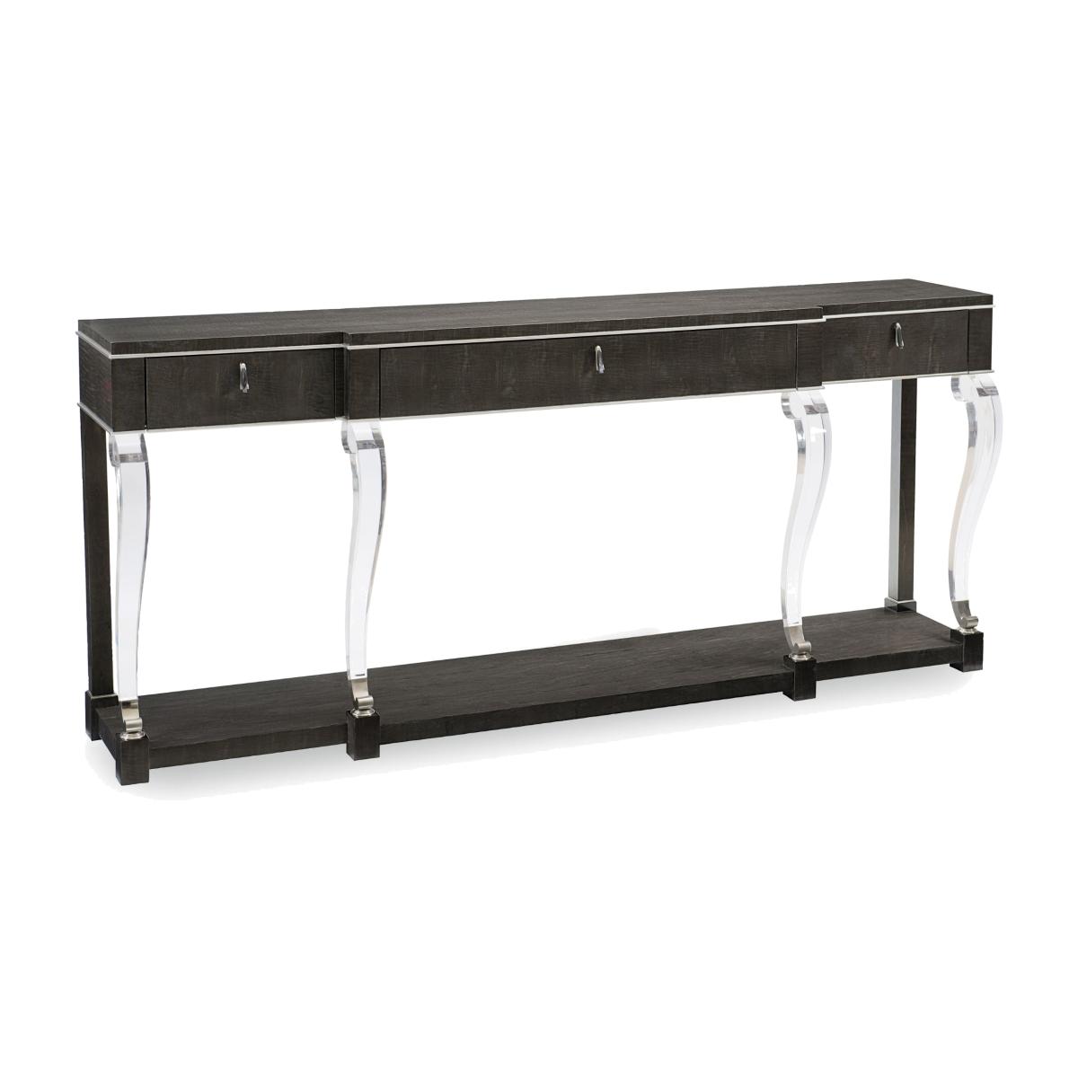 Add uncommon elegance to a space with this console‚ the perfect piece for a well-composed display or favourite objet d'art. Curvaceous front legs are crafted from acrylic and provide contrast to the rich Midnight Maple finish on its Black Curly Maple veneers. Metal accents in Polished Chrome add a finished look. Altogether, the lasting impression is one of timeless contemporary sophistication. Case in Midnight Maple. Acrylic legs with metal collar accents. Three drawers with undermount soft-close guides. Drawer interiors in Midnight. Metal ferrules in Polished Chrome.