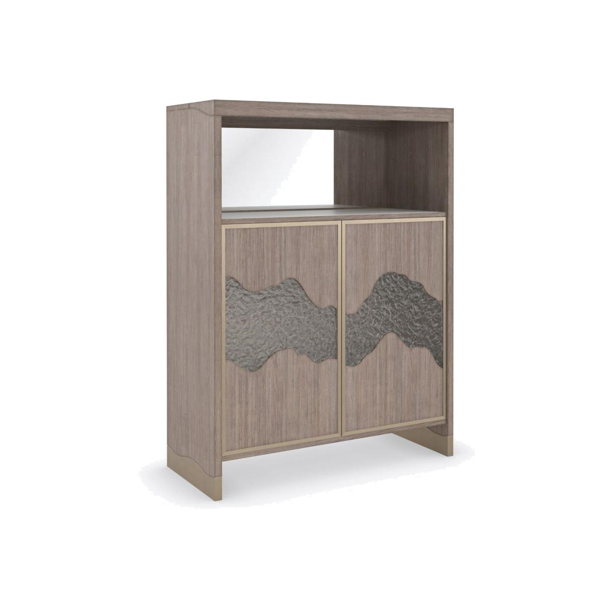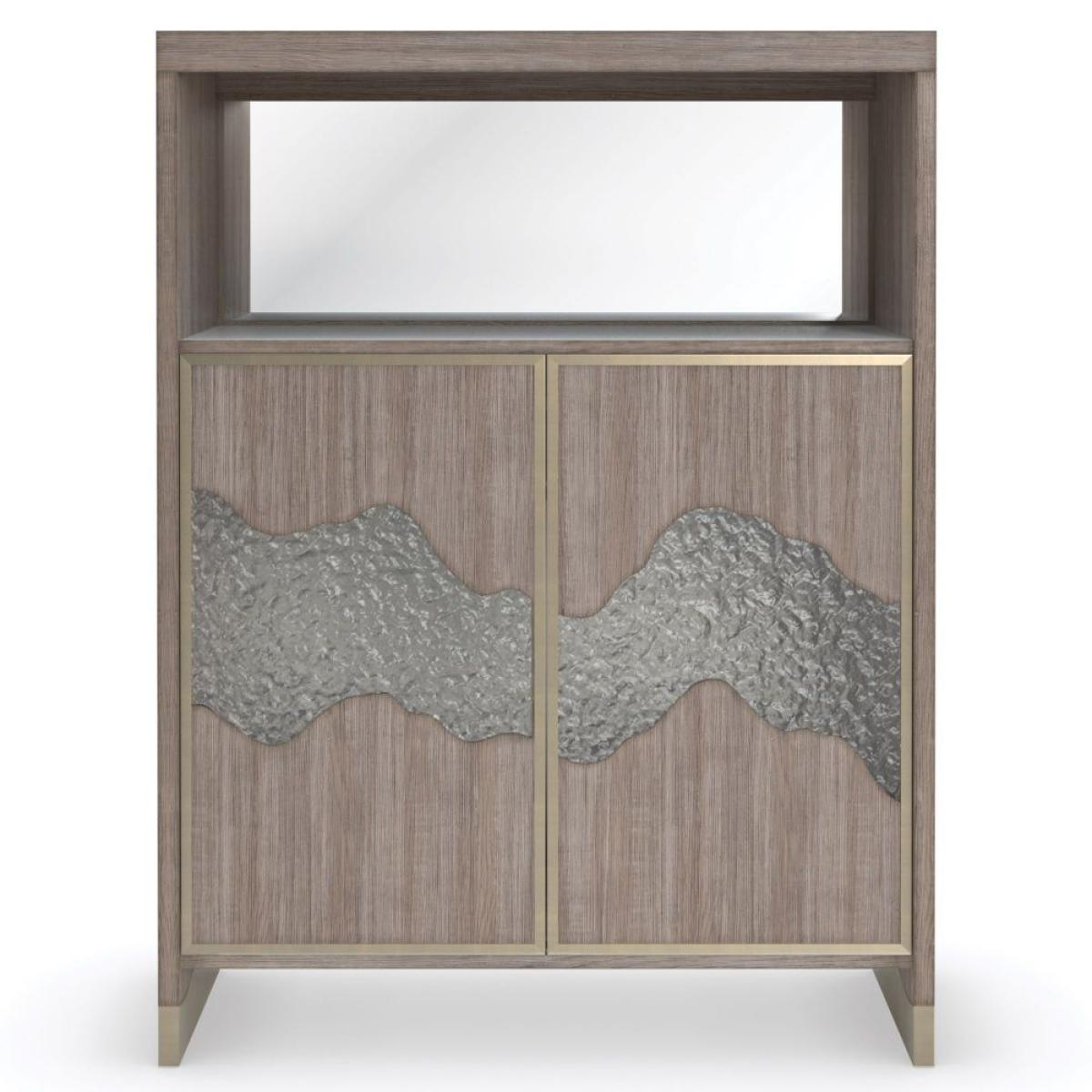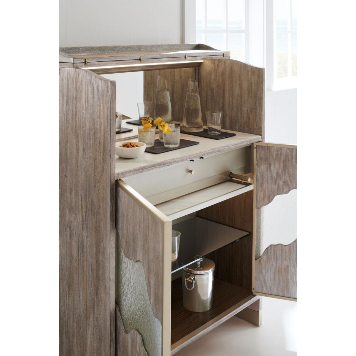 A reflection of beauty and fluidity found in the natural world, this bar cabinet mixes organic materials with the soft sheen of metal. Touch-latch doors are crafted with textured acrylic panels that recall the flow of a meandering river. Elevating function, a flip top lets you access space for pouring and mixing, while a removable stone tray slides under the interior drawer for ease of serving. Offers abundant storage with adjustable glass shelves and a drawer for keeping mixing tools, coasters, and linens. A single LED light illuminates the work surface, and for added ambiance, an LED-lit interior emits a soft glow behind the decorative inset door panels. Frame is highly distressed Pine solids and Fir veneers finished in Driftwood. Interior end panel backs behind the door and bottom panel in Driftwood. Top flips back for easy access to a stone shelf. Two touch latch doors have individual custom cast textured glass panels with a metal frame perimeter in Neutral Metallic. Cast glass inserts are lightly shaded on the back for frosting effect. Behind the doors is a 3/8 adjustable glass shelf (tempered), a removable tray with stone surface and a drawer with side guides. Interior is LED lighted to provide a soft glow behind the frosted glass. Upper open storage area is lighted with a mirrored back and stone surface. Interior is finished in Neutral Metallic.