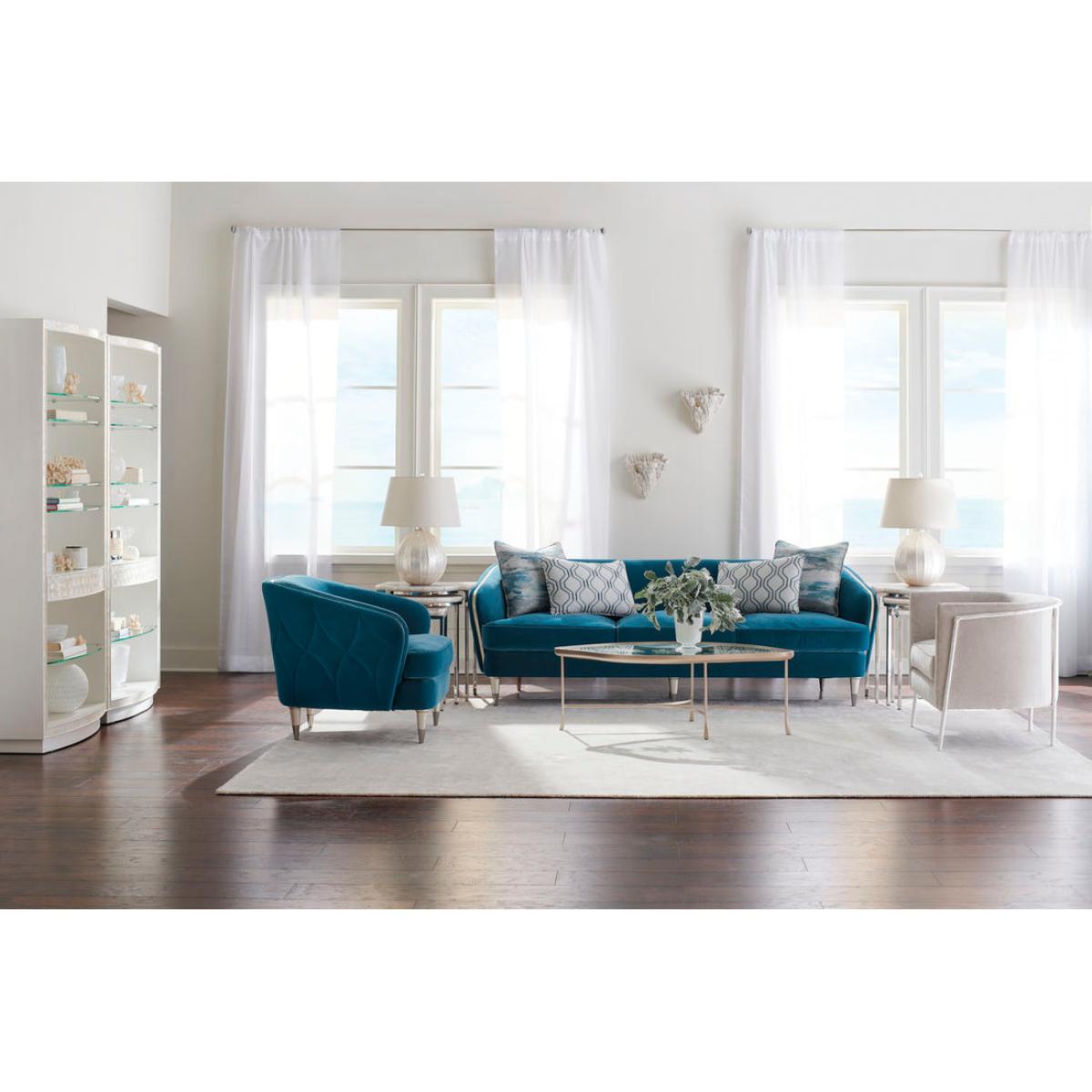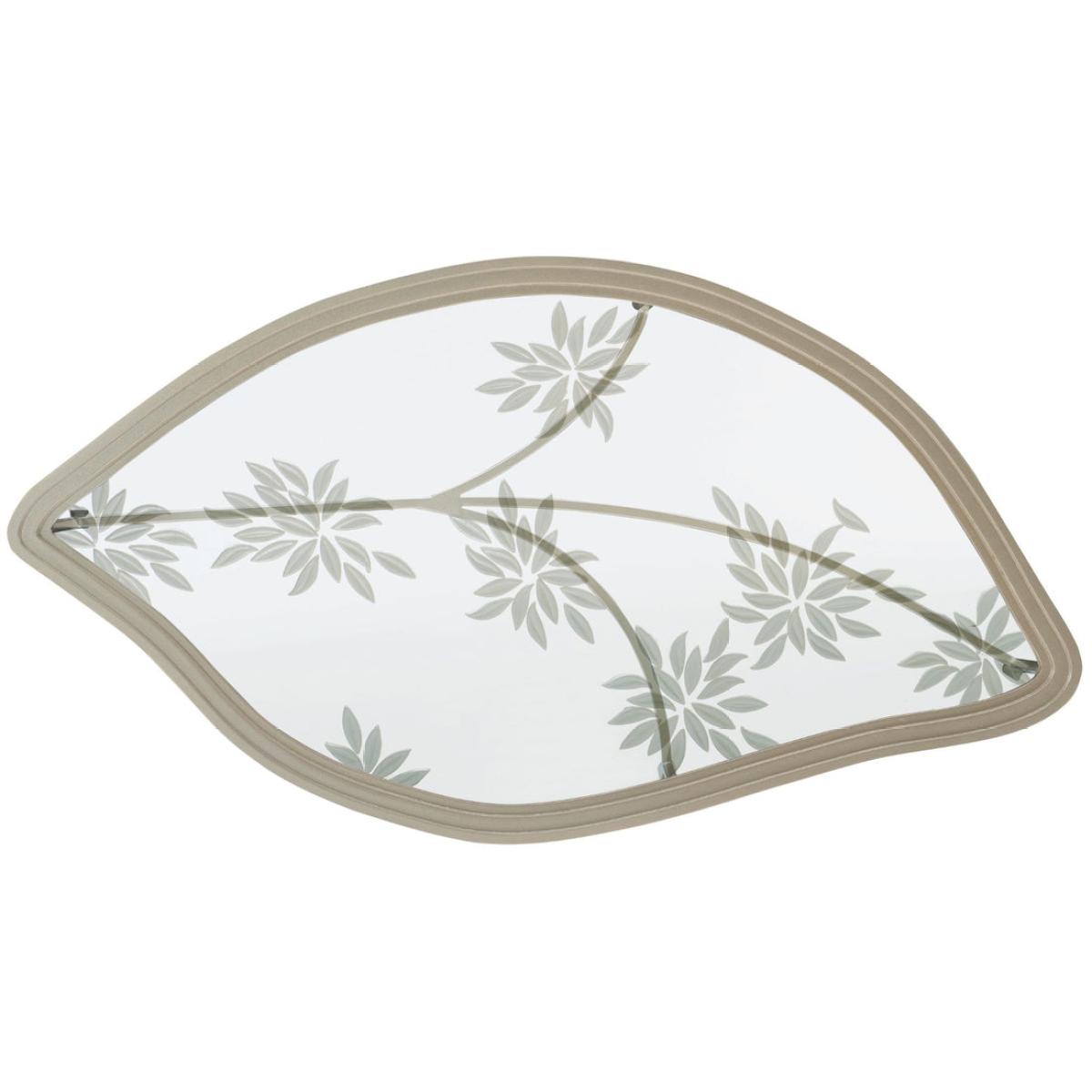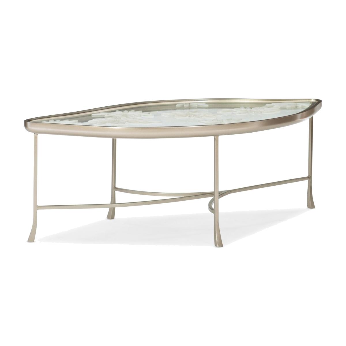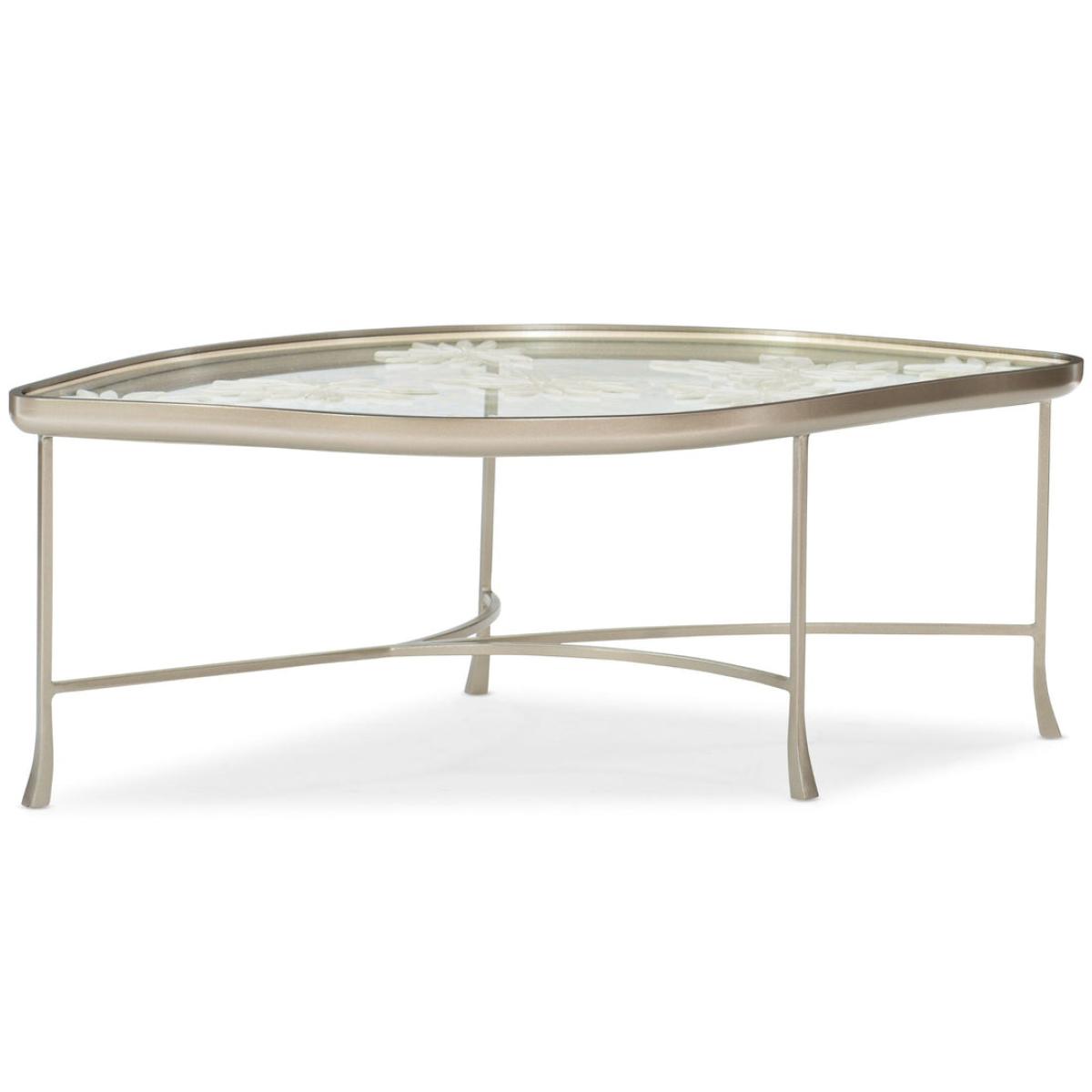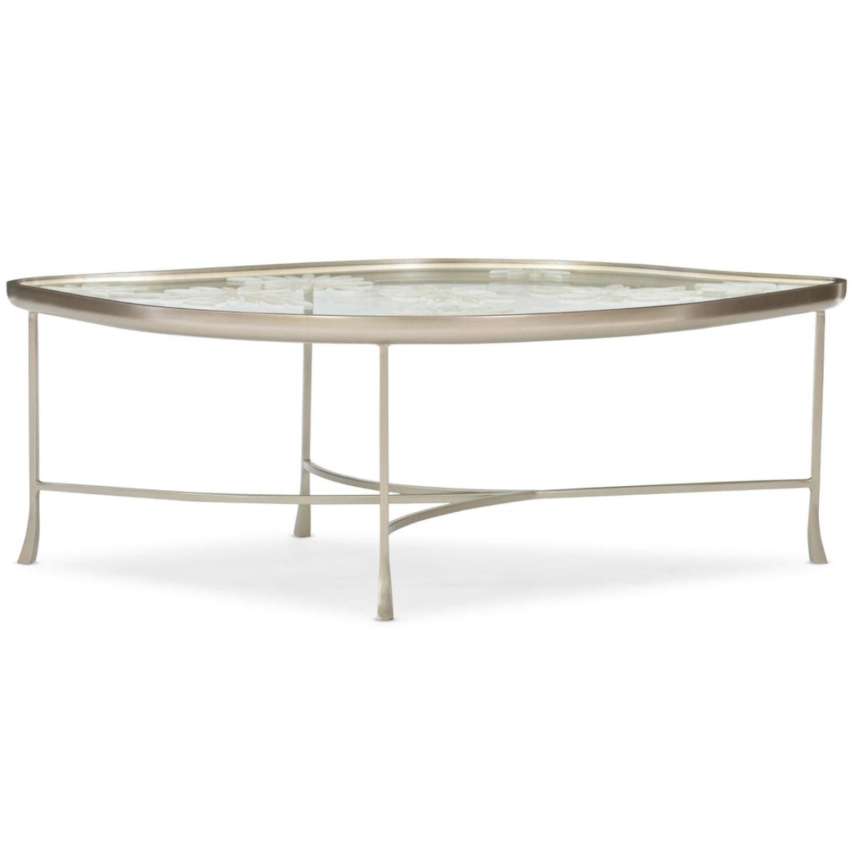 Discover the beauty of nature with this elegant flora-inspired cocktail table. Its softly rounded shape is outlined in a cast-metal frame finished in a versatile shade of Neutral Metallic. Ideal for both casual and formal furniture arrangements, this enchanting table features a unique design of cast flower petals (encased within tempered glass) inspired by leaves drifting in an autumn breeze. Cast metal frame finished in Neutral Metallic. Tempered glass top with encased cast leaf arrangement.