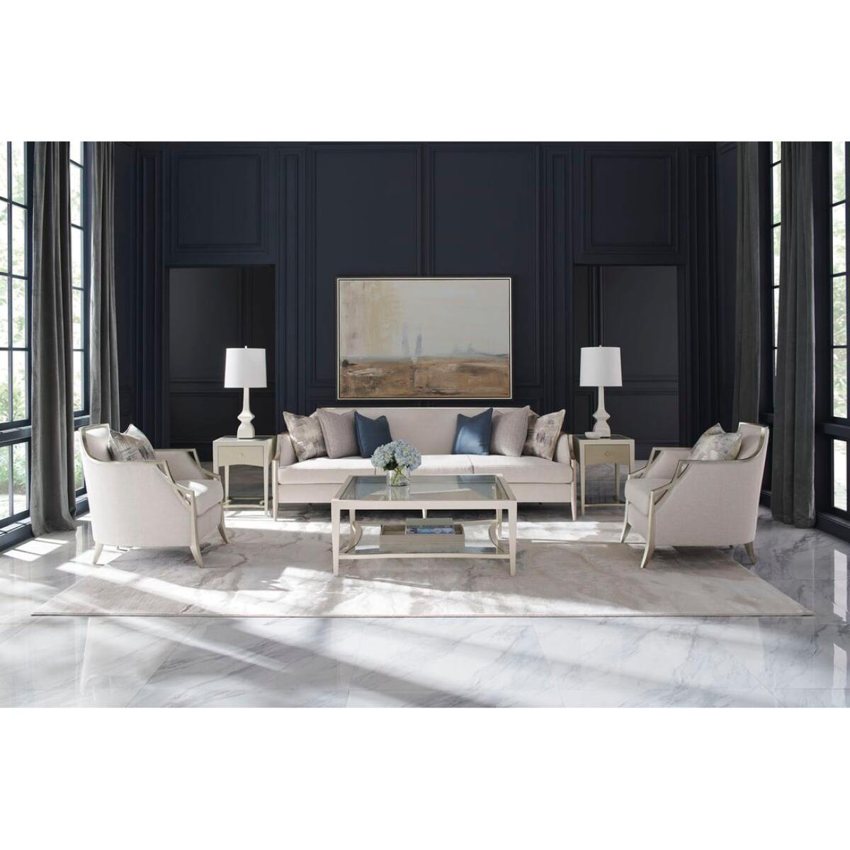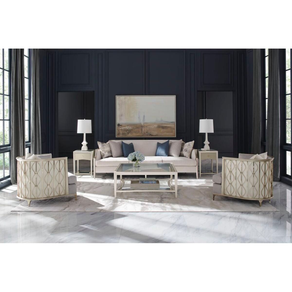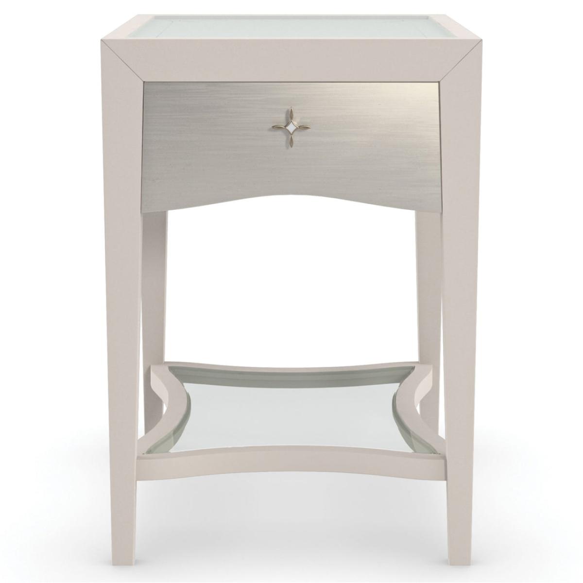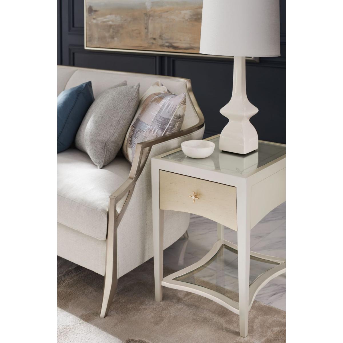A charming addition to any interior, this petite side table draws the eye with subtle curves and soft silver tones. Its Matte Pearl finish brings out the inherent beauty of maple veneers, accentuated by a single, soft-close drawer in Silver Charm, and jewellery-like hardware with a ceramic inset. Adding a note of distinction: a glass top with an elegant pinstripe design screen-printed in Soft Silver Paint. Case finished in Matte Pearl. Glass top with screen-printed pinstriping on bottom of glass in Soft Silver Paint. One drawer with front in Dusty Silver with soft close undermount guides.