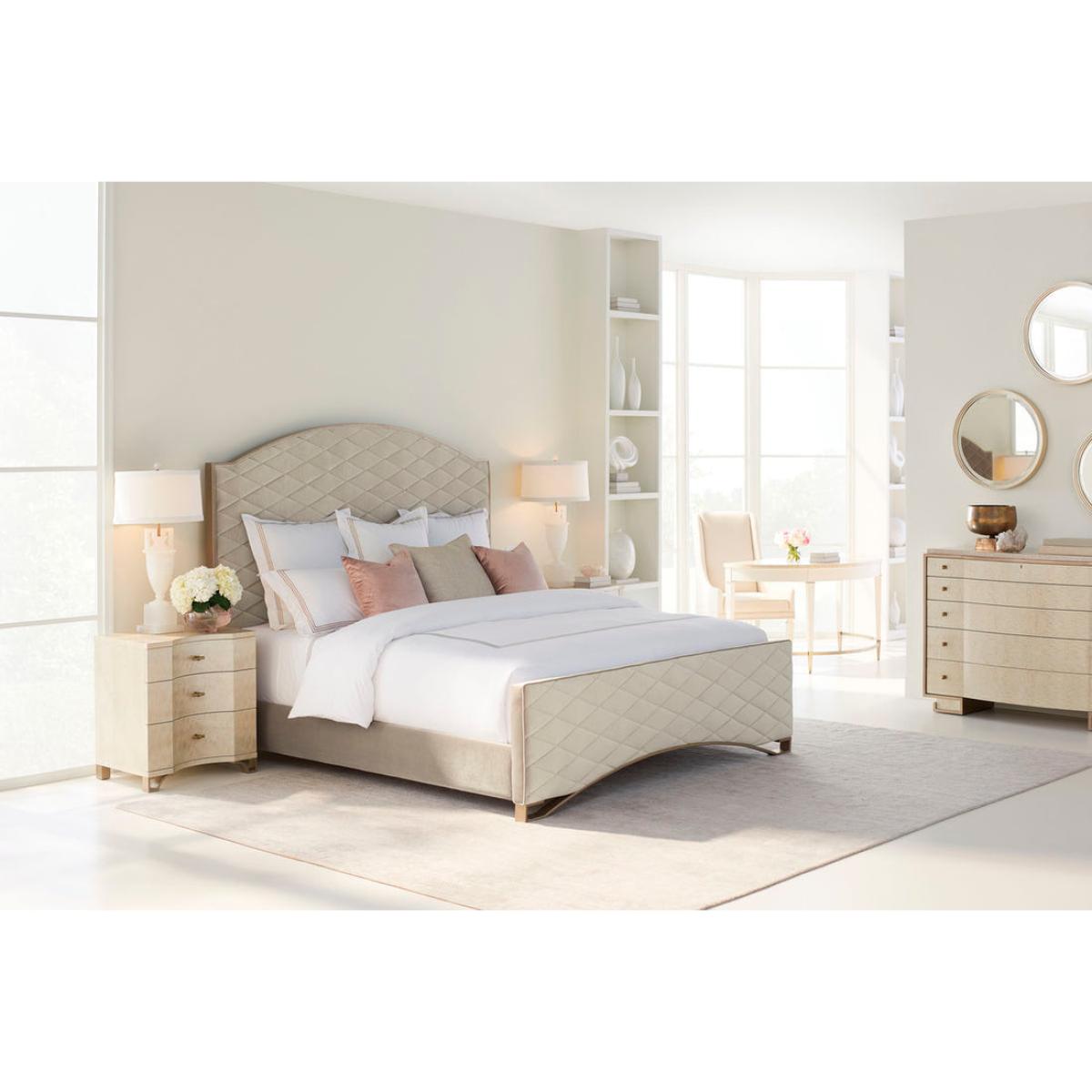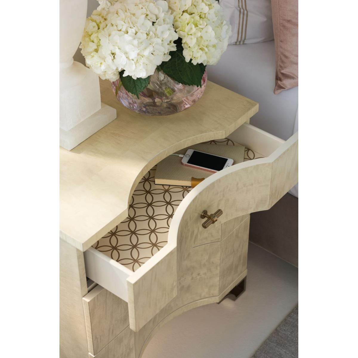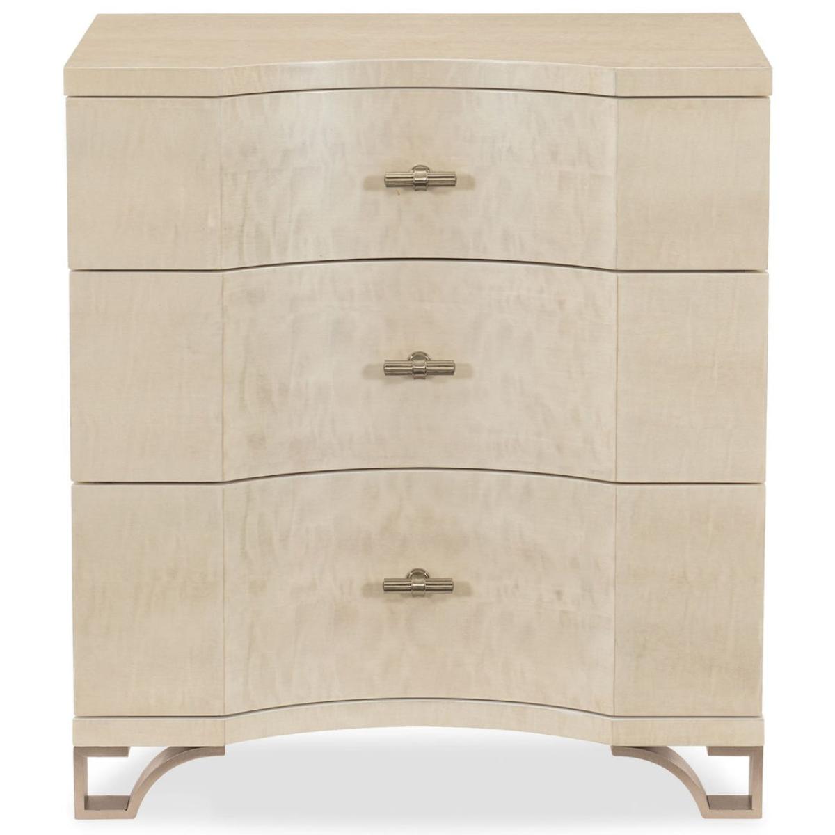 Big on style yet perfectly proportioned, this unique case piece features an expressive bowed front. An unexpected treasure, it's crafted of exotic mottled Anegre veneers and finished in an exquisite Platinum Blonde finish that will complement any decor style. Bracket feet forged of metal and finished in Golden Shimmer Paint add a fashionable touch to its base. The ultimate pairing for a bedside, it boasts three drawers‚ each featuring an attractive interior painted in ivory. Case is finished in Platinum Blonde. Three drawers with undermount soft-close drawer guides. Metal base feet bracket in Golden Shimmer. Drawer interiors in Ivory. Silk Screen pattern in top drawer.