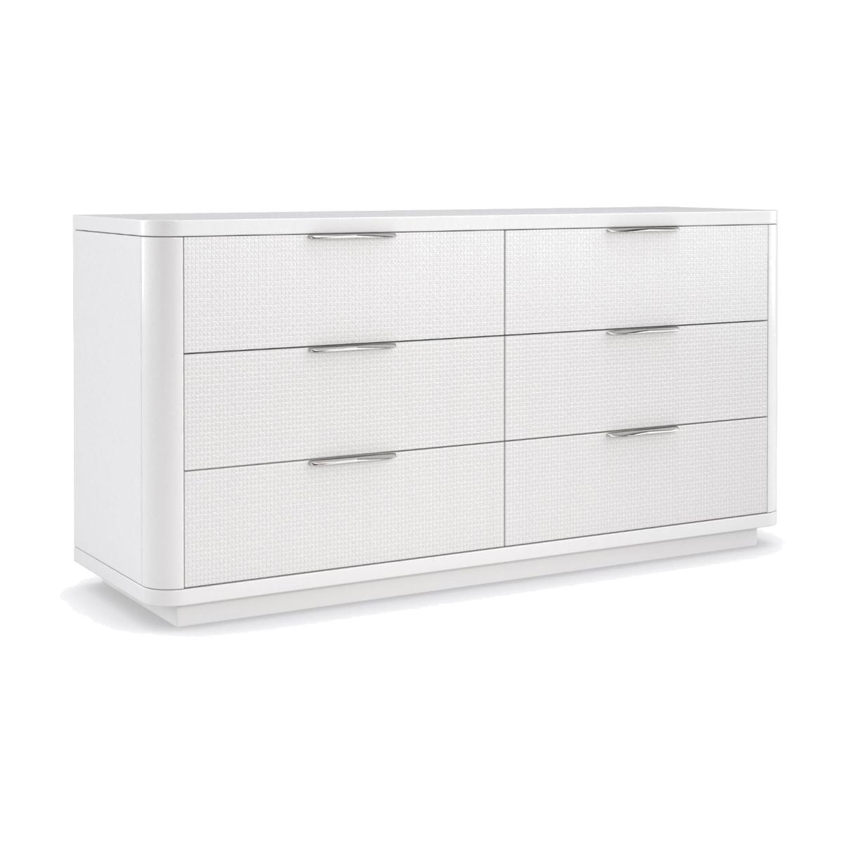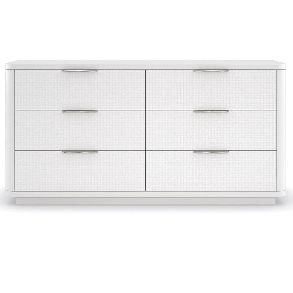 With gently rounded edges and a welcoming texture, this spacious six-drawer dresser is quietly captivating in a Cloud White finish. Carved drawer fronts feature a woven mini-tile motif and finger-cup pulls to keep the look clean. Style with our In Touch and Touch Base bedside tables to create a calming retreat for yourself or guests. Case finished in Cloud White Six drawers with fronts in woven resin motif pattern and undermount soft close guides. Drawer interior in Cloud White.