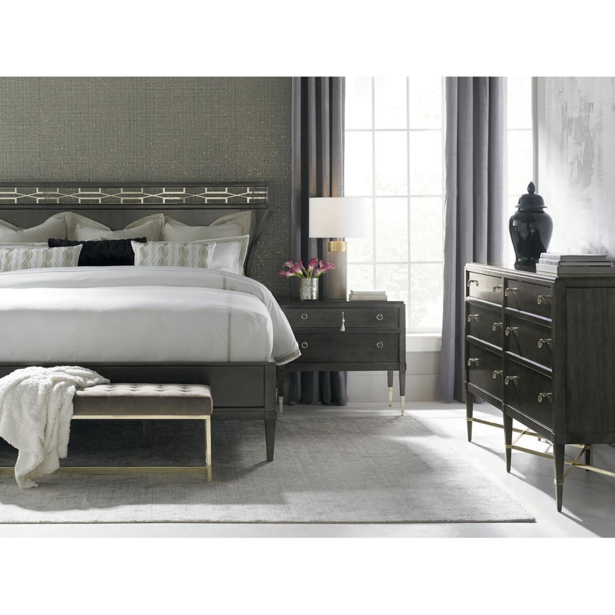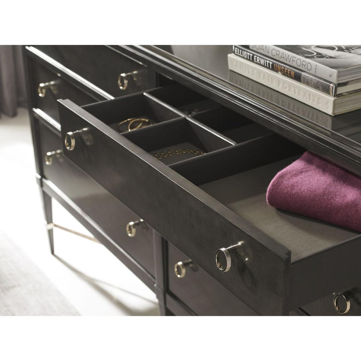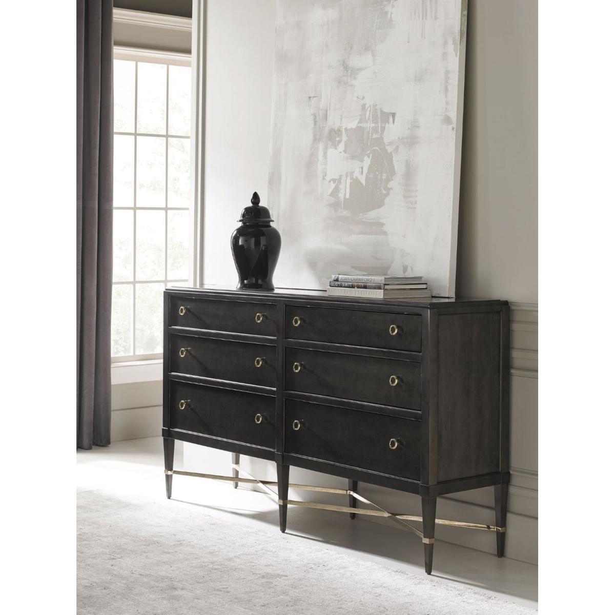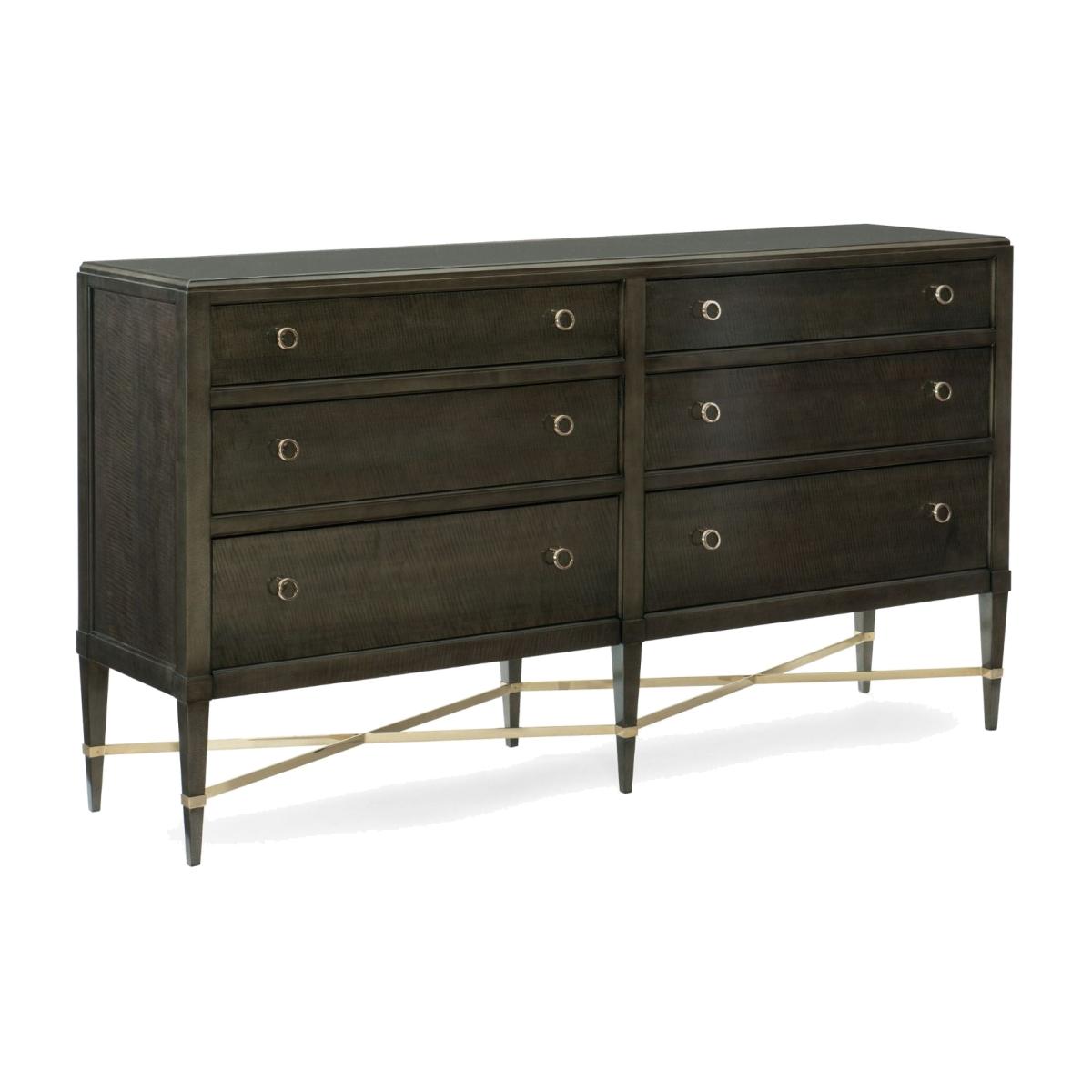 Masterpiece is a dresser with hidden secrets. Its linear frame in Charcoal Anegre is a modern interpretation on classic Hepplewhite designs. Its clean façade shows off the Whisper of Gold custom round ribbed pulls and thin crisscrossed stretchers between the tall square-tapered legs. Six drawers, painted on the inside in Seal Skin, are generous in size. The top of the piece is embedded with dark glass. The top right drawer has dividers and a taupe/charcoal herringbone pad. The front of the left drawer drops down. At the bottom of the piece are two hidden drawers for papers and valuables. This is a signature dresser with dignified style. Six drawers with undermount soft-close guides. Two hidden drawers in bottom front rail with side guides. Metal stretcher in Whisper of Gold. Tempered glass top painted Seal Skin. Drawer interiors in Seal Skin. Herringbone vinyl pad in bottom of top drawer and hidden drawer. Top left drawer has drop down front construction.