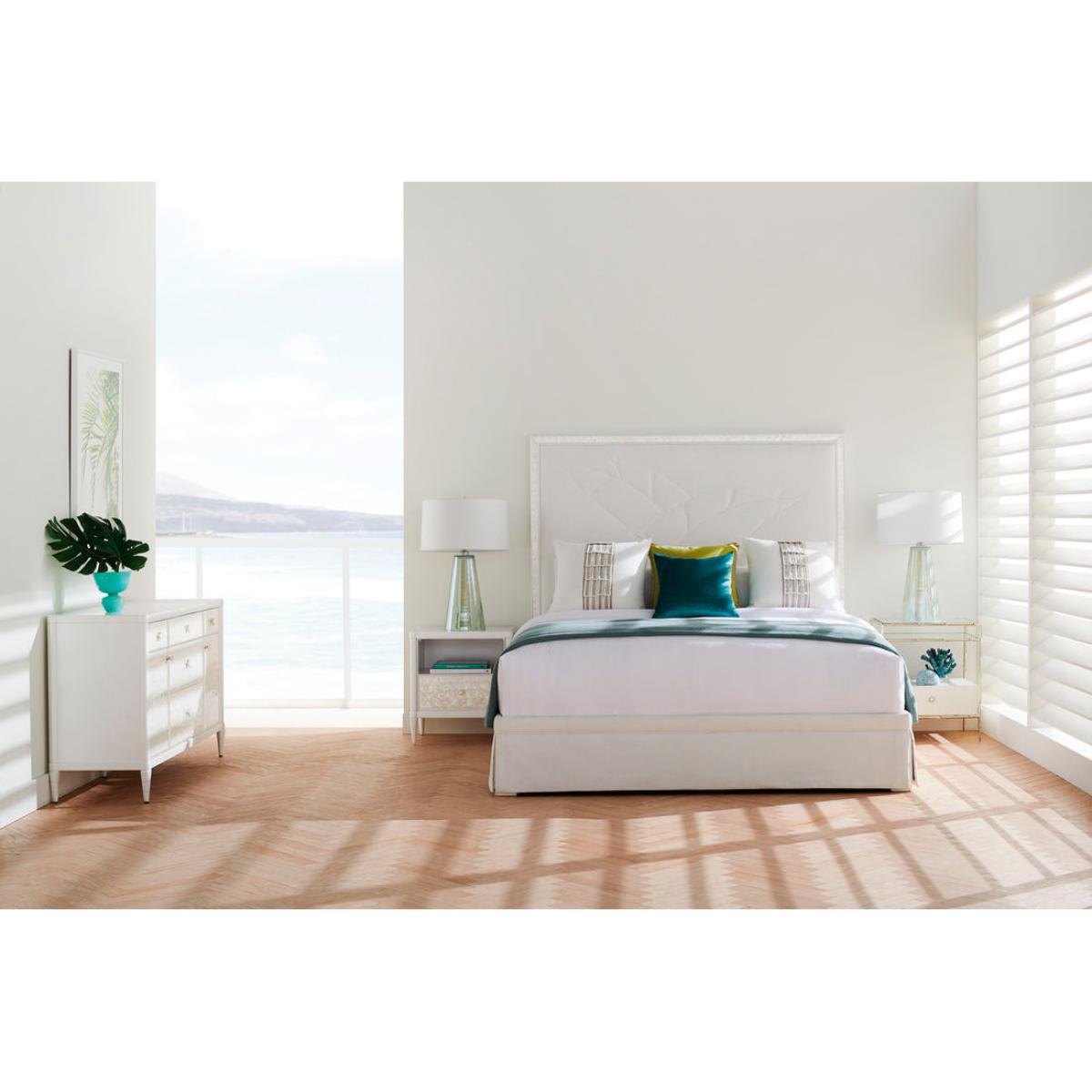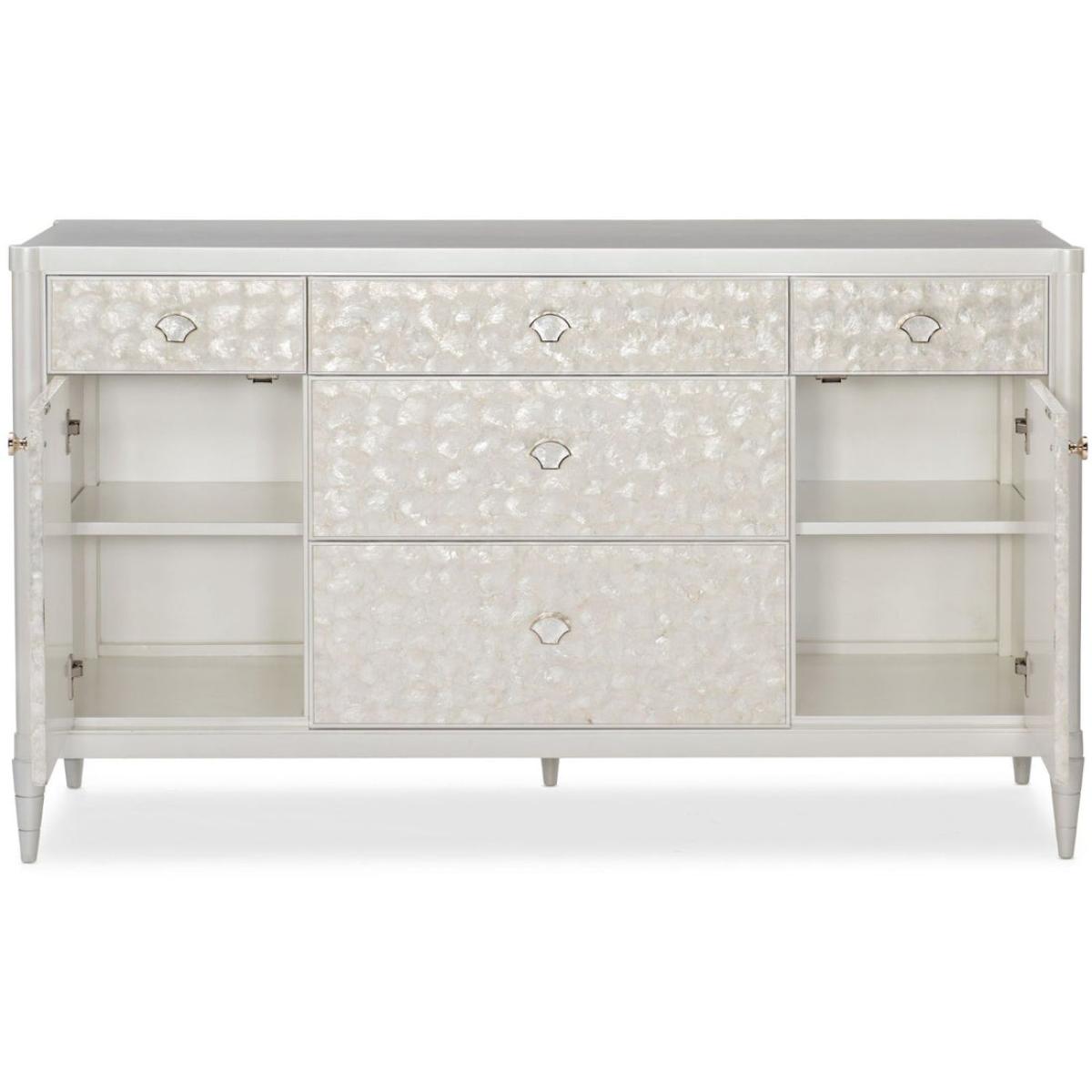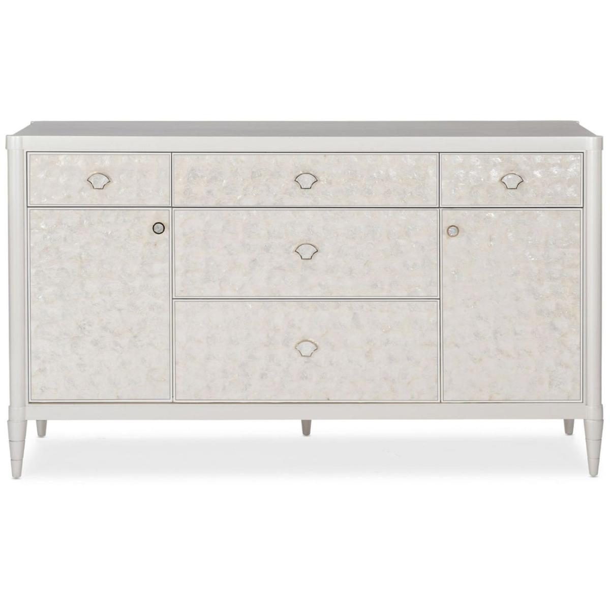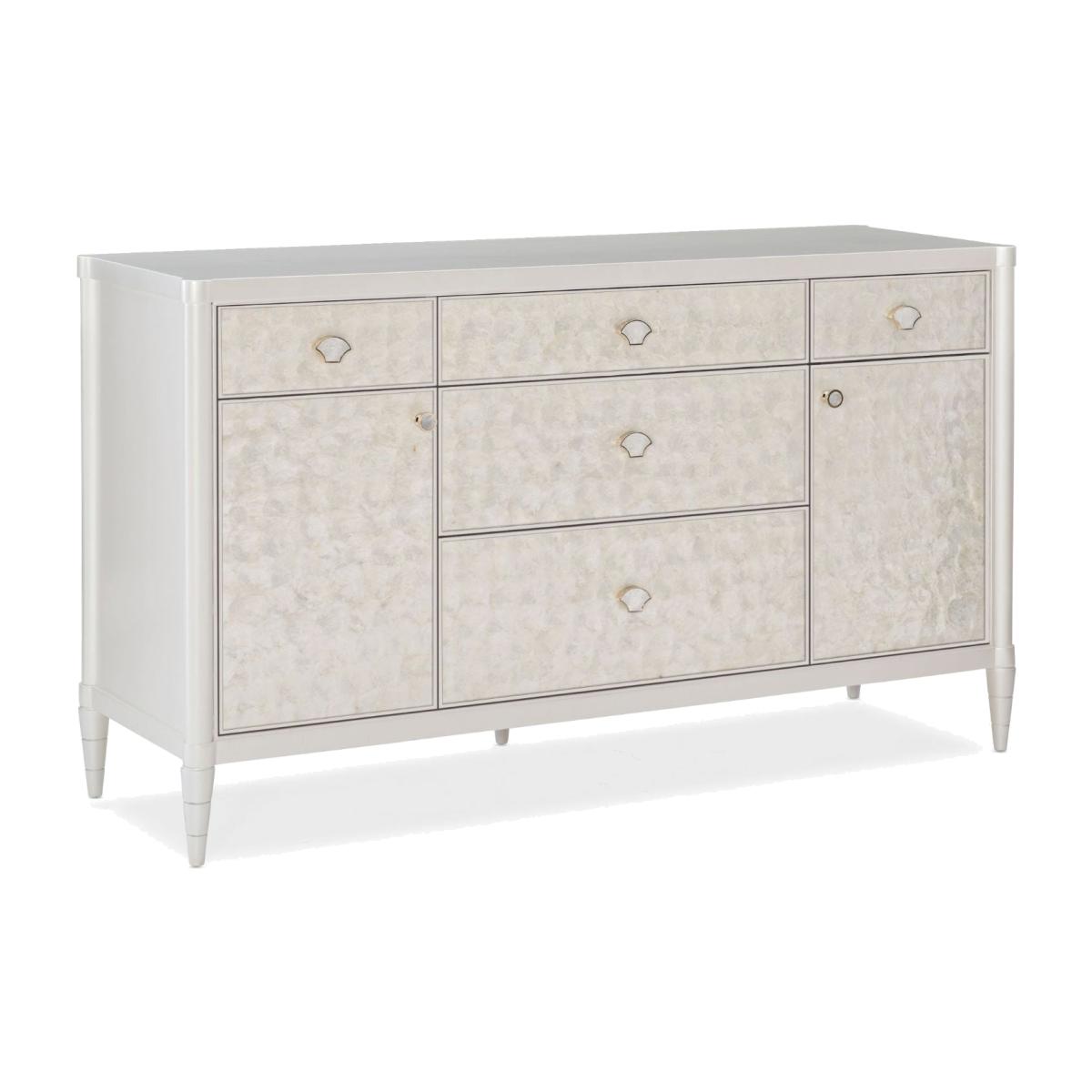 Imagine a piece of furniture so thoughtfully designed it would work equally well in the dining room or bedroom‚ wouldn't it be as brilliant as a moonrise? You'll find it here in this elegantly versatile case piece highlighted in a softly pearlescent Oyster finish. Shimmering Capiz shells adorn its front and lend an element of modern coastal elegance. Perfect for the bedroom or the dining room, its shapely silhouette sits upon distinctive bamboo-inspired legs that convey modern sophistication. Peek inside its five drawers and behind its two doors and you'll discover plentiful storage and interiors finished in a soft shade of Oyster. Case finished in Oyster. Five drawers with undermount soft close guides. Two doors with one adjustable shelf behind each door. Drawer and door fronts in white Capiz shell. Case and drawer interior in Oyster. Silkscreen on top drawer bottoms.