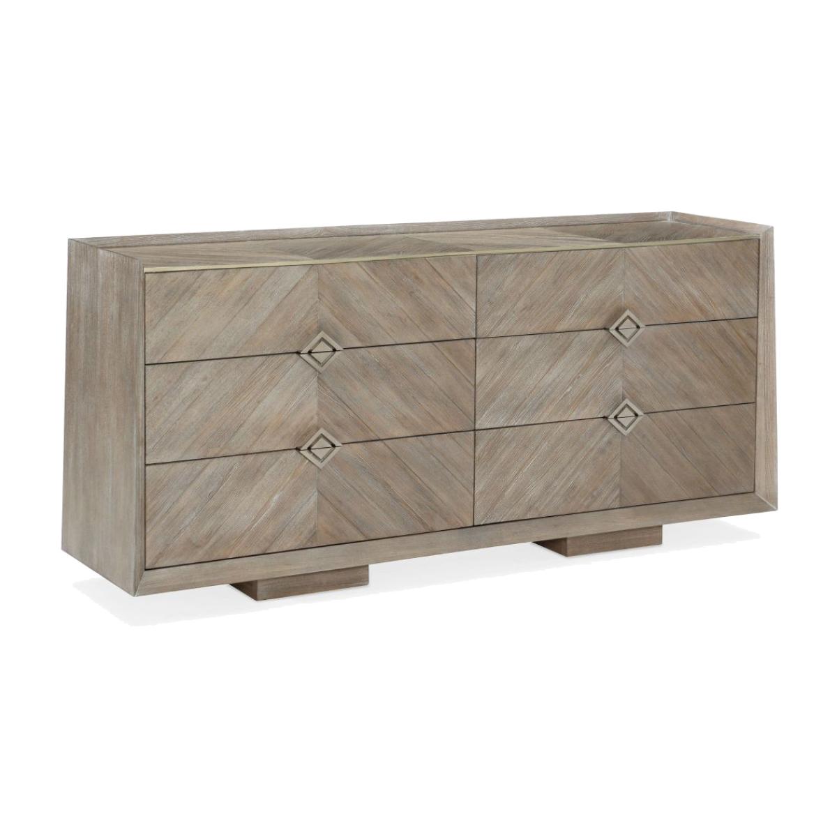 Destined to be the focal point of the room, there's no denying this six-drawer dresser is ready to "WOW. ” With a simple silhouette and clean lines, its design highlights the inherent beauty of natural materials. Perfectly matched directional woodgrain veneers create a one-of-a-kind chevron pattern that attracts the eye and creates an understated design statement. An easy-going shade of Ash Driftwood brings out the beauty of these stunning veneers and is sure to complement your room's decor. The subtle sparkle of a bead of Sundance Gold gives the top edge a touch of luxe. Open any drawer and you'll find a fully finished interior, wearing an elegant shade of Putty, ready for a few of your favourite things. Case finished in Ash Driftwood. Top metal bead in Sundance Gold. Six soft close drawers with undermount guides. Interior in Putty.