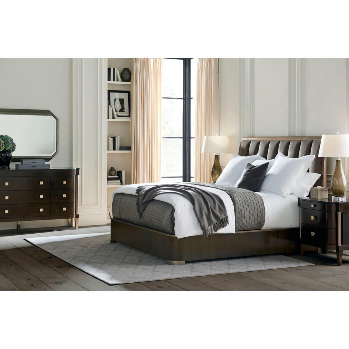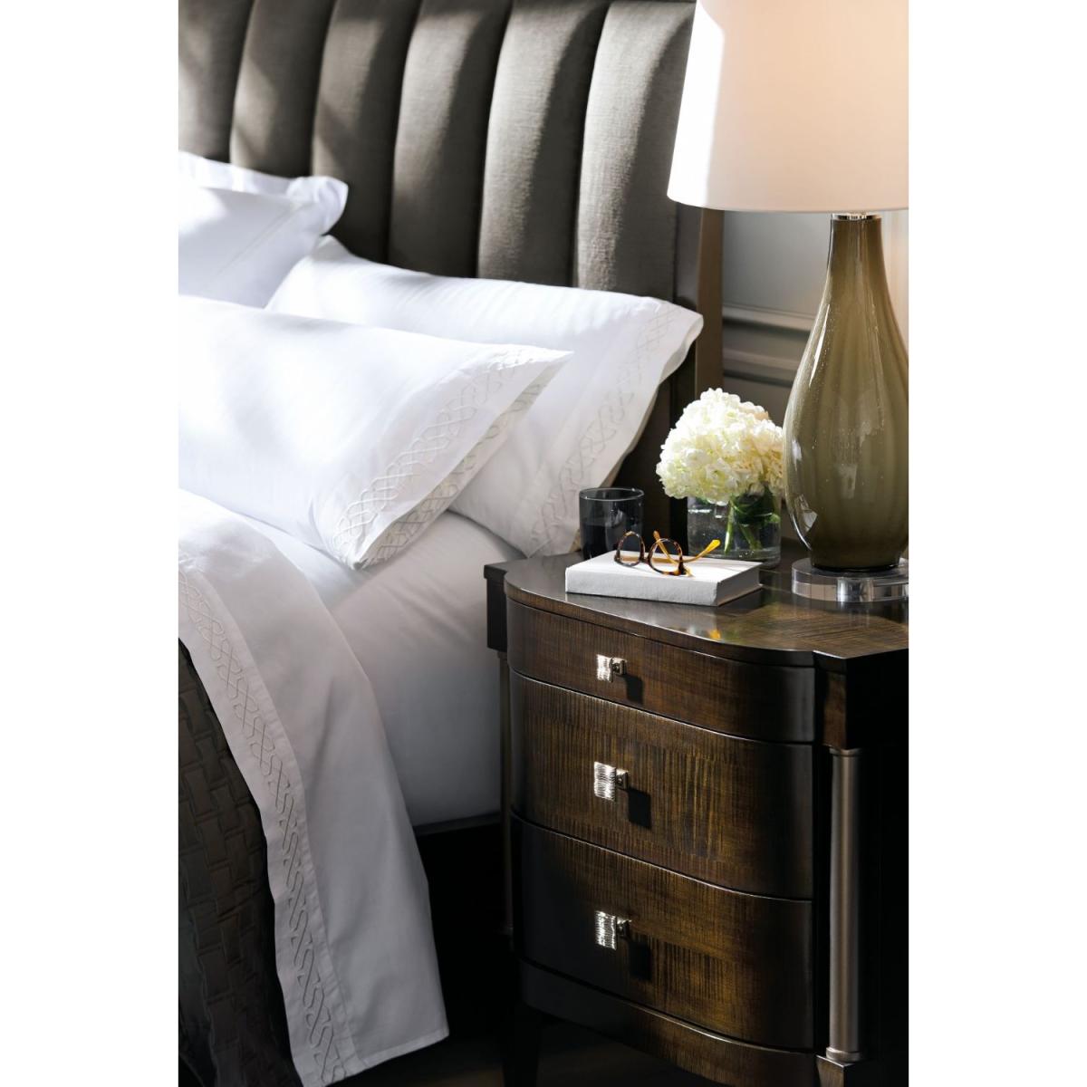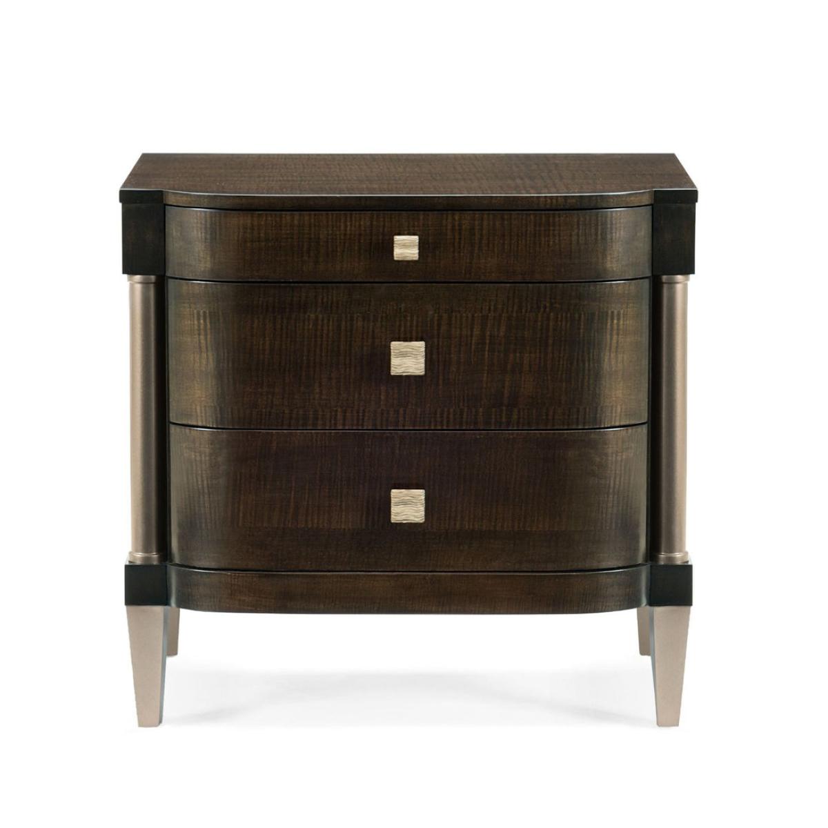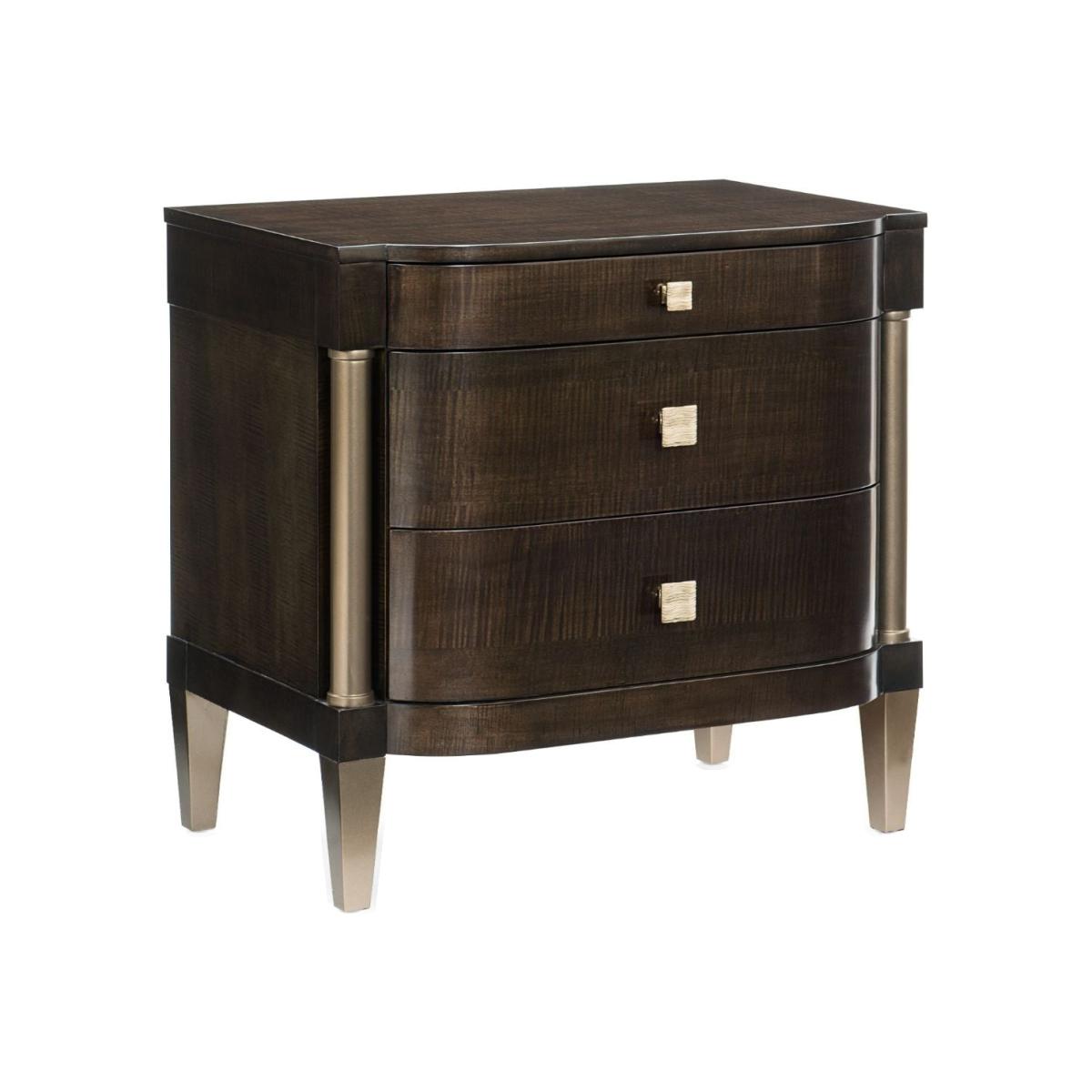 Streamlined refinement is on display in this three-drawer nightstand with perfect proportions. Dark Roast Figured Maple has been shaped into three soft-closing drawers with generous curves on the ends and punctuated by smooth columns covered in Harvest Bronze. The piece sits off the floor on smooth tapered feet. Shiny gold square pulls draw out the subtle grain of the figured maple. Case finished in Dark Roast with Harvest Bronze post and legs. Three drawers. Top drawer with soft-close guides. Two lower drawers with undermount soft-close guides. Drawer interiors in Harvest Bronze.