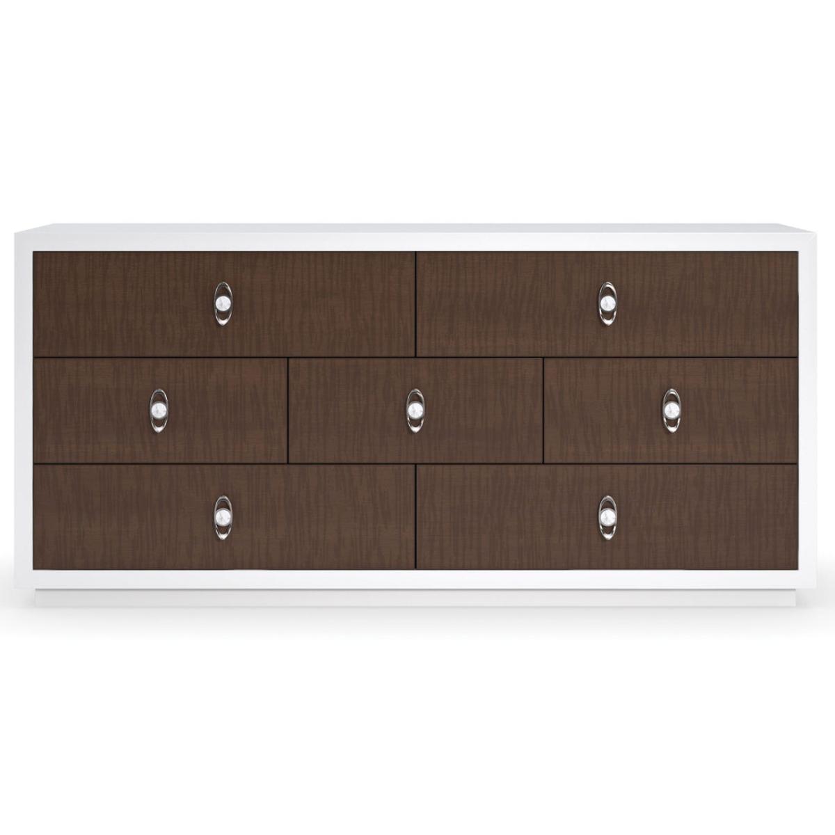 With drawer fronts crafted in a figured sycamore veneer, this bedroom dresser showcases the wood grain's intricately beautiful texture. At the centre of attention, cast metal drawer pulls with a ceramic detail recall the delicate design of a handcrafted cuff bracelet. Offers generous storage with seven spacious, soft-close drawers. Case finished in Cloud White. Seven drawers with fronts in Brunette and undermount soft close guides. Drawer interior in Cloud White.