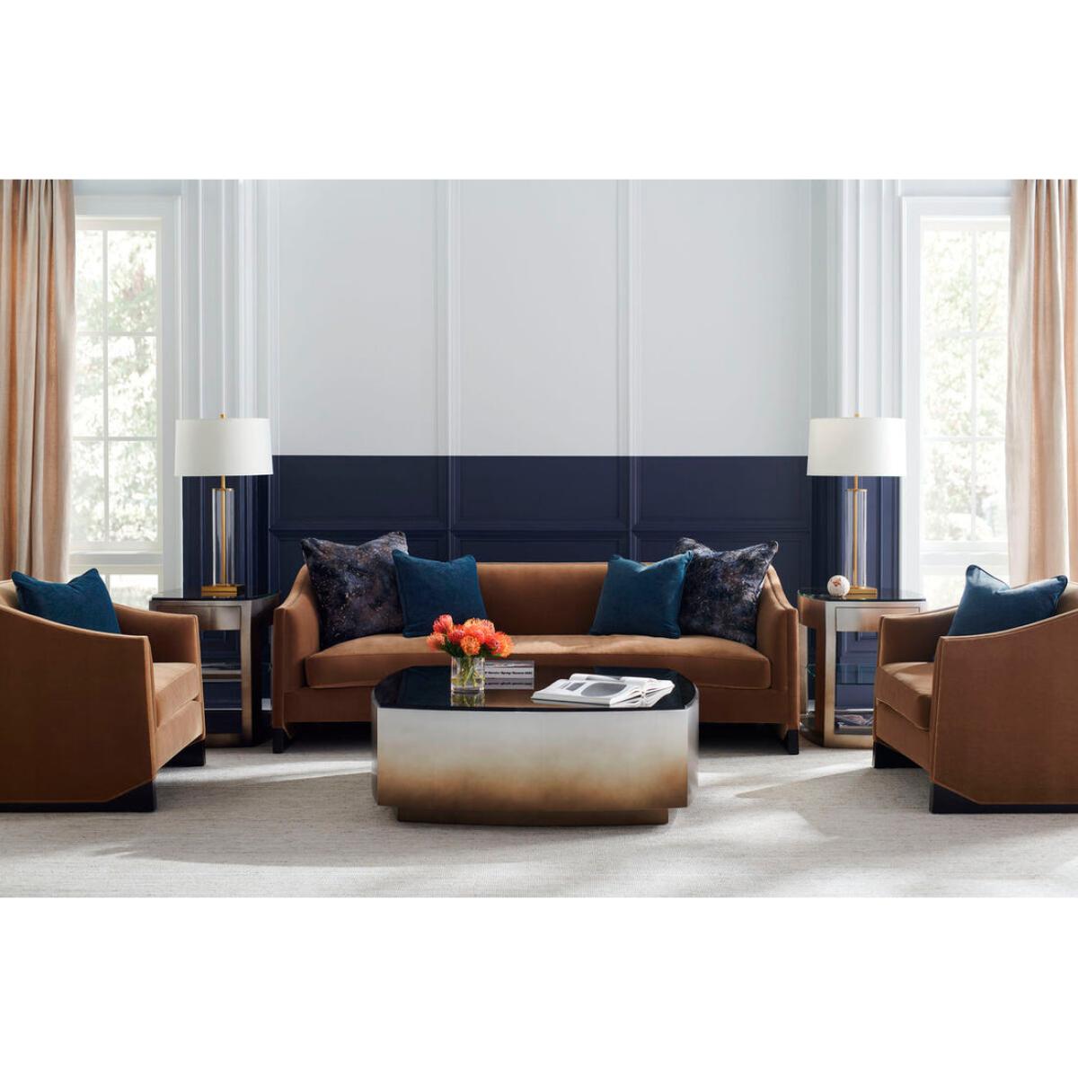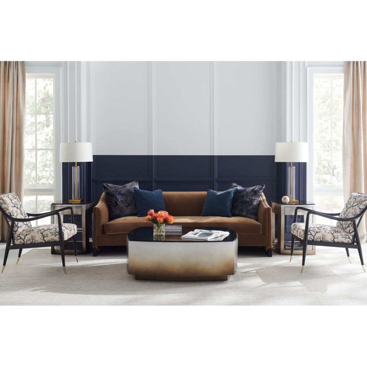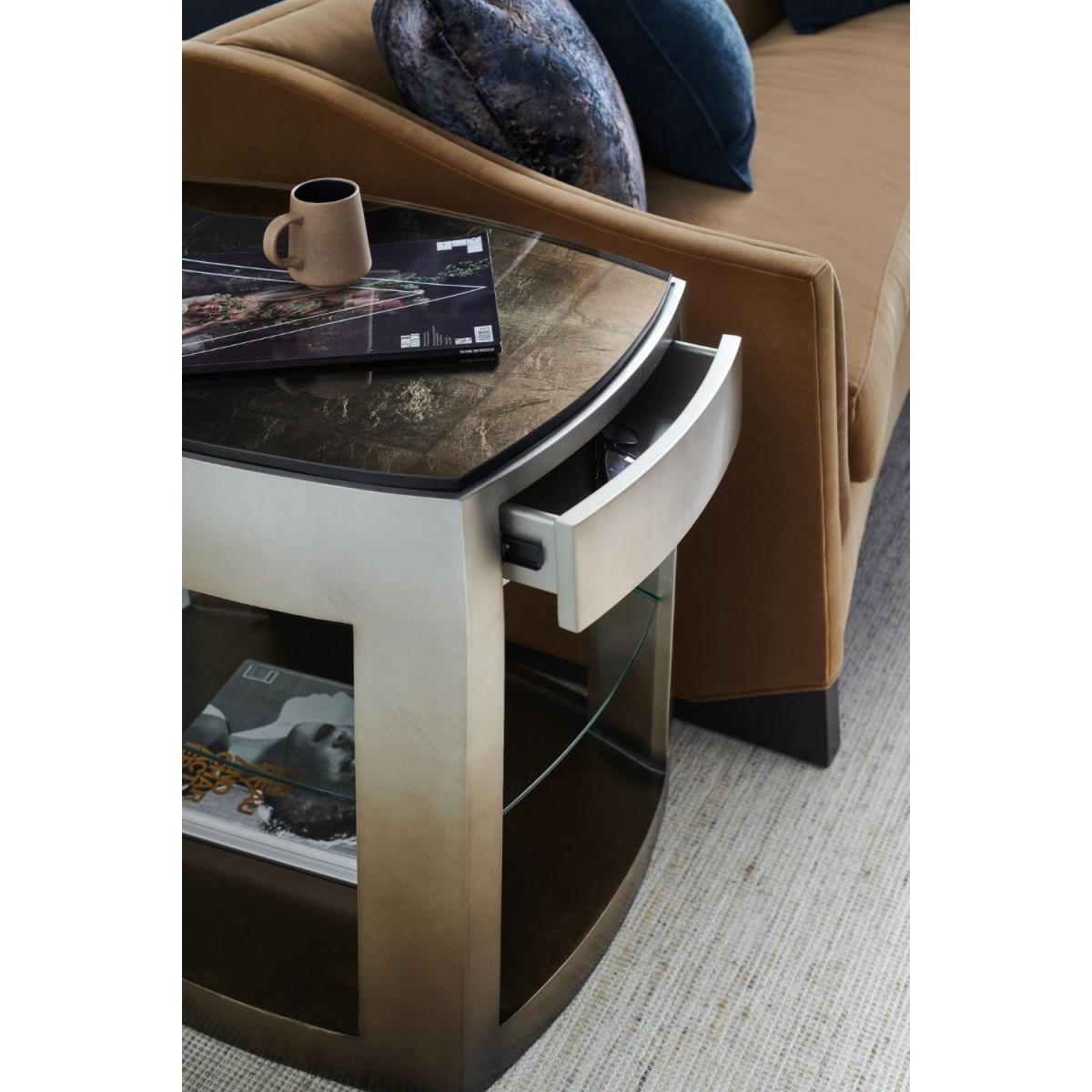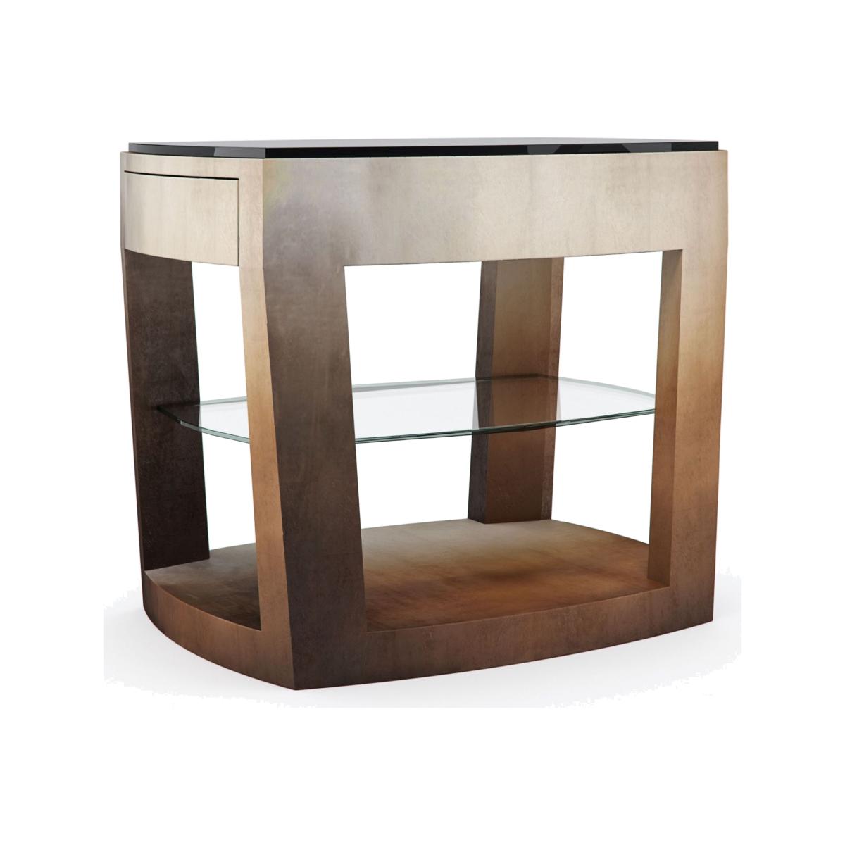 A captivating companion alongside sofas and chairs, this modern side table adds a cool metallic shimmer in an ombre silver leaf. The underside of its substantial glass top is finished in Olivette Leaf for added depth and reflection. Features a single drawer with side guides and an open storage area with an adjustable glass shelf. Style solo, or in pairs with our Case Closed Cocktail Table in a complementing finish. Case finished in Ombre Leaf. Top is back painted glass in Olivette Leaf. One drawer with side guides. Open storage area with adjustable glass shelf. Interior in Ombre Leaf. Base finished in Ombre Leaf.