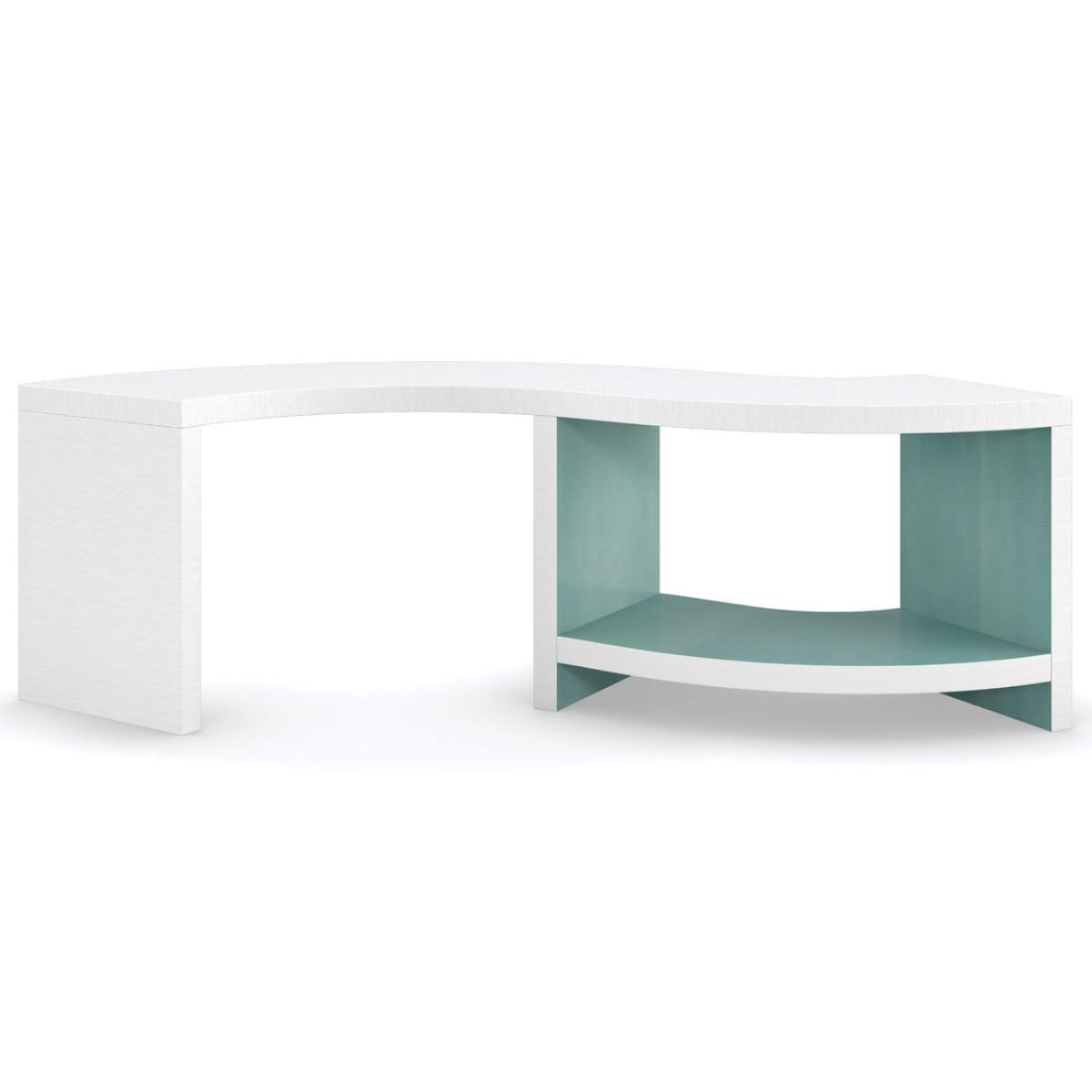The working concept for the collection was to reflect on the 3 of the elements in nature. Earth, wind and water. The lazy winding of a river inspired the gentle "S” shape in this table and the Lucent Oasis finish that accents the table. As she created designs for this group, she kept looking back on shapes in nature created by the elements and the winding flow of a river inspired this cocktail table. Top and outside leg panels in Lucent White. Inside of legs and open storage area in Lucent Oasis. Pairs with CLA-421-421 and CLA-421-422 spot tables sold separately.