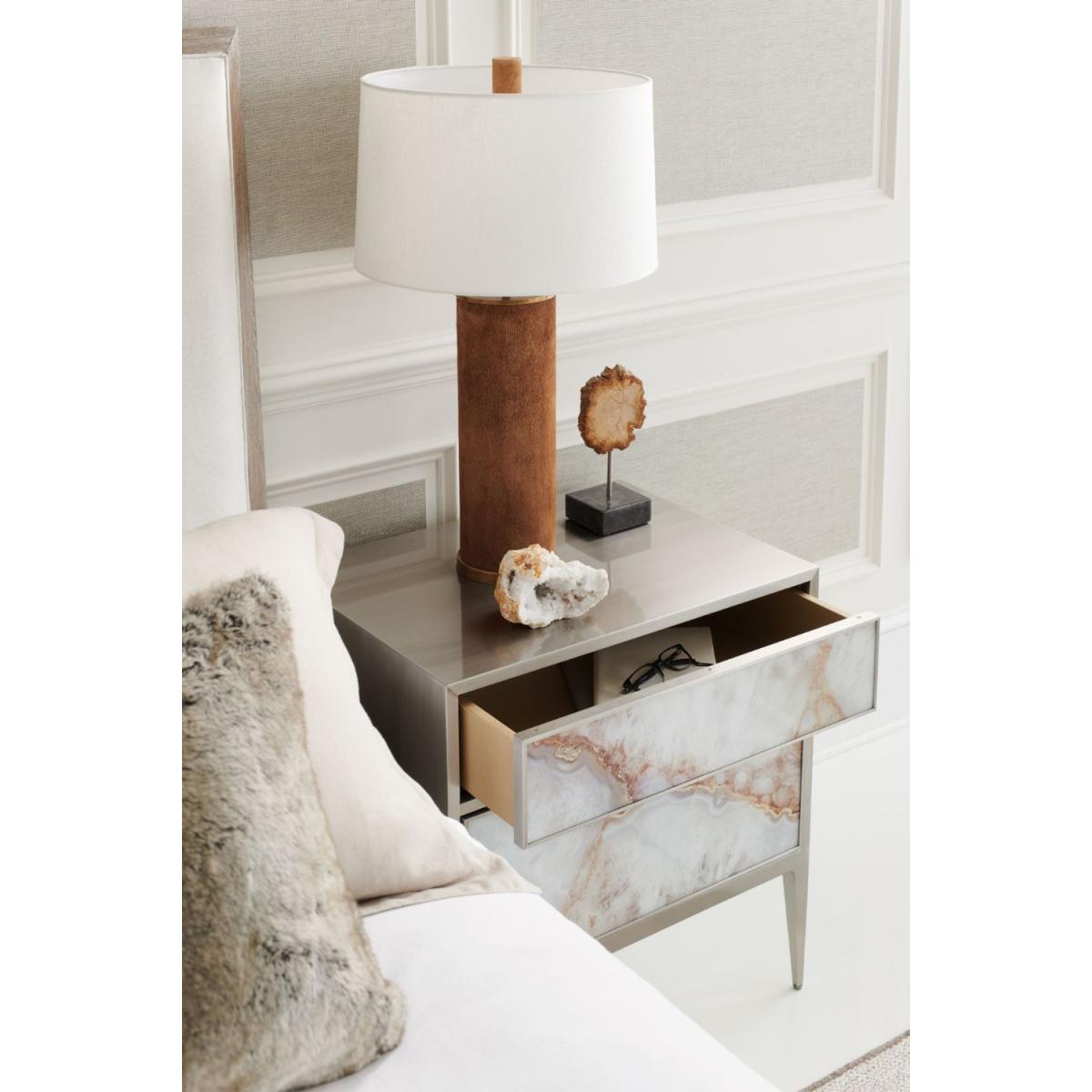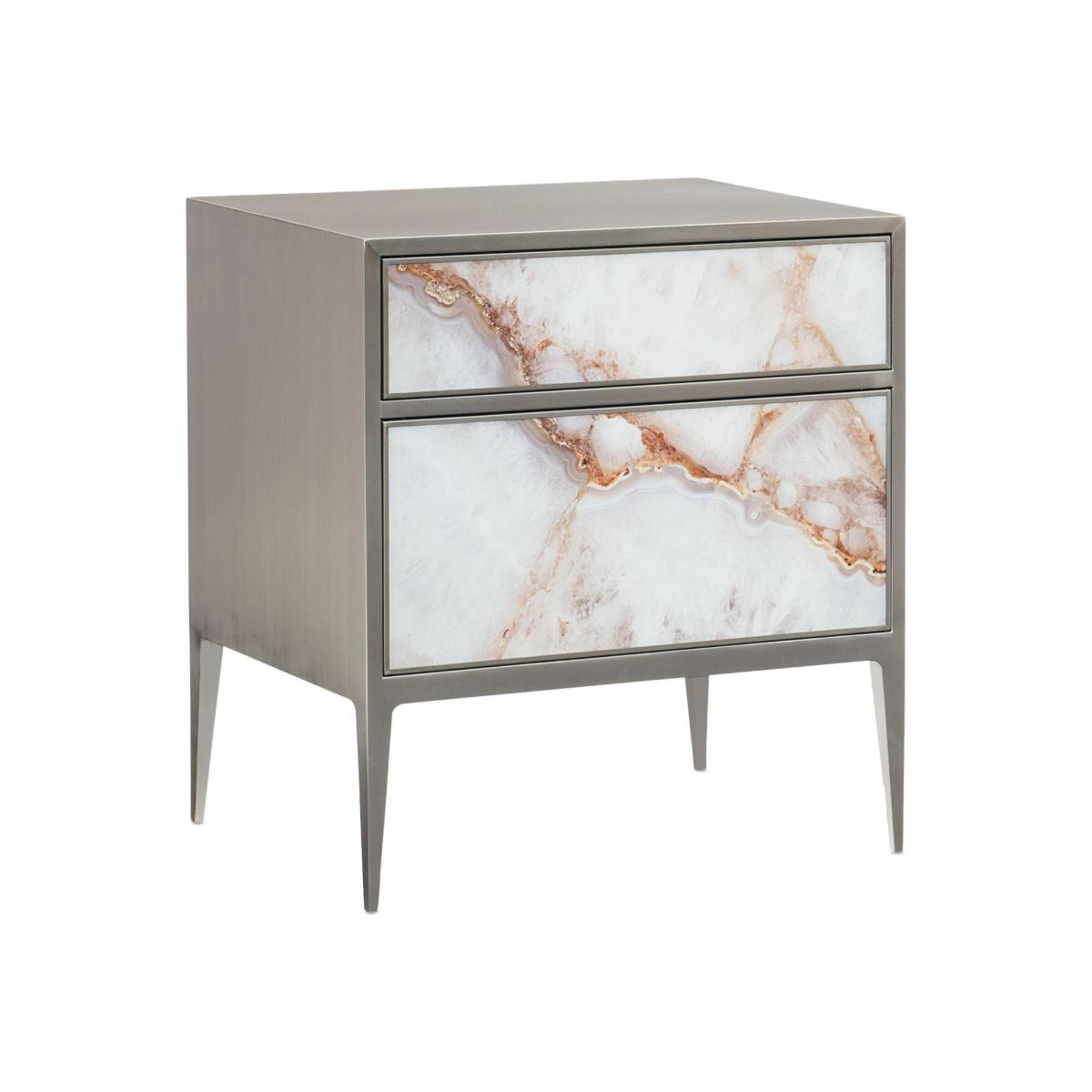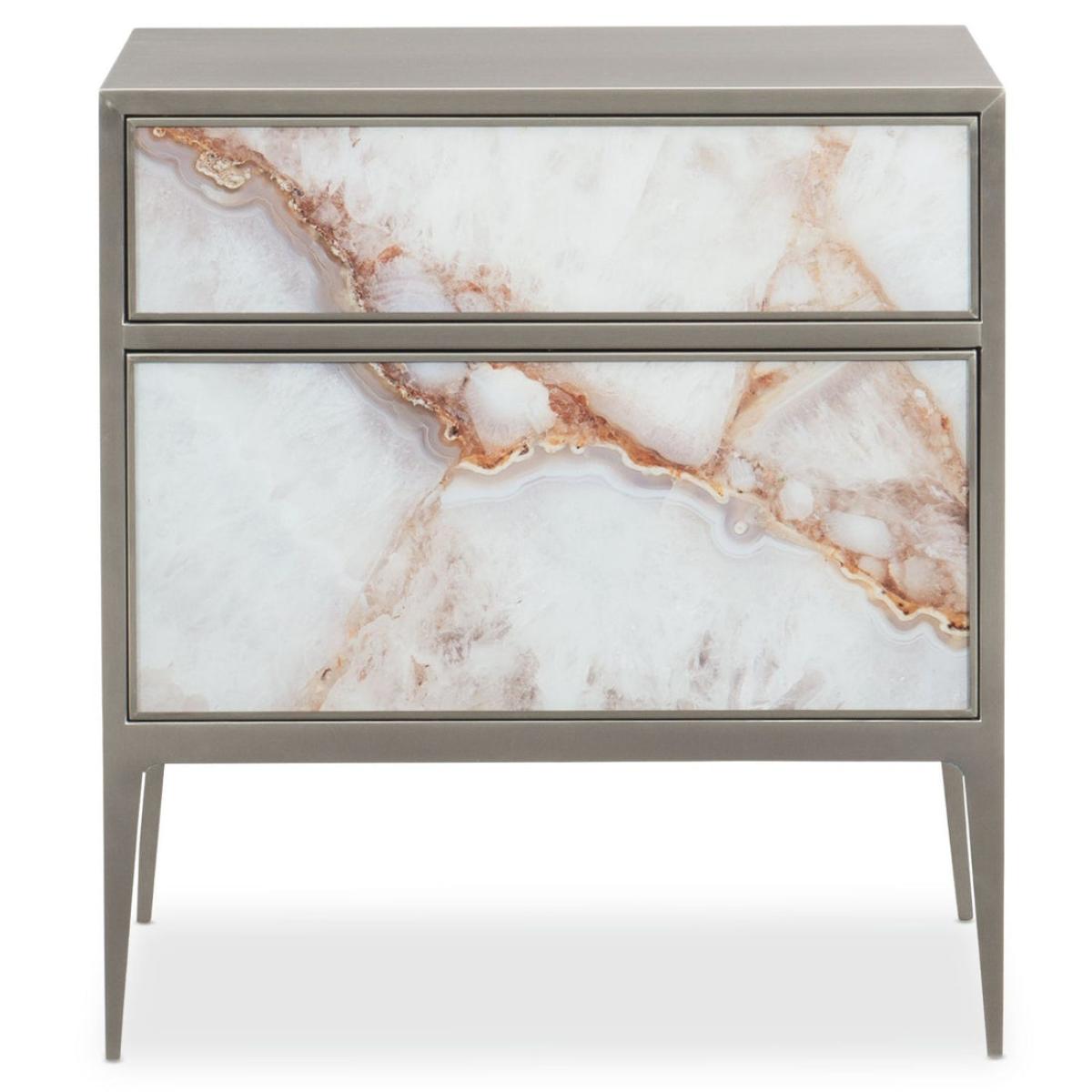 When it comes to making a bold statement in design, this chest is a Perfect Gem. Its unique look draws upon the beauty of natural stone's perfectly imperfect shapes and forms. It features two glass drawer fronts, each featuring an exquisitely painted agate pattern that brings the beauty of the outdoors inside. An understated metal frame in Brushed Nickel highlights the beauty of this chest's modern organic agate pattern while slim, tapered legs complete the aesthetic. Metal frame finished in Brushed Nickel. Two touch latch glass drawers with painted agate pattern. Interior in Pearl.