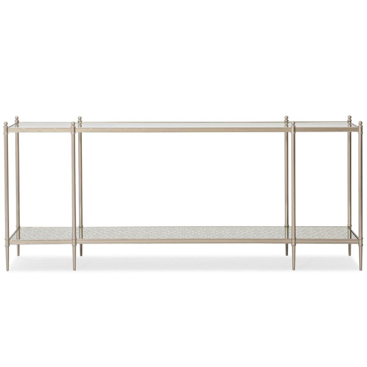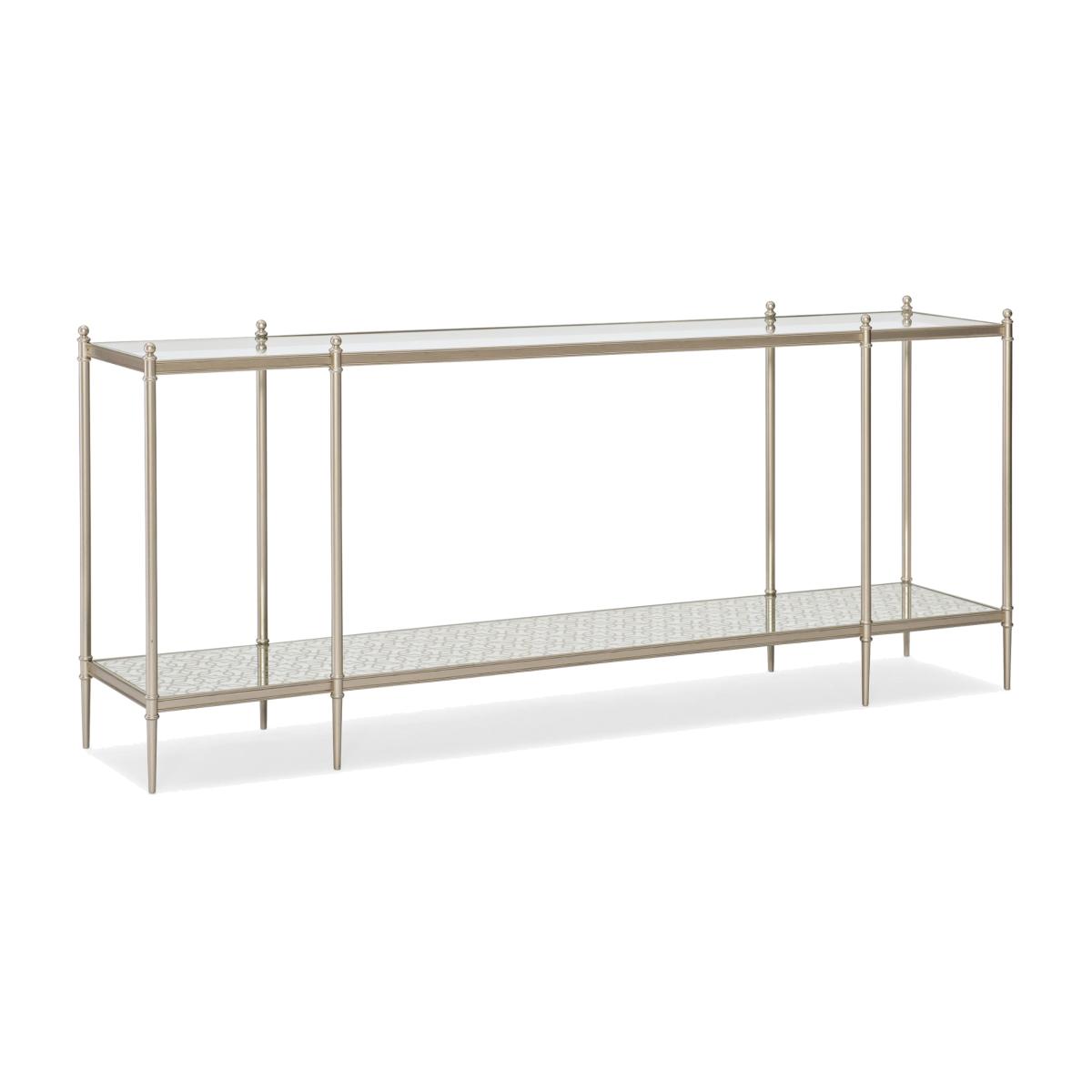Express your personal style with the addition of this head-turning table and you'll elevate the design value of the entire room. Crafted of glass, mirror, and metal, it wears a Neutral Metallic finish that complements both gold and silver tones. This perfectly proportioned table has a classic silhouette and crisp angles that glint in the light and look stunning both day and night. A clear glass top lets you look through and see the lower shelf where a Silver Leaf pattern adds artistry to its back-painted mirrored surface. Metal frame finished in Neutral Metallic. Clear glass top. Silver Leaf pattern on back of bottom mirrored shelf.