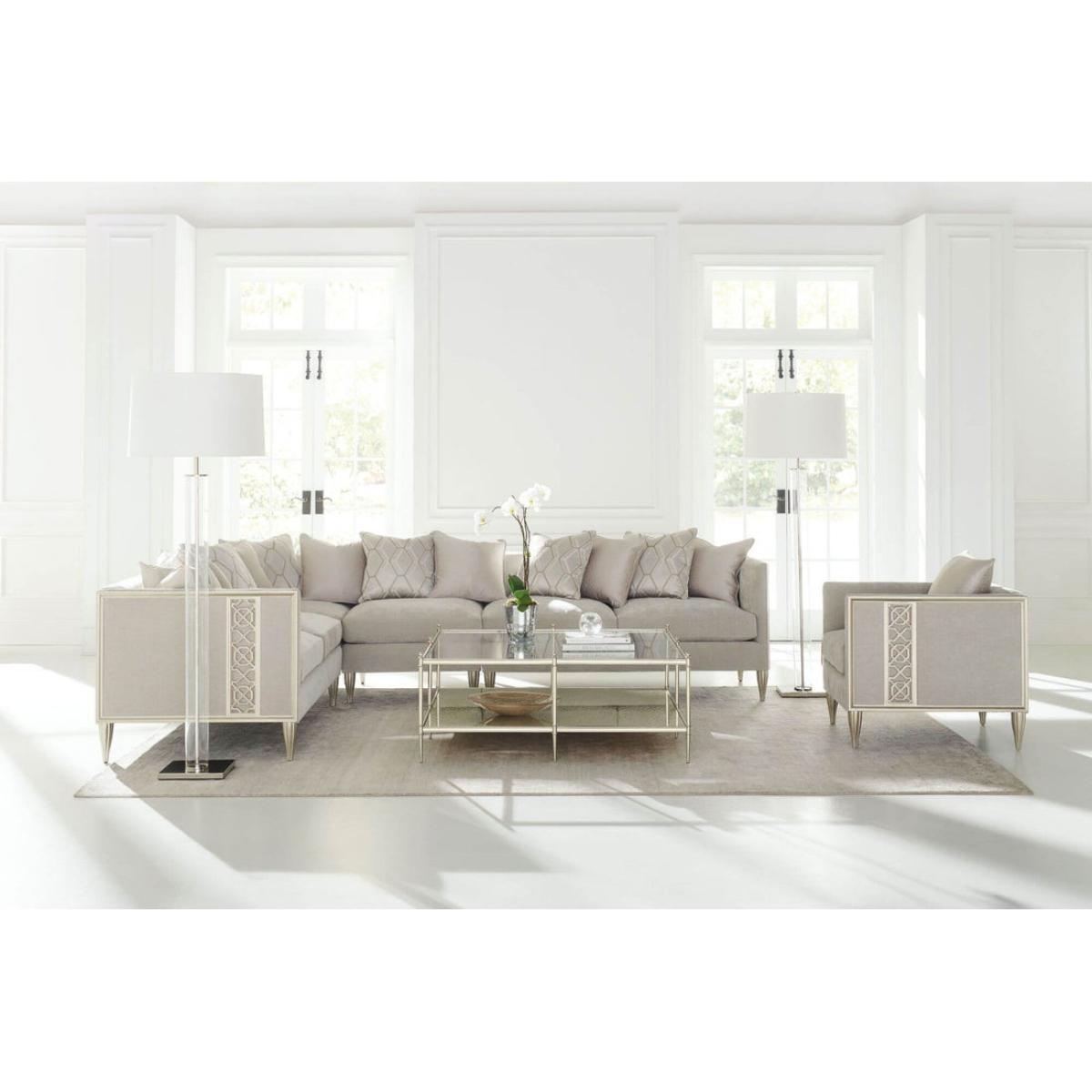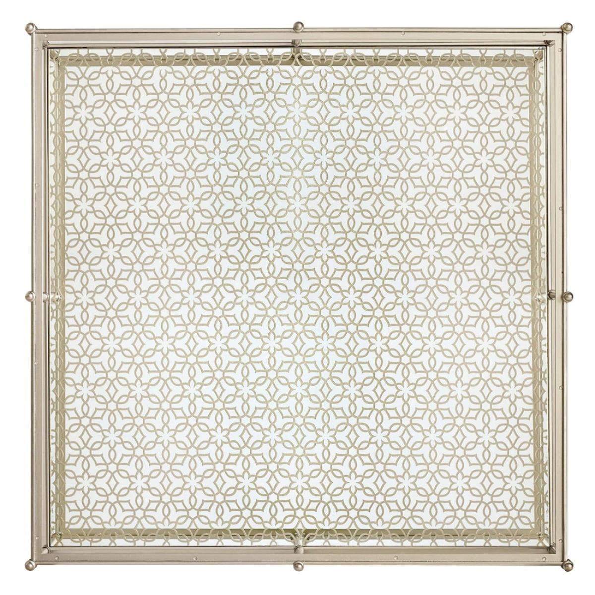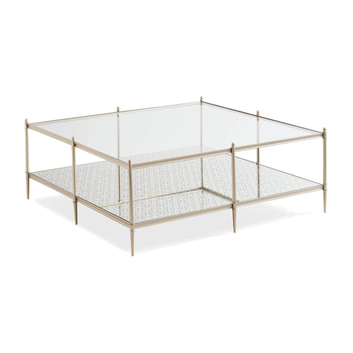 Worthy of a second look, the beauty of this cocktail table will surely prompt a double take. Its classic square shape is ideal for anchoring your conversation area while the exquisite metal frame finished in Neutral Metallic adds an element of fashion to the room. A glass top reveals the beautiful design below and is perfect for styling with your favourite design books and treasures. Generously sized and finished to perfection, this refreshingly updated table is impressive from every angle. Metal frame in Neutral Metallic. Glass top. Bottom mirrored shelf with silver leaf etched pattern on back of mirror