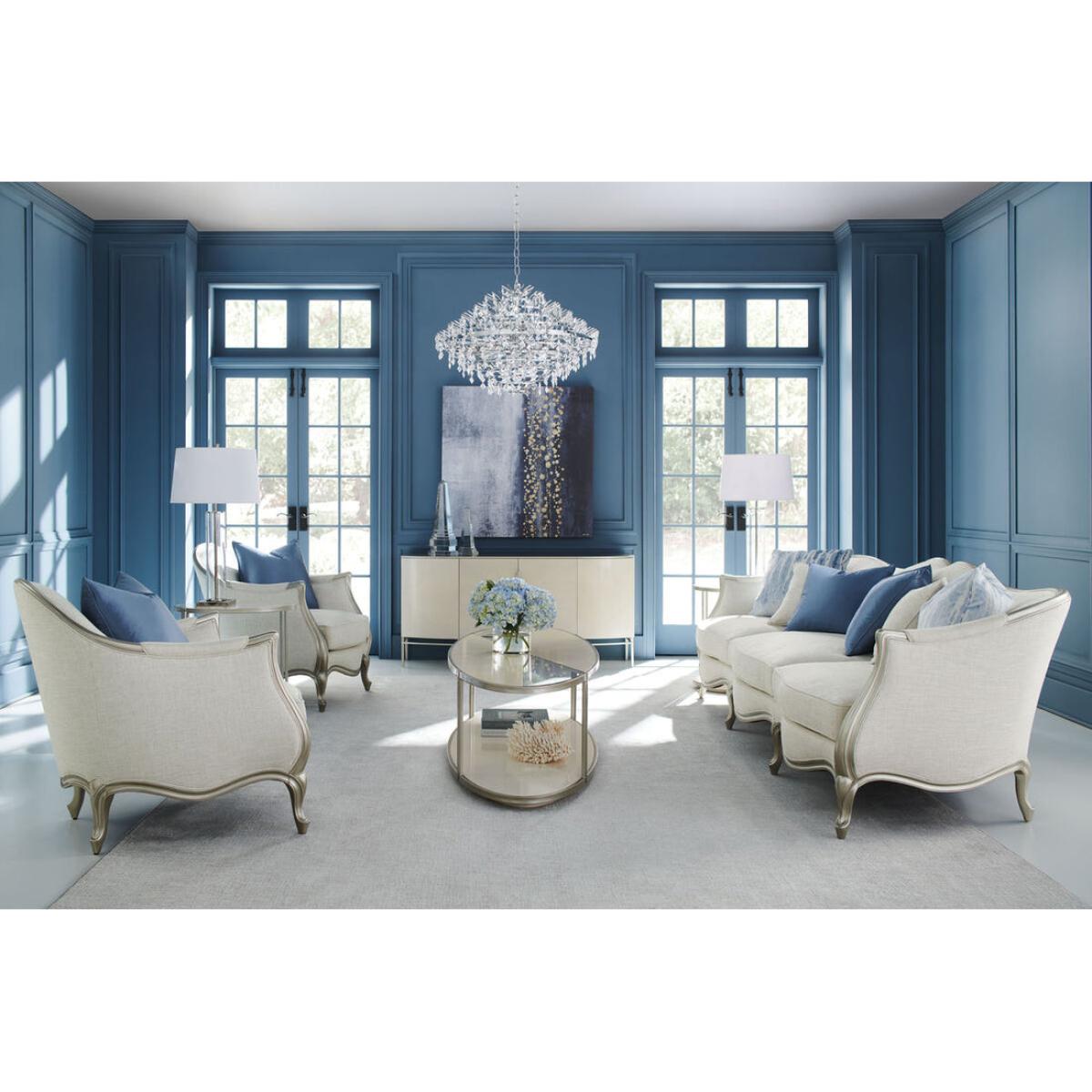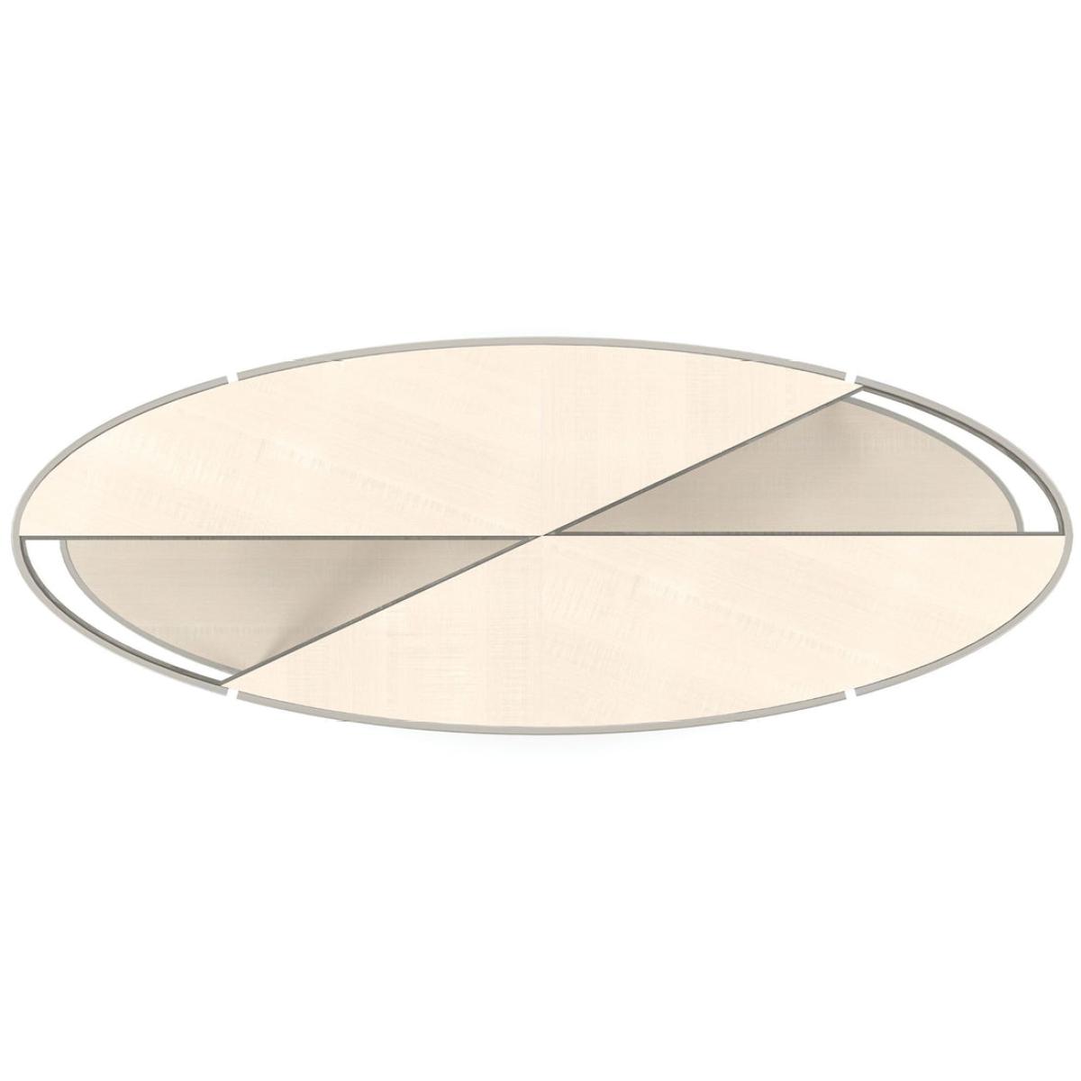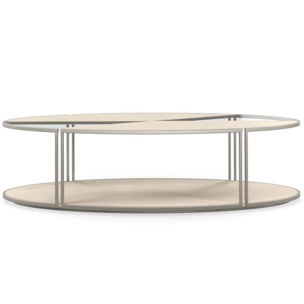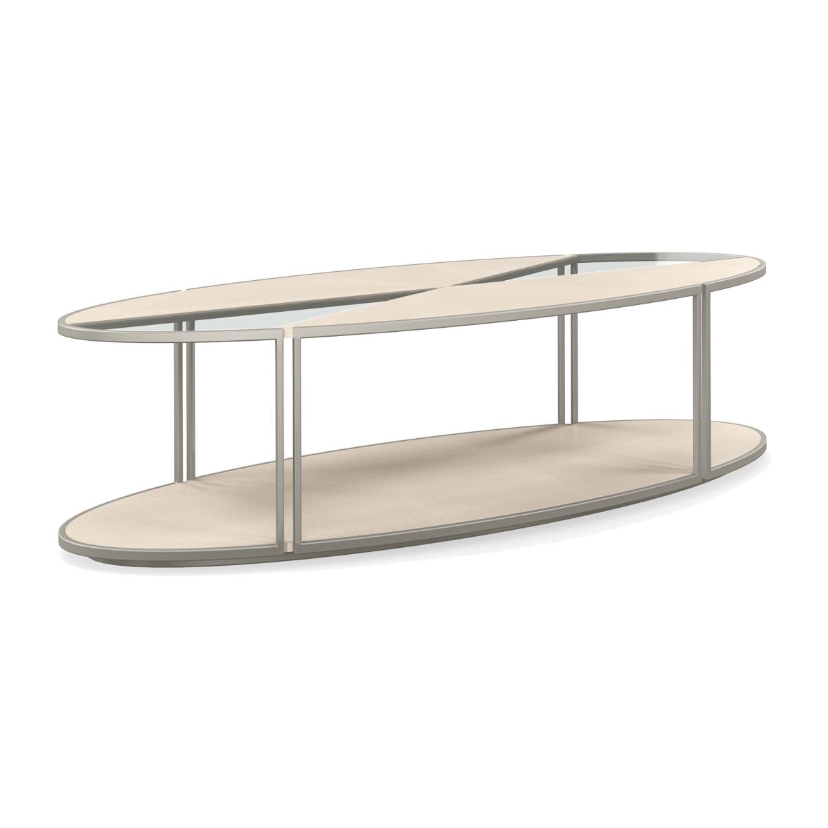 With its refined oval shape, this exquisite cocktail table brings a sense of movement to seating areas. The natural beauty of figured sycamore shines through its Vanilla Cream finish, complemented by a slender metal frame in Soft Silver Paint for a hint of glamour. Tempered glass sections on the top create visual interest and allow light to pass through. Offers ample open space, above and beneath, for showcasing fresh-cut flowers, books, and other mementos. Pairs perfectly with our Side View end table. Metal frame in Soft Silver Paint. Top has two clear tempered glass sections and two Vanilla cream sections. Bottom shelf in Vanilla Cream.