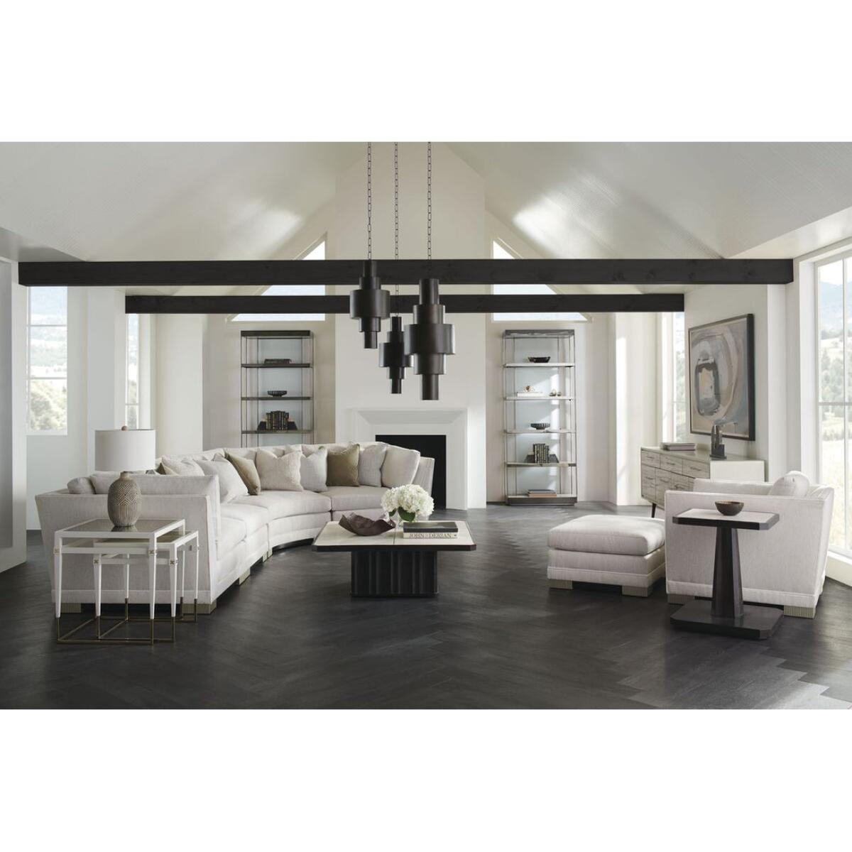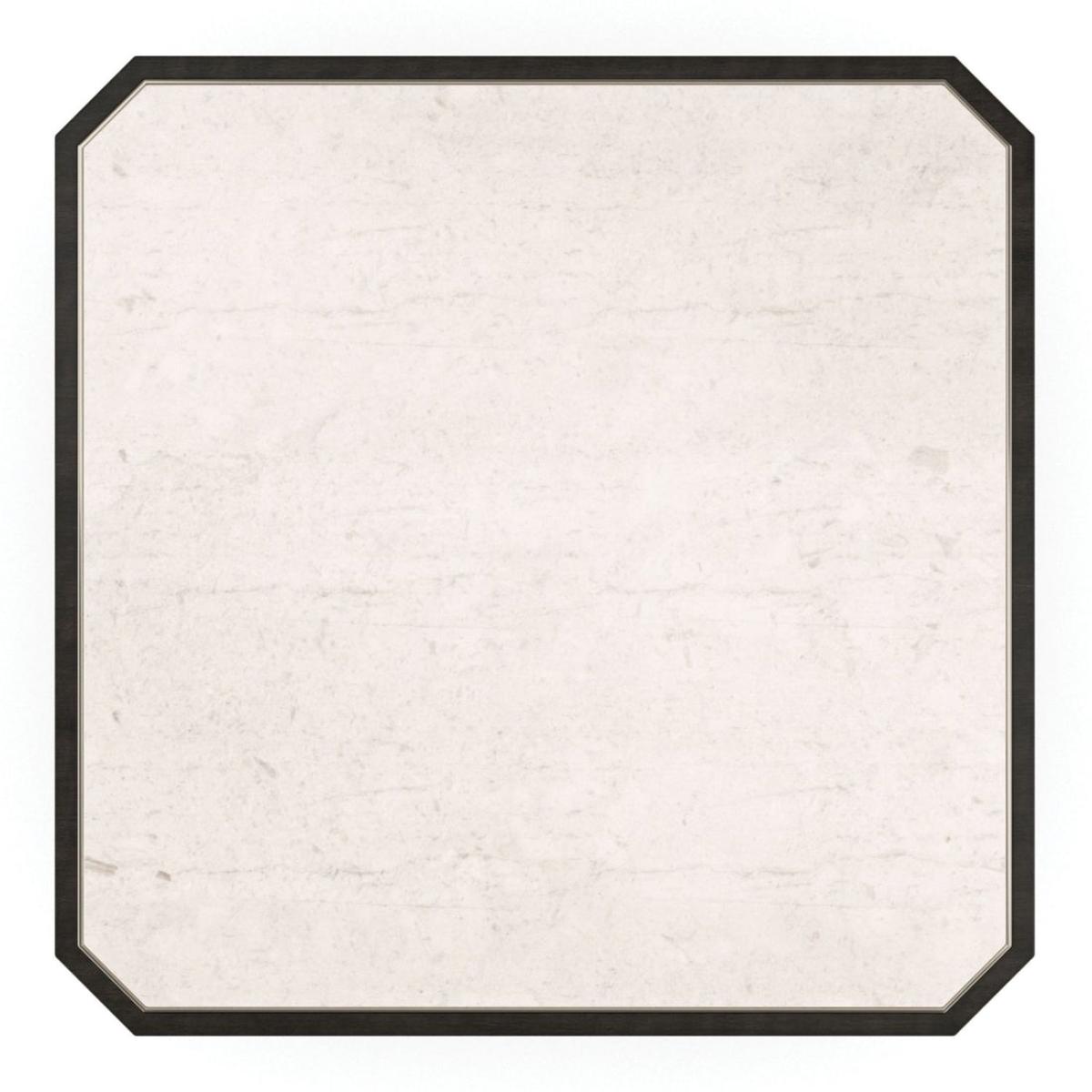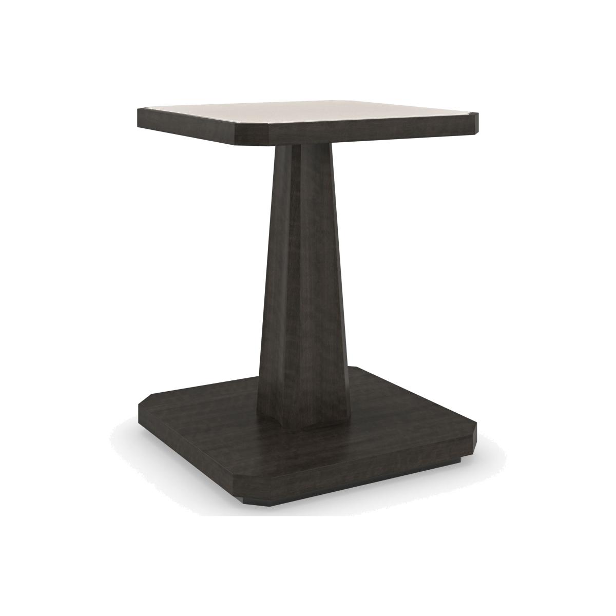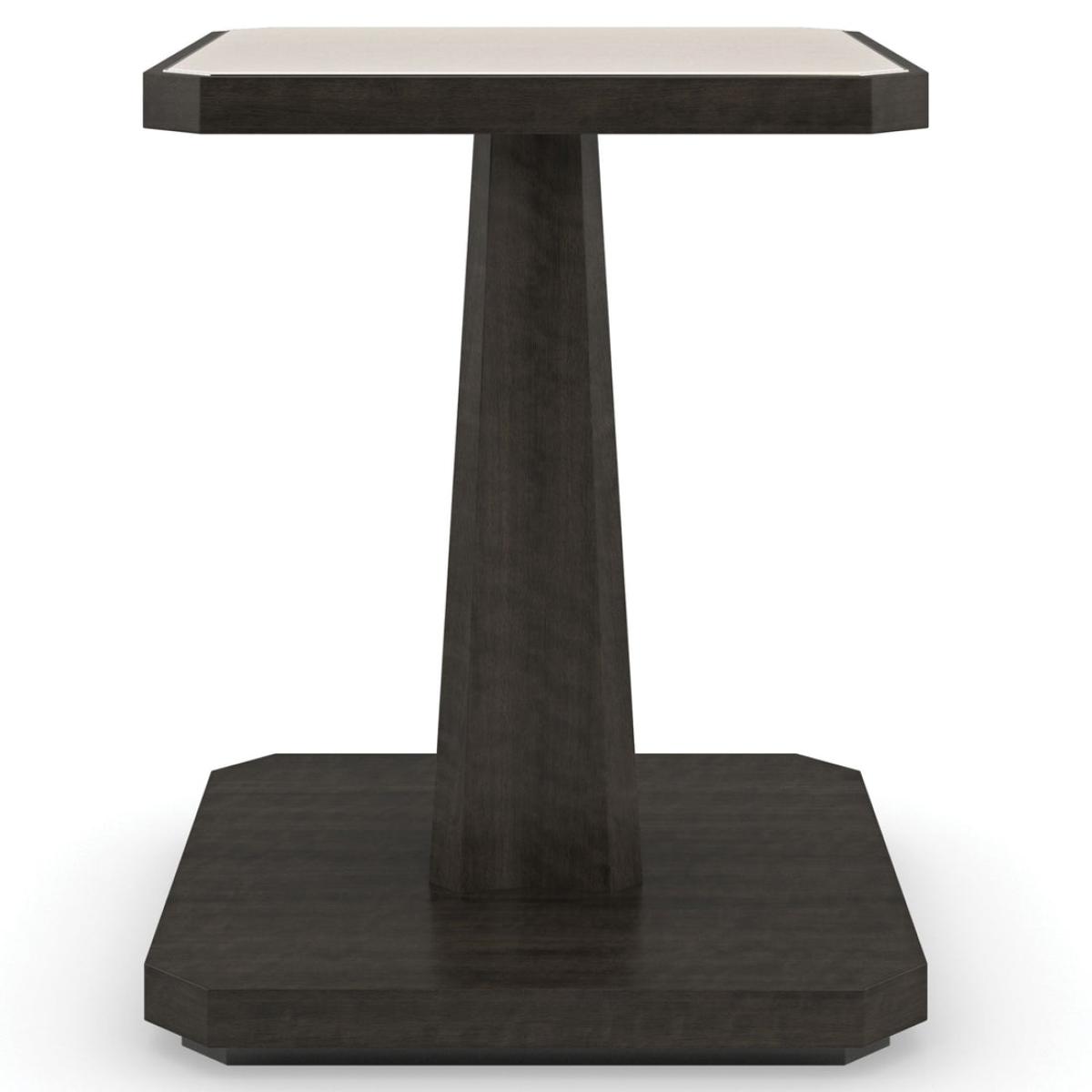 Placing organic beauty on a pedestal, this classic end table draws attention to the exquisite veining and coloration found in natural stone. Trimmed in a Majestic Gold metal inlay, a creme Travertine top is framed in a Charred Bark finish, atop a fluted base for added depth and dimension. Pairs perfectly with our Solid as a Rock cocktail table. CrËme Travertine stone top with metal trim in Majestic Gold. Table base in Charred Bark. Recessed base in Almost Black. Top is a natural stone. Natural variations in color, veining and spotting will vary from piece to piece. Natural materials are porous in nature and care should be taken protect the surface.