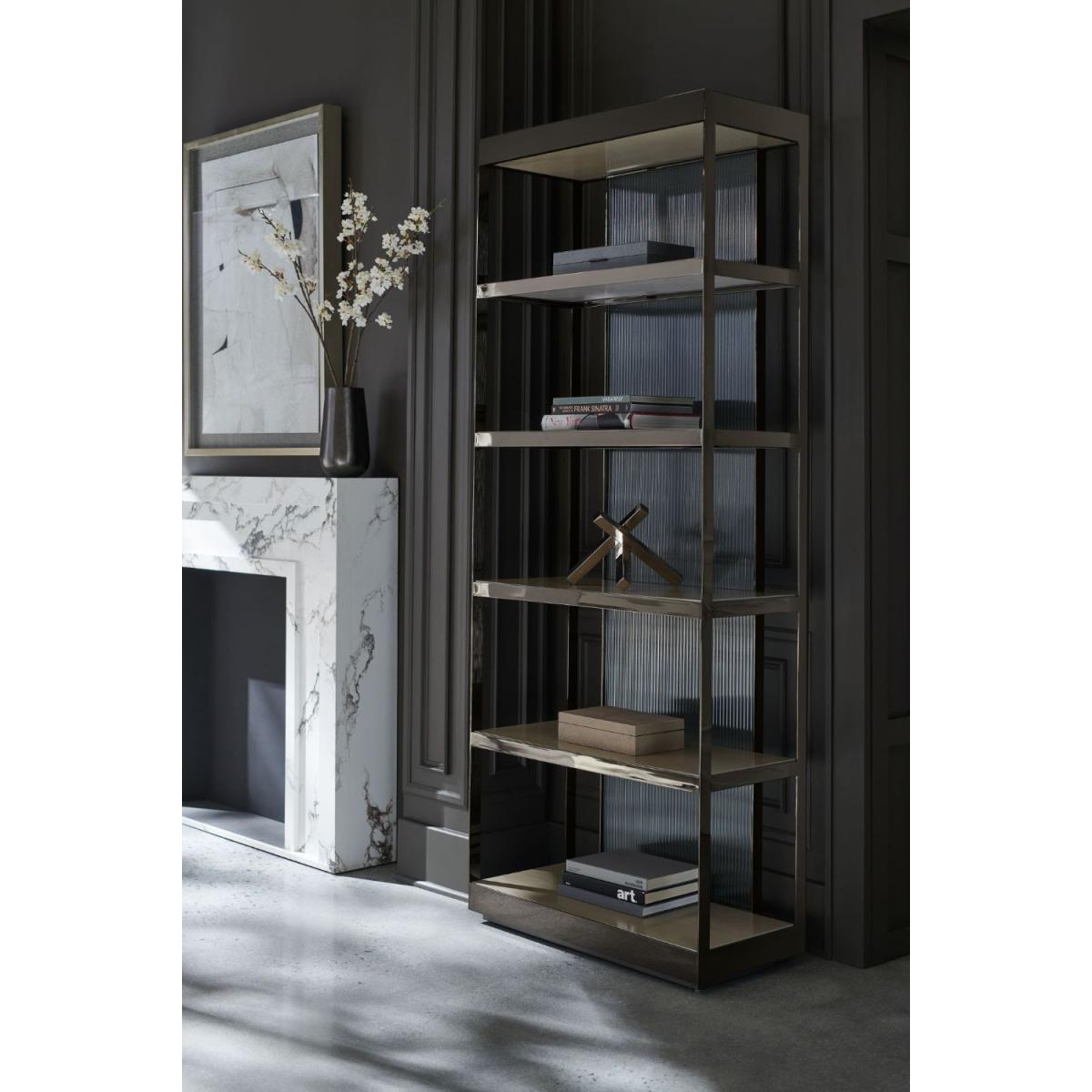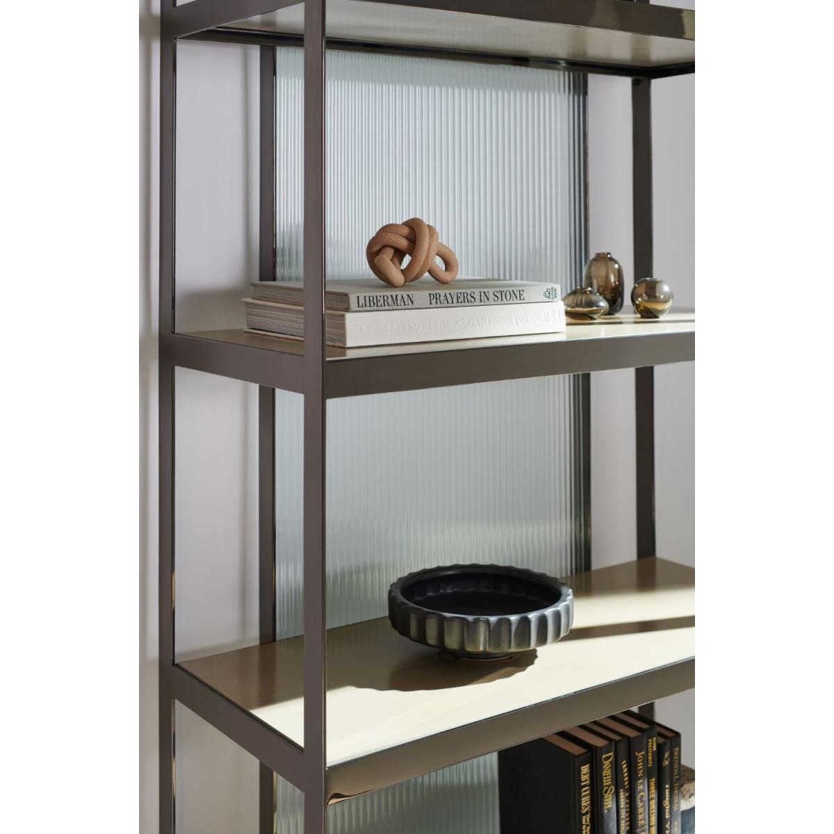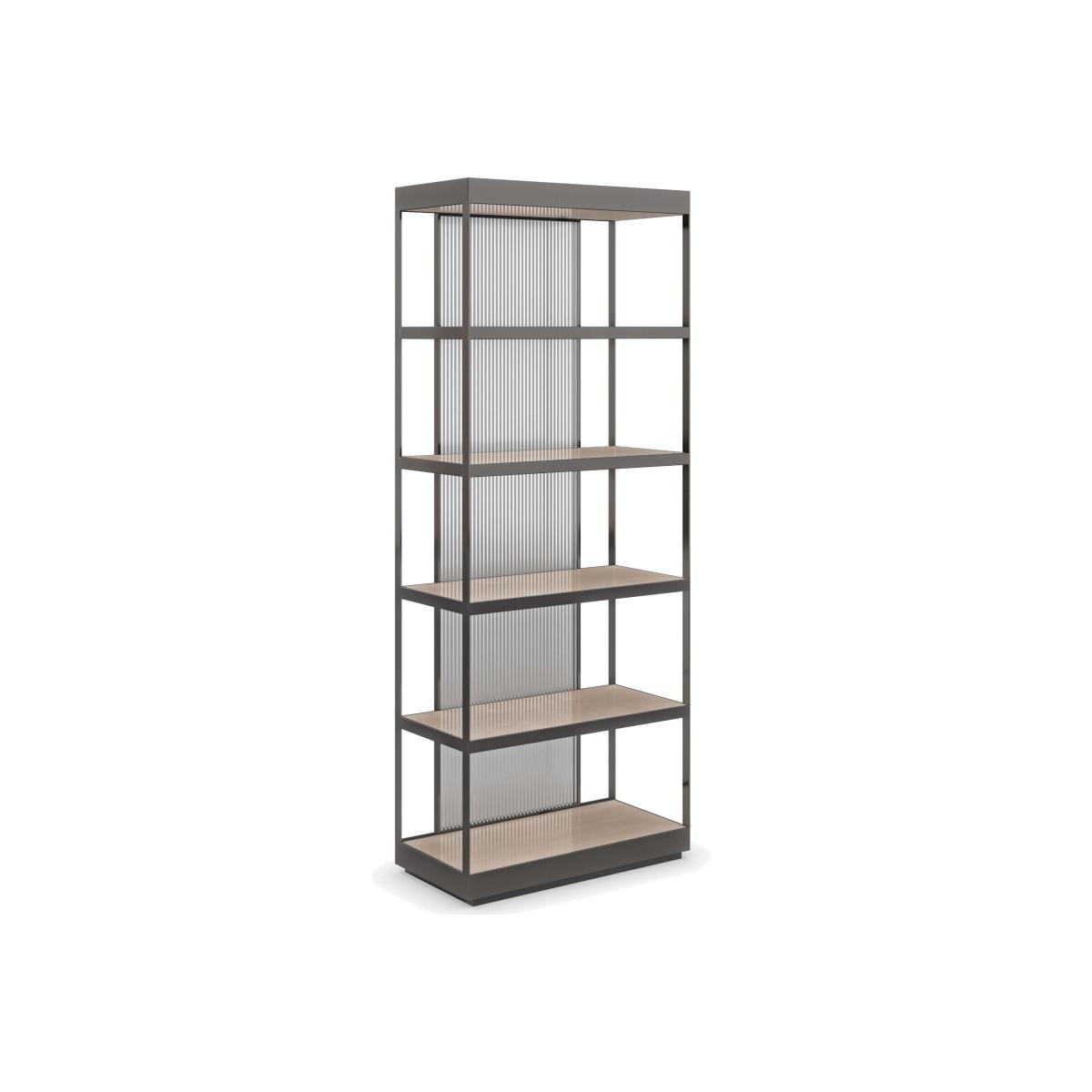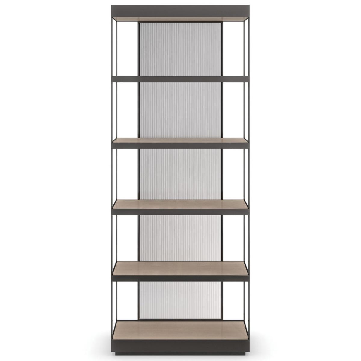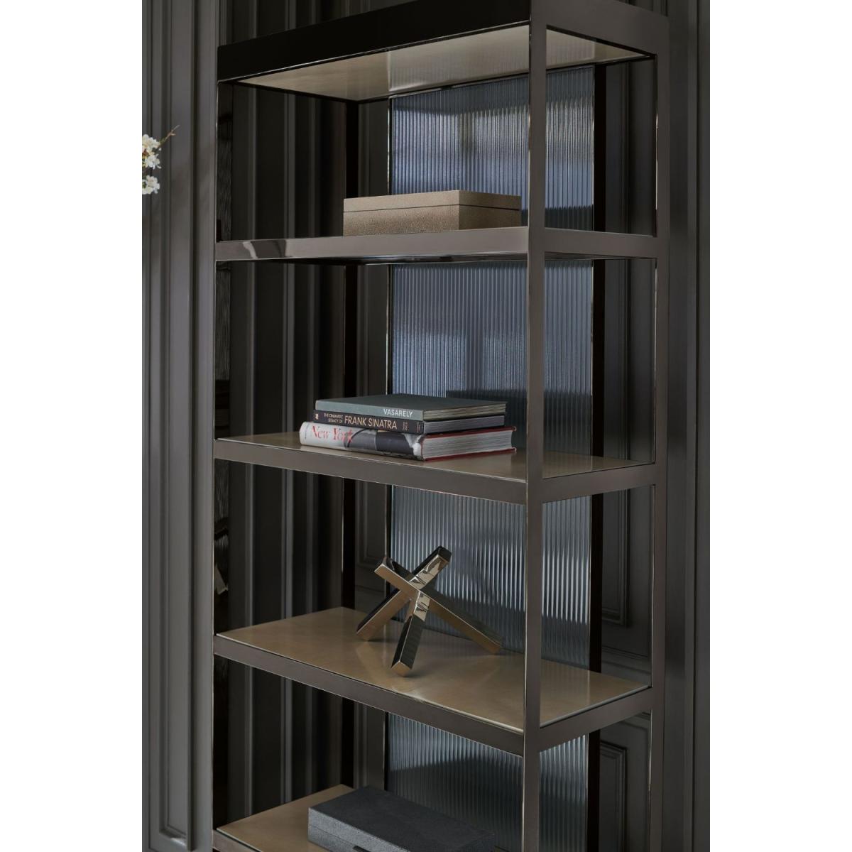 Let your personal style shine with this visually alluring etagere, offering plenty of open space for self-expression and artful displays. A cascading reeded glass back adds dimension and catches light, warmly reflected in its Deep Bronze metal frame. Features four removable shelves, meticulously crafted in Japanese Sen veneers with a warm taupe finish. Use a pair to fill a wall, or style alongside a buffet or credenza to make the room feel more dynamic. Its fully finished back also allows for use as a screen or partial room divider. Metal frame in Deep Bronze Reeded glass back panels. Four removable wood shelves in Woodland Gray. Plinth base in Almost Black