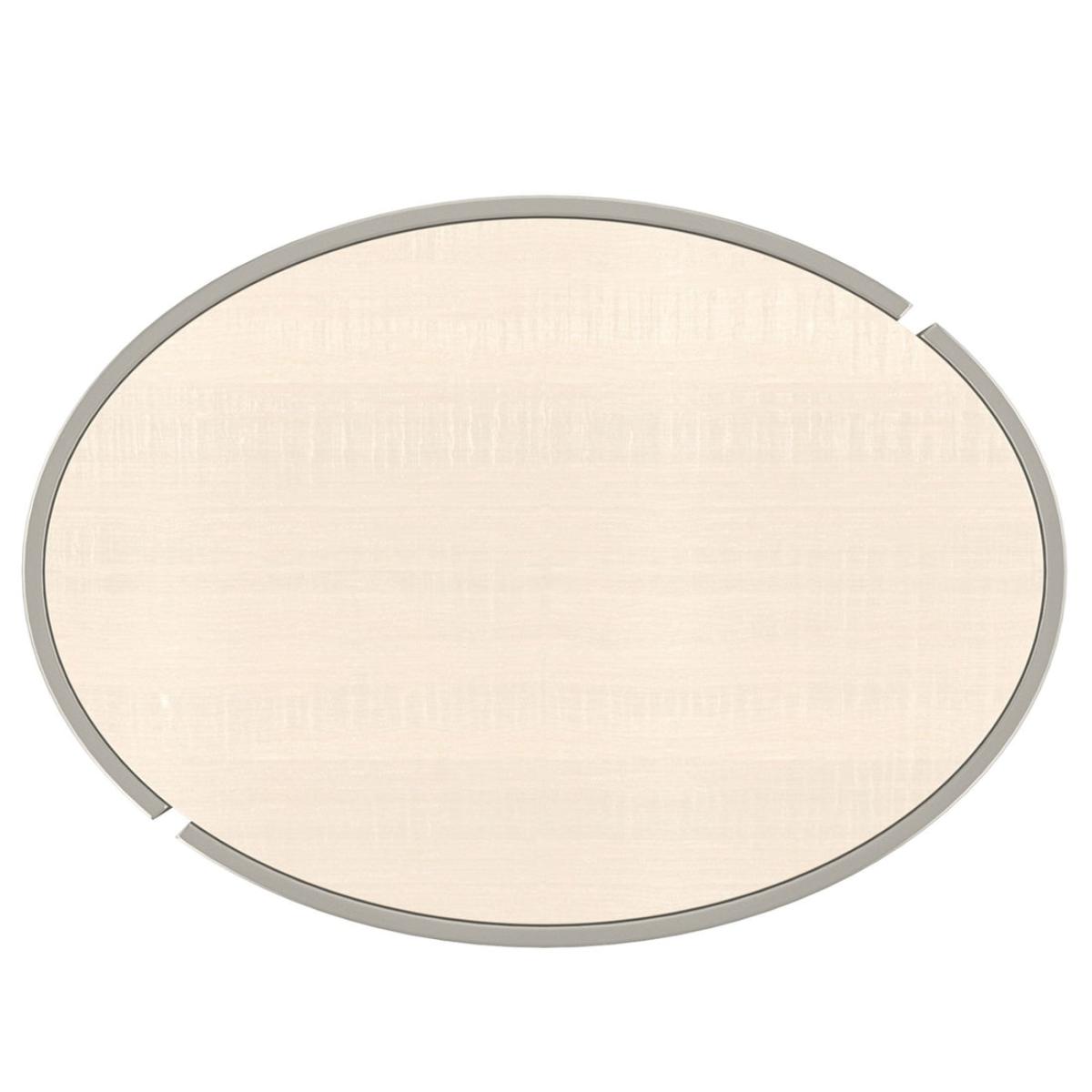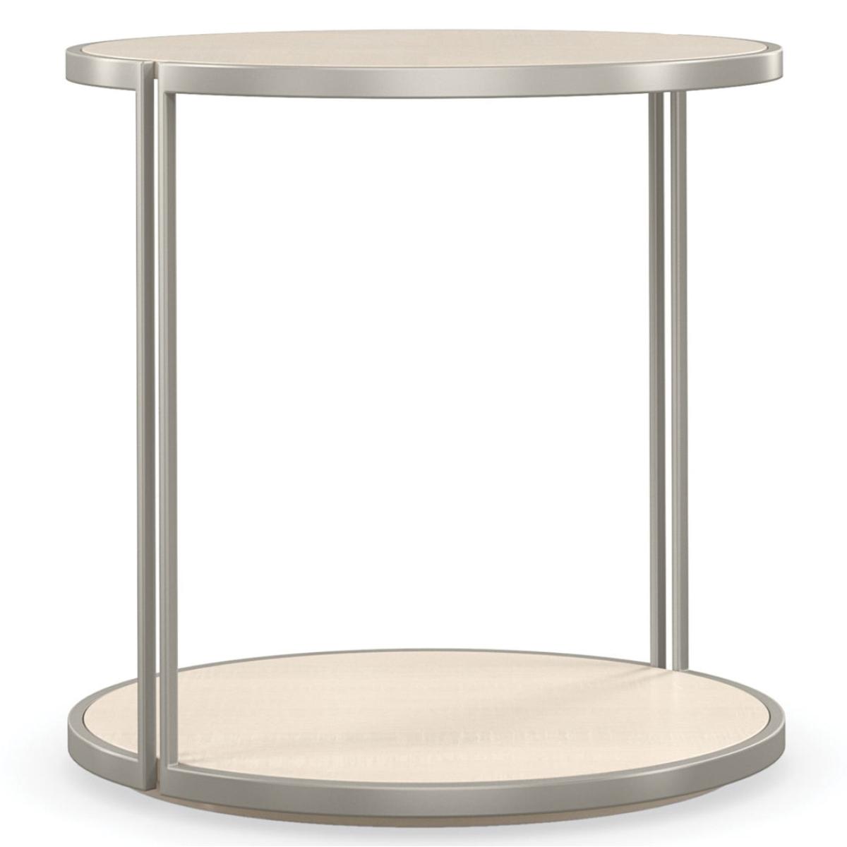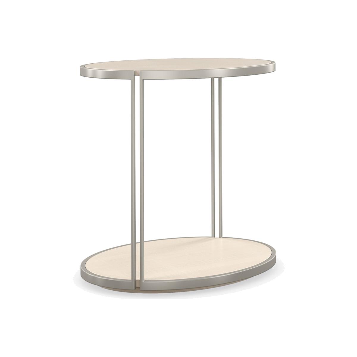 Simply captivating, this end table introduces a harmonious mix of organic materials and illuminating finishes. Visually interesting, yet airy and light, its oval-shaped top and bottom shelf appear to float within a slender metal frame. Features a Vanilla Cream finish to highlight the natural beauty of figured sycamore, for a style that's both casual and glamorous. Pairs perfectly with our Quarter View cocktail table. Metal frame in Soft Silver Paint. Top and bottom shelf in Vanilla Cream.