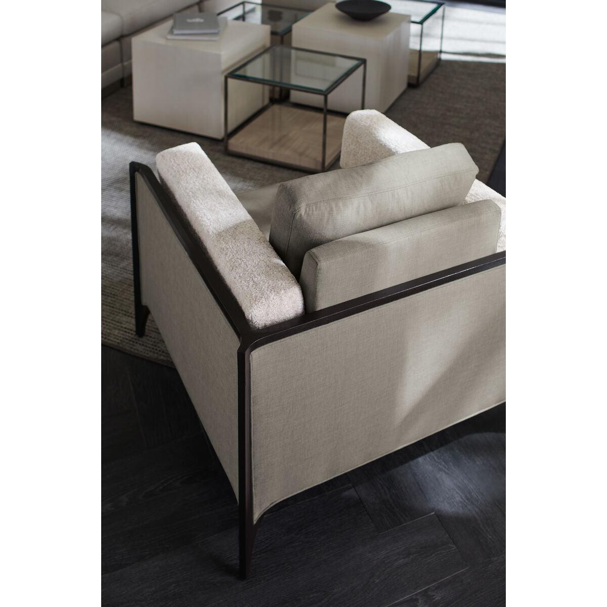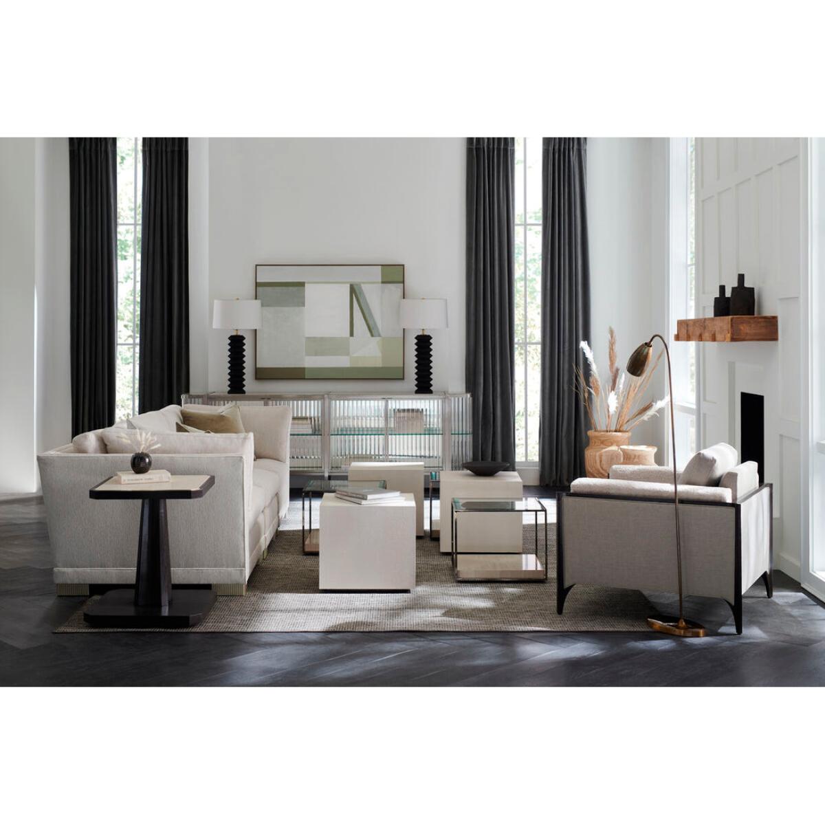 Styled in multiples or on its own, this refined cocktail table makes a solid statement in a richly textured faux shagreen. Fully wrapped, its classic cube shape appears to float on a recessed, wood plinth base in an Almost Black finish. Pair with our Open Air cocktail table and create a multi-dimensional, layered collection that reflects your style. Upholstered cocktail table. Base in Almost Black.