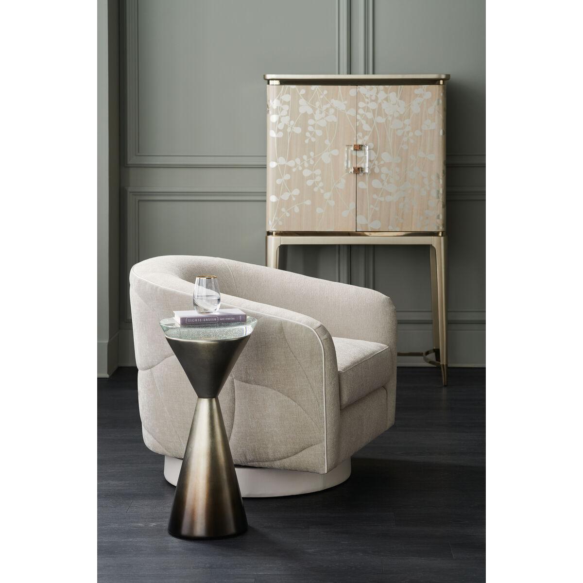 Bold and bubbly, this artful accent table delights the eye with its alluring design. A substantial, bevel-cut top in cast bubble glass adds sparkle to a reimagined, hourglass-shaped base, finished in a mix of shimmering silver leaf finishes. Captivating in form and function, it layers in light and a cool metallic, while offering the perfect place for a chilled cocktail and your favourite spy novel. Base in Oracle Leaf. Top is cast bubble glass.